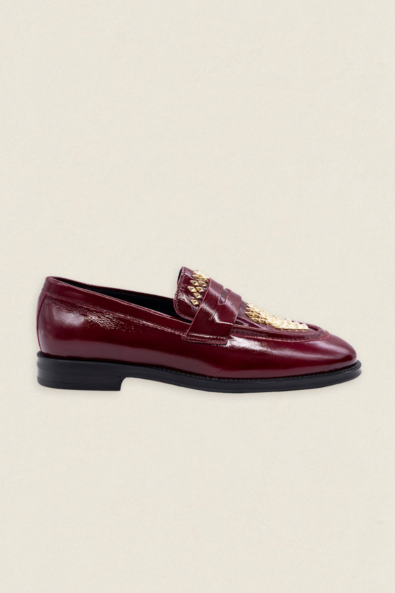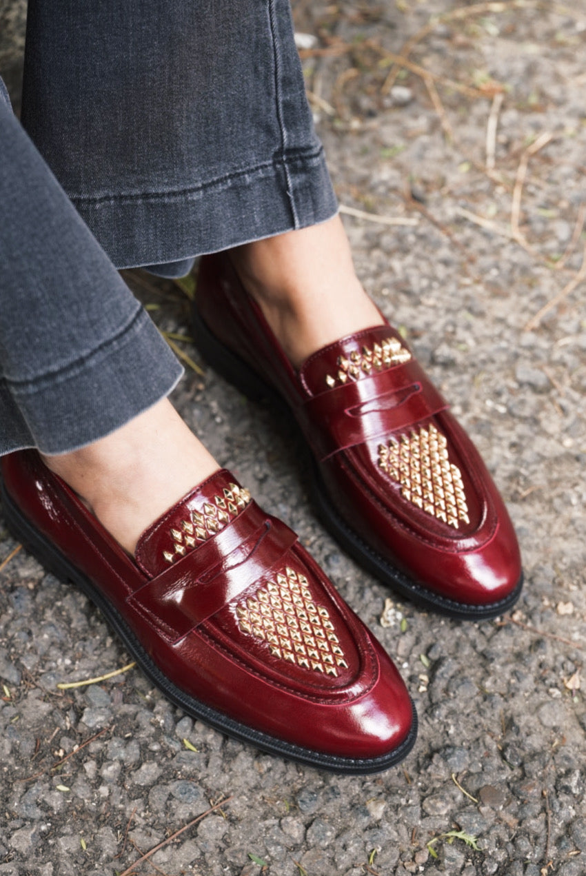 Mocasín Mimi Piel Rubino Tachuela Dorada