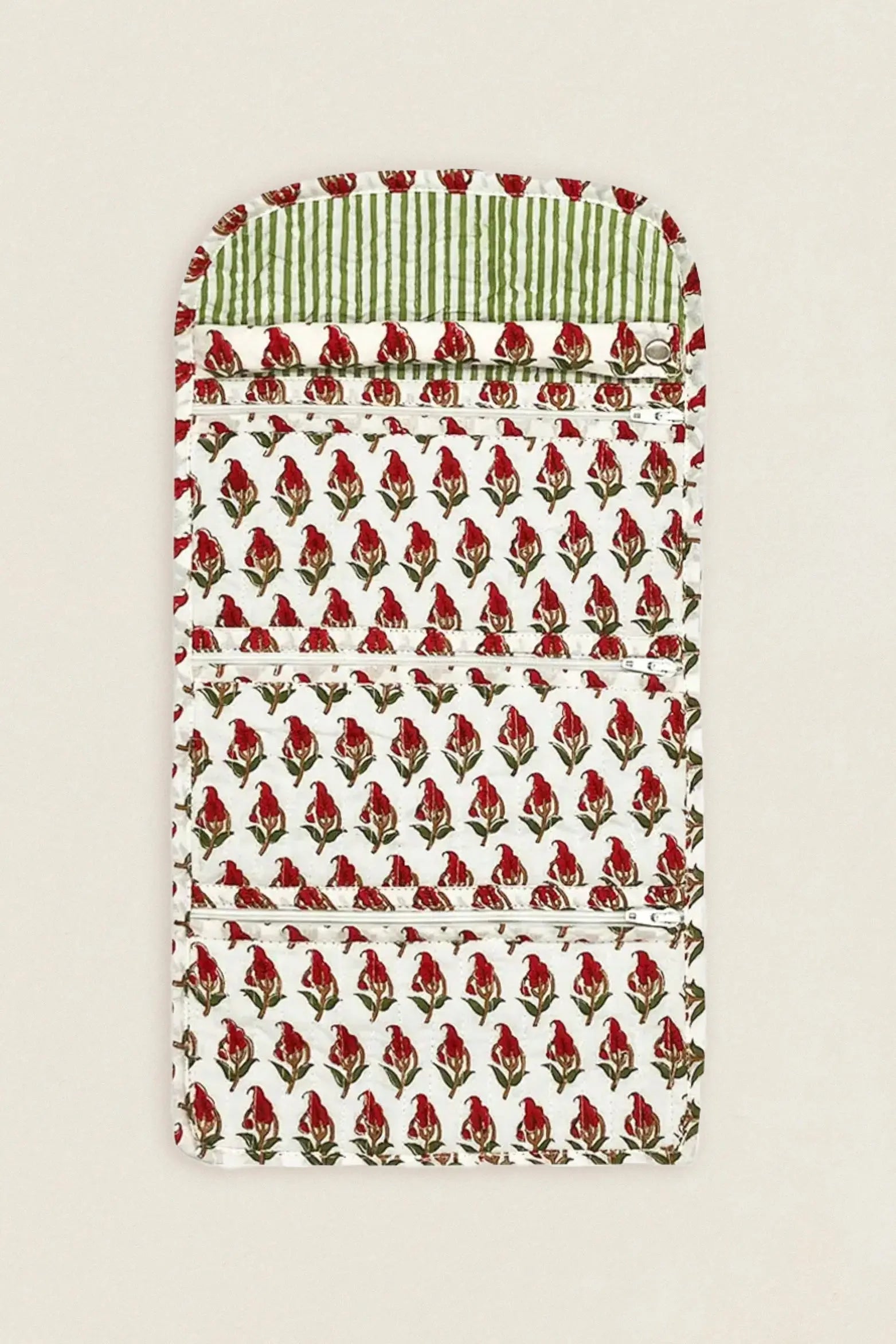 Cotton travel jewelry case with an embroidered print. It has a drawstring closure, three interior zippered pockets, and a ring holder.