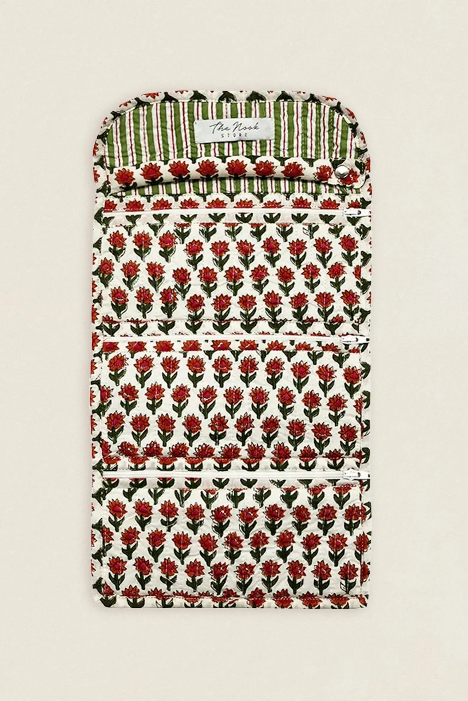 Cotton travel jewelry case with an embroidered print. It has a drawstring closure, three interior zippered pockets, and a ring holder.