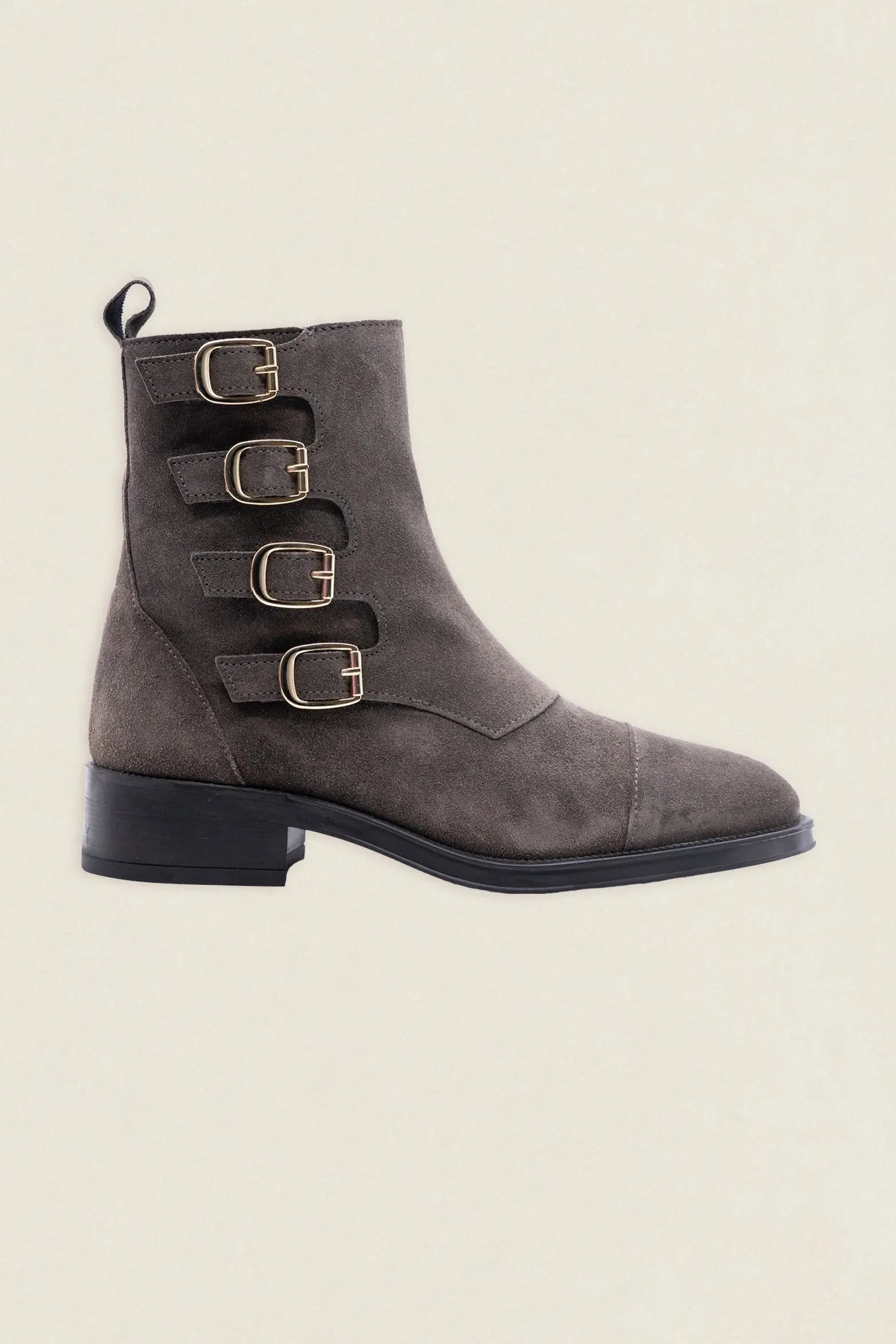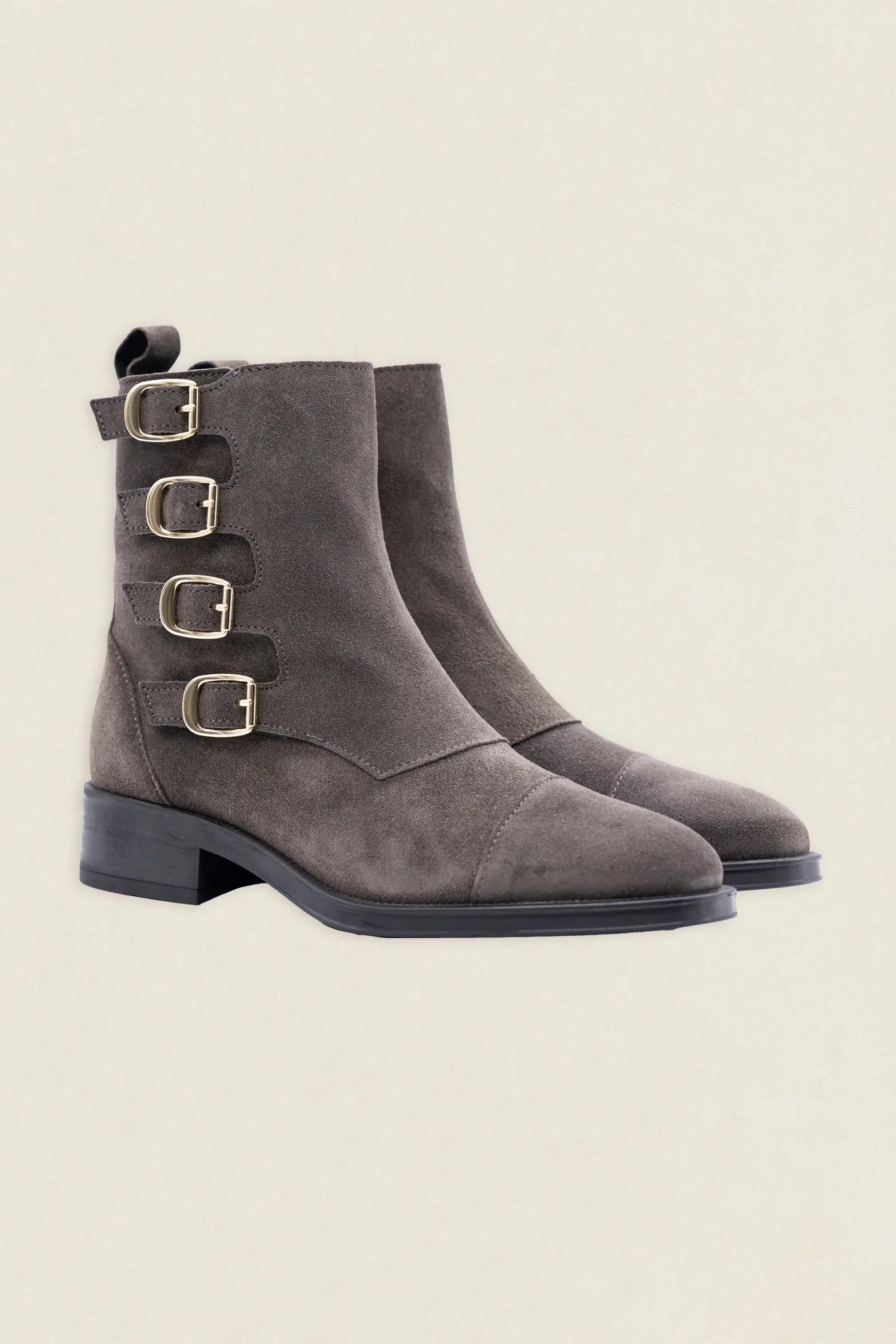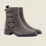 These grey suede boots stand out for their unique design with four metal buckles , which give them a modern and casual look.