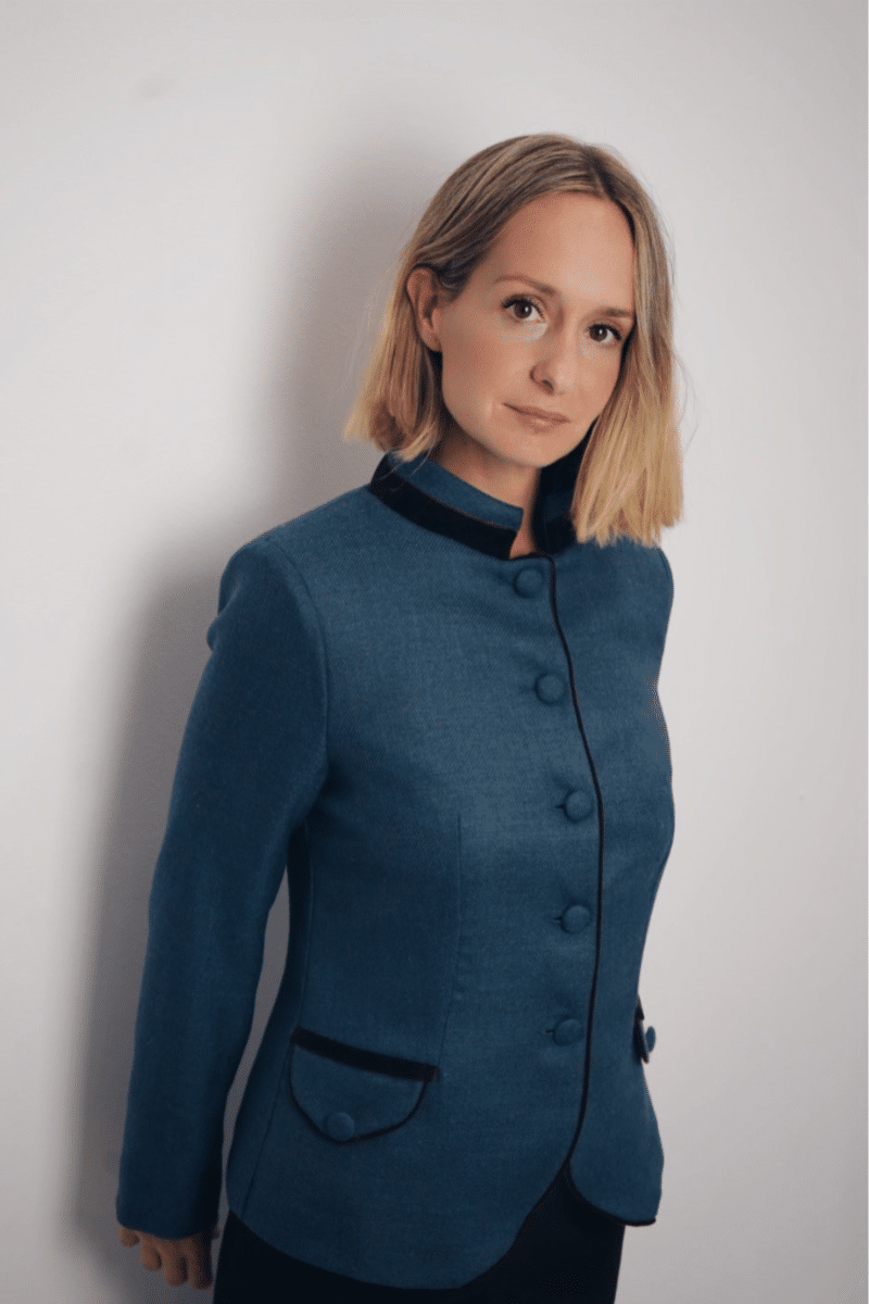 Chaqueta de lana abotonada por delante. Cuenta con dos bolsillos delanteros inferiores también abotonados. Tiene franjas decorativas de terciopelo en cuello, bolsillos y borde del cierre.