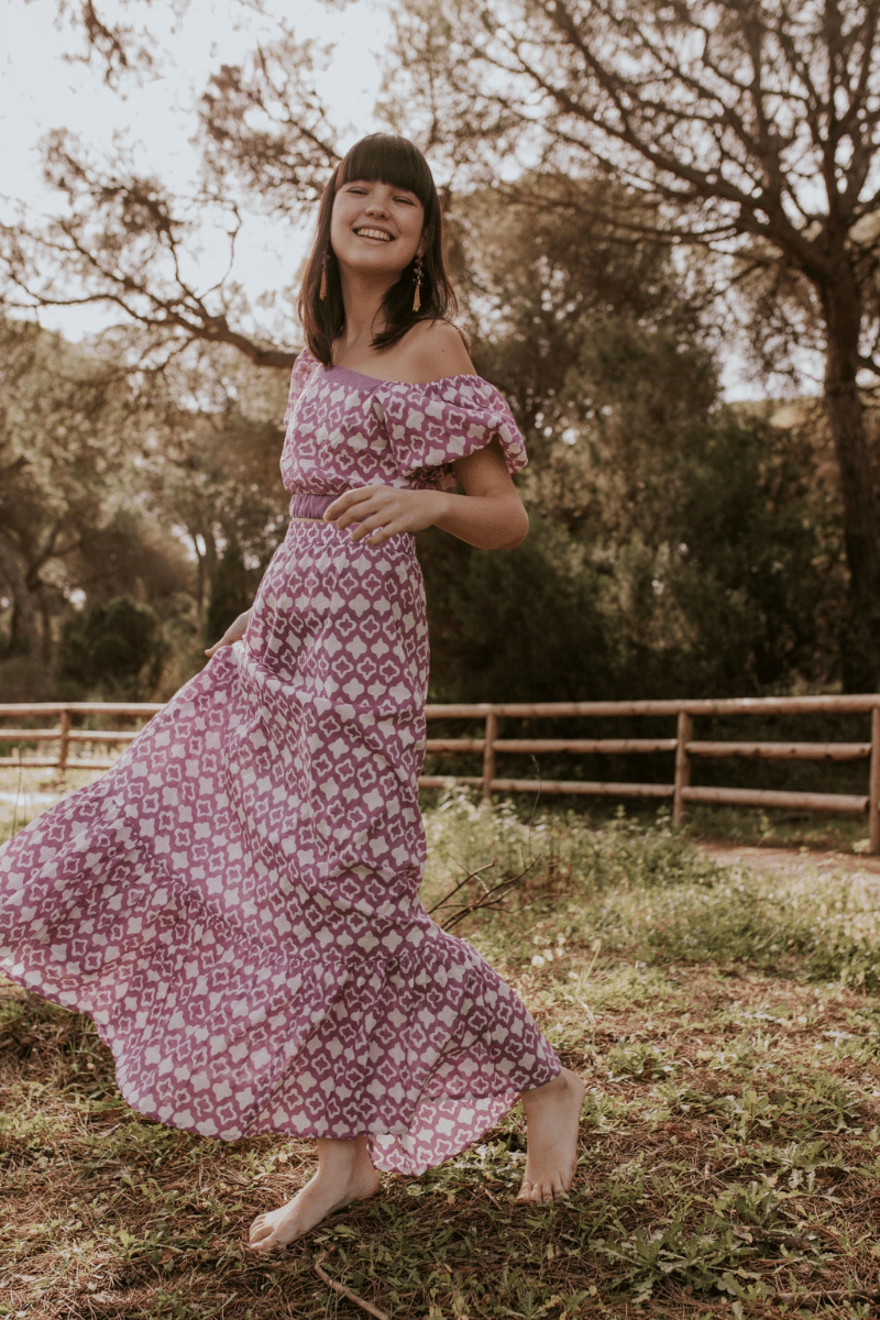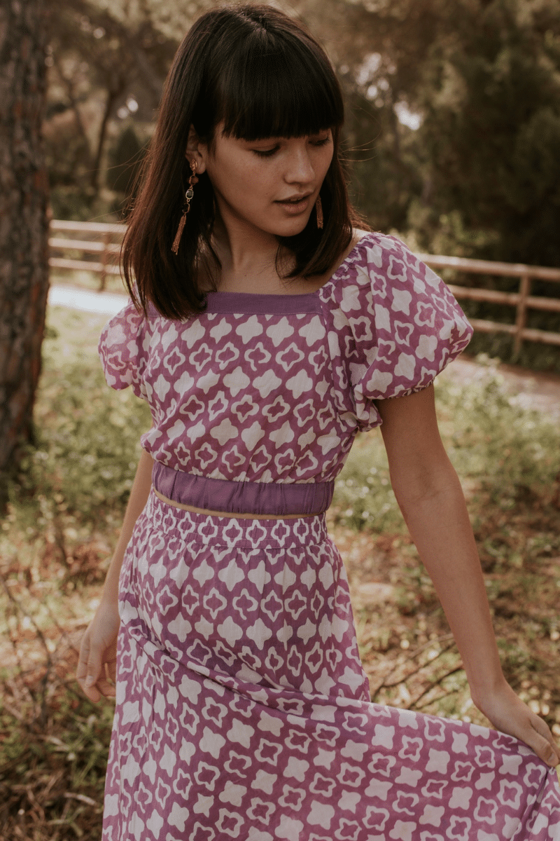 Una blusa de manga corta tejido ligero y fresco, de algodón a juego con una falda fluida.