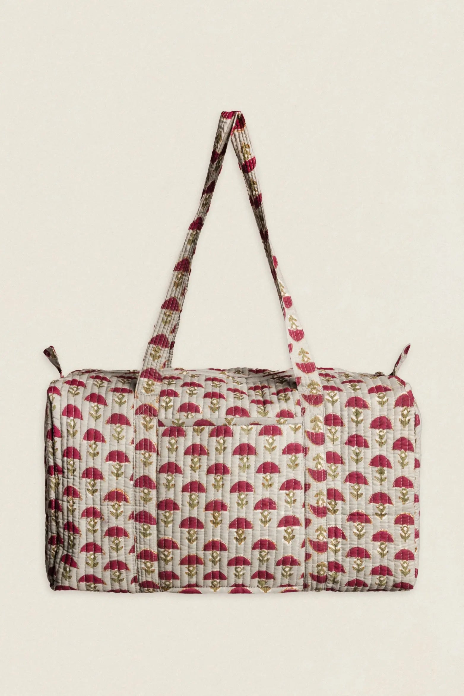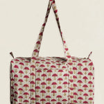 Printed cotton travel suitcase. Top zip closure and two top handles. Features one open exterior pocket and one zip interior pocket.