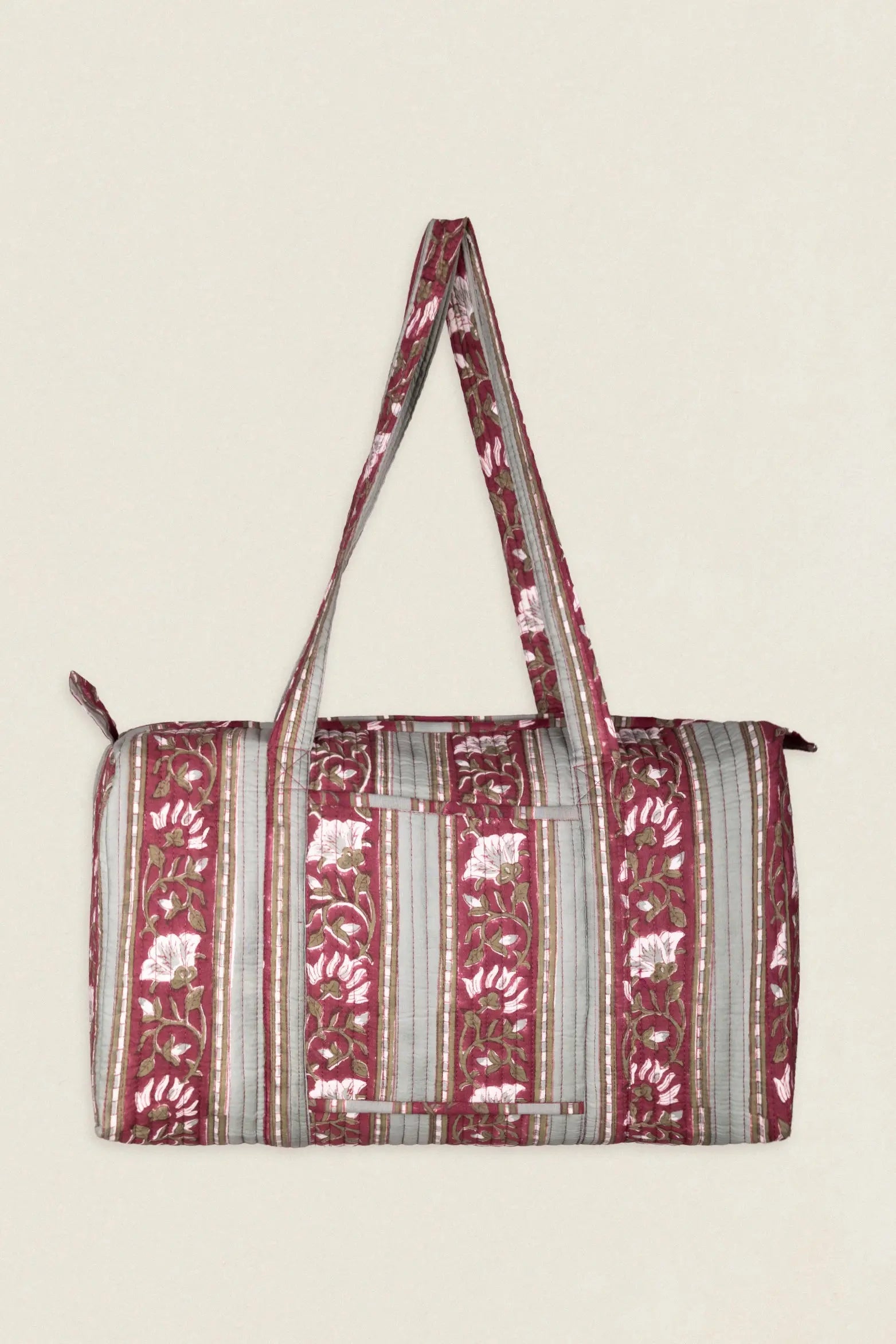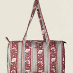 Printed cotton travel suitcase. Top zip closure and two top handles. Features one open exterior pocket and one zip interior pocket.