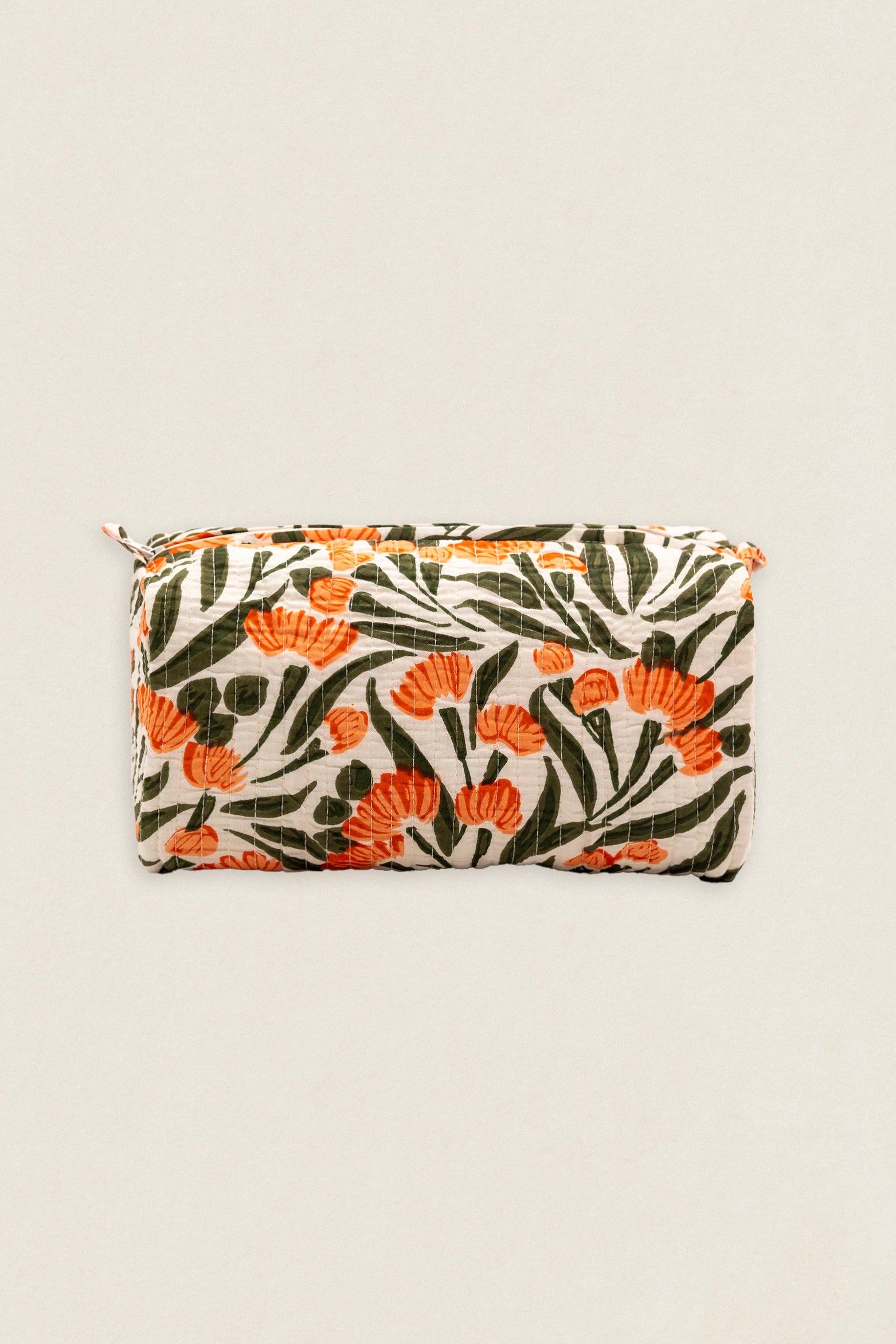 Neceser de algodón estampado con forro interior plastificado con 4 bolsillos interiores. Cierre superior con cremallera.