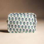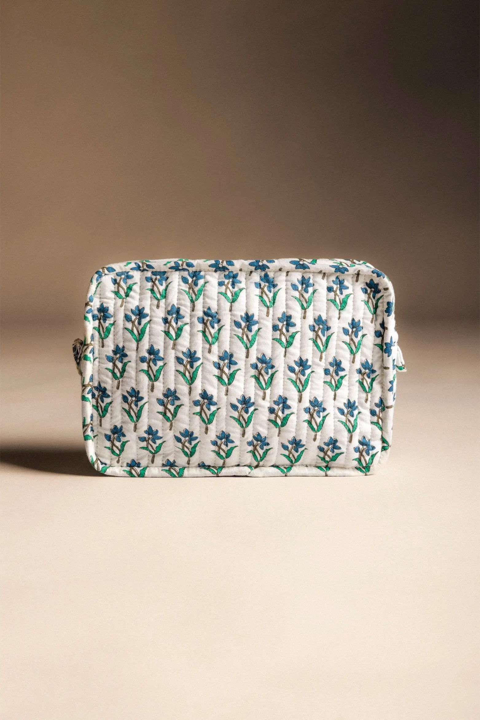 Printed cotton toiletry bag with a laminated interior lining and four interior pockets. Zip top closure.