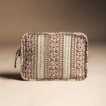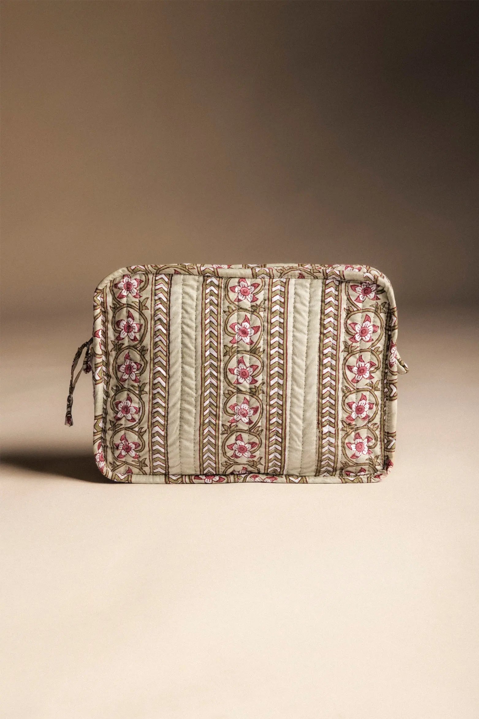 Printed cotton toiletry bag with a laminated interior lining and four interior pockets. Zip top closure.