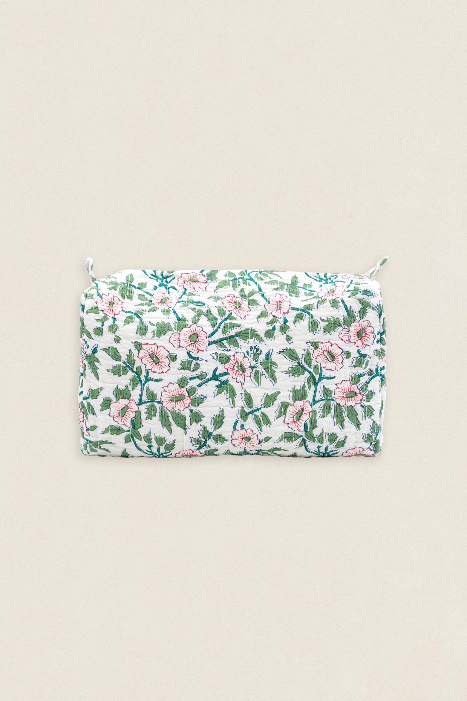 Neceser de algodón estampado con forro interior plastificado con 4 bolsillos interiores. Cierre superior con cremallera.