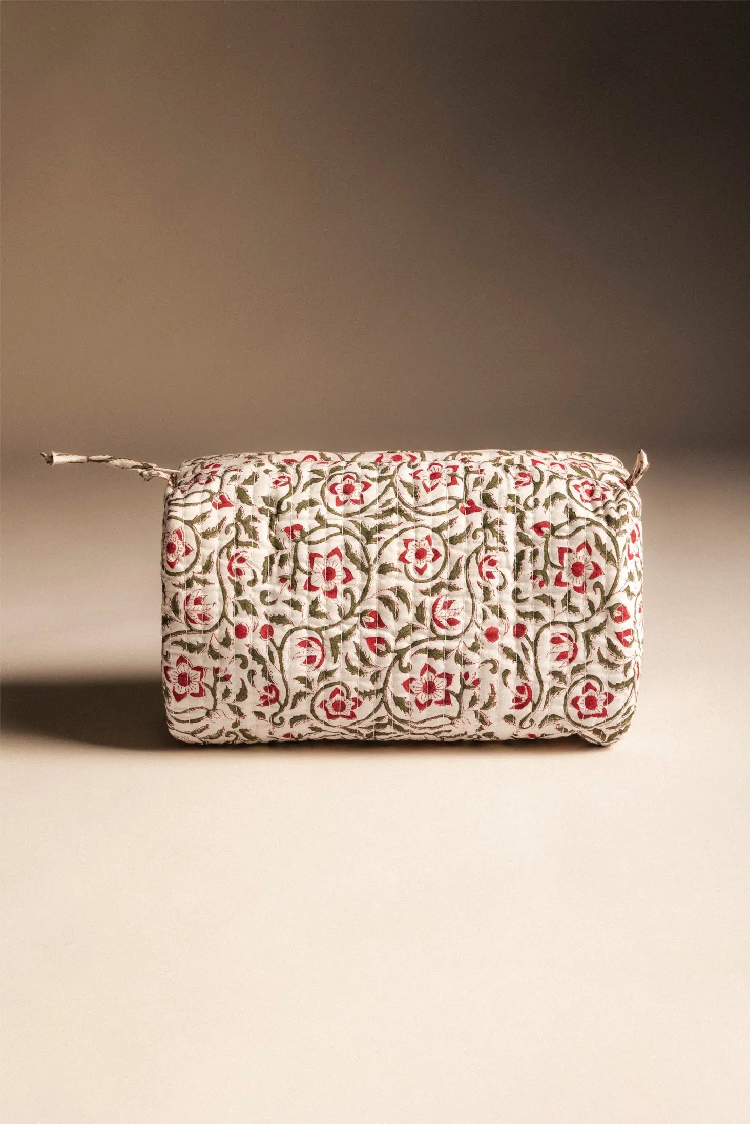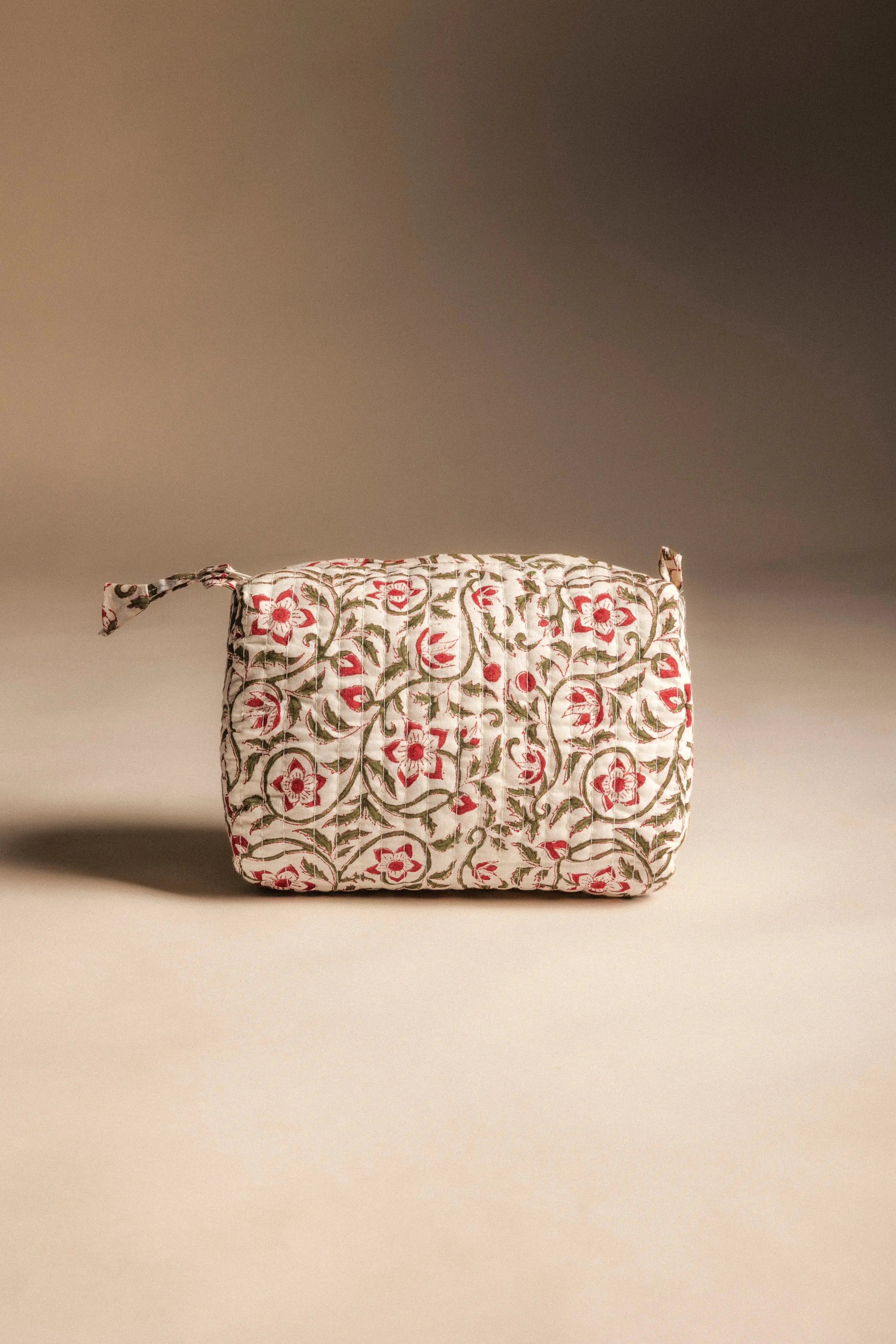 Printed cotton toiletry bag with plasticized lining and 4 interior pockets. Top zip closure.
