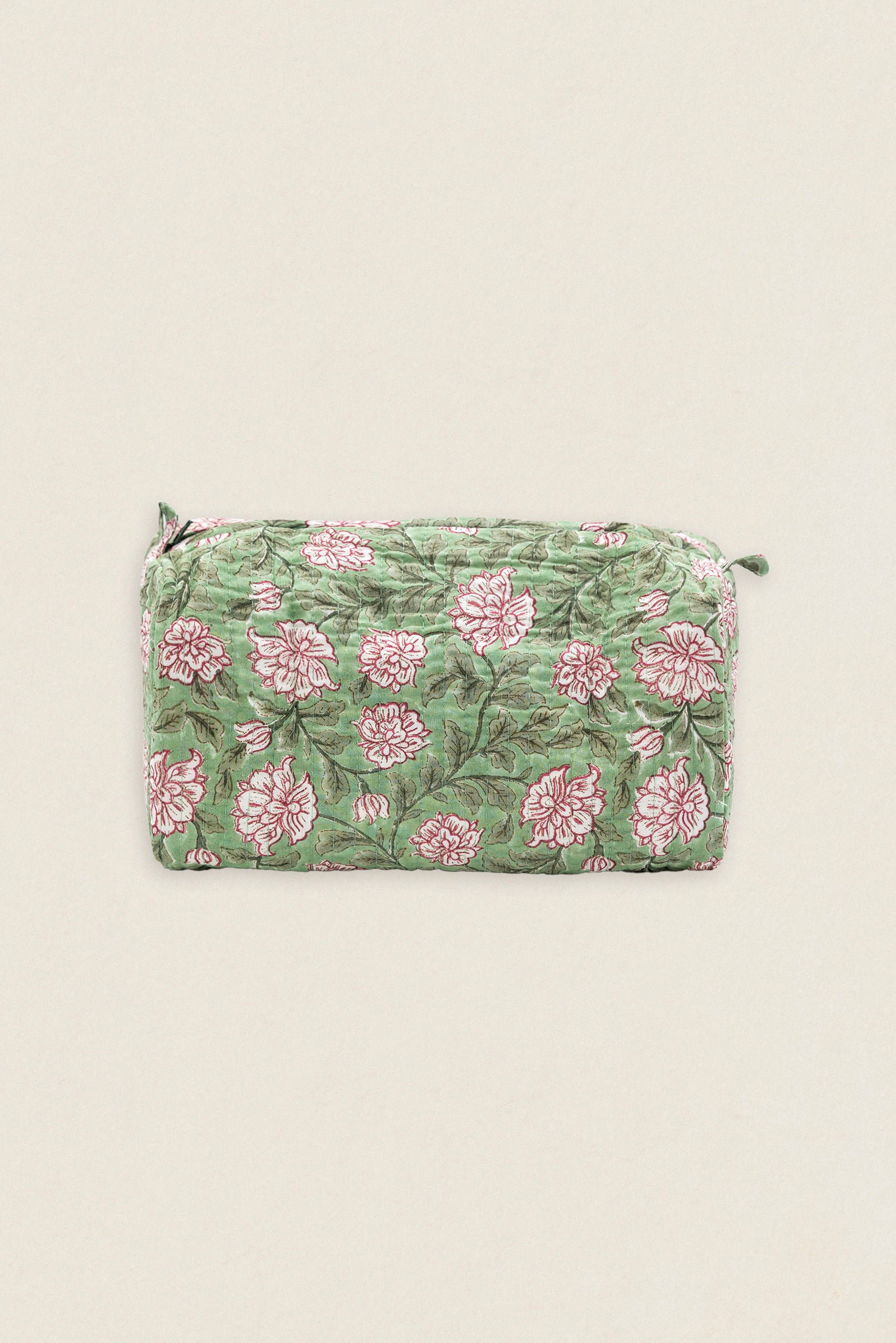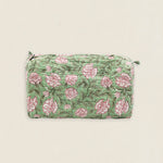 Neceser de algodón estampado con forro interior plastificado con 4 bolsillos interiores. Cierre superior con cremallera.