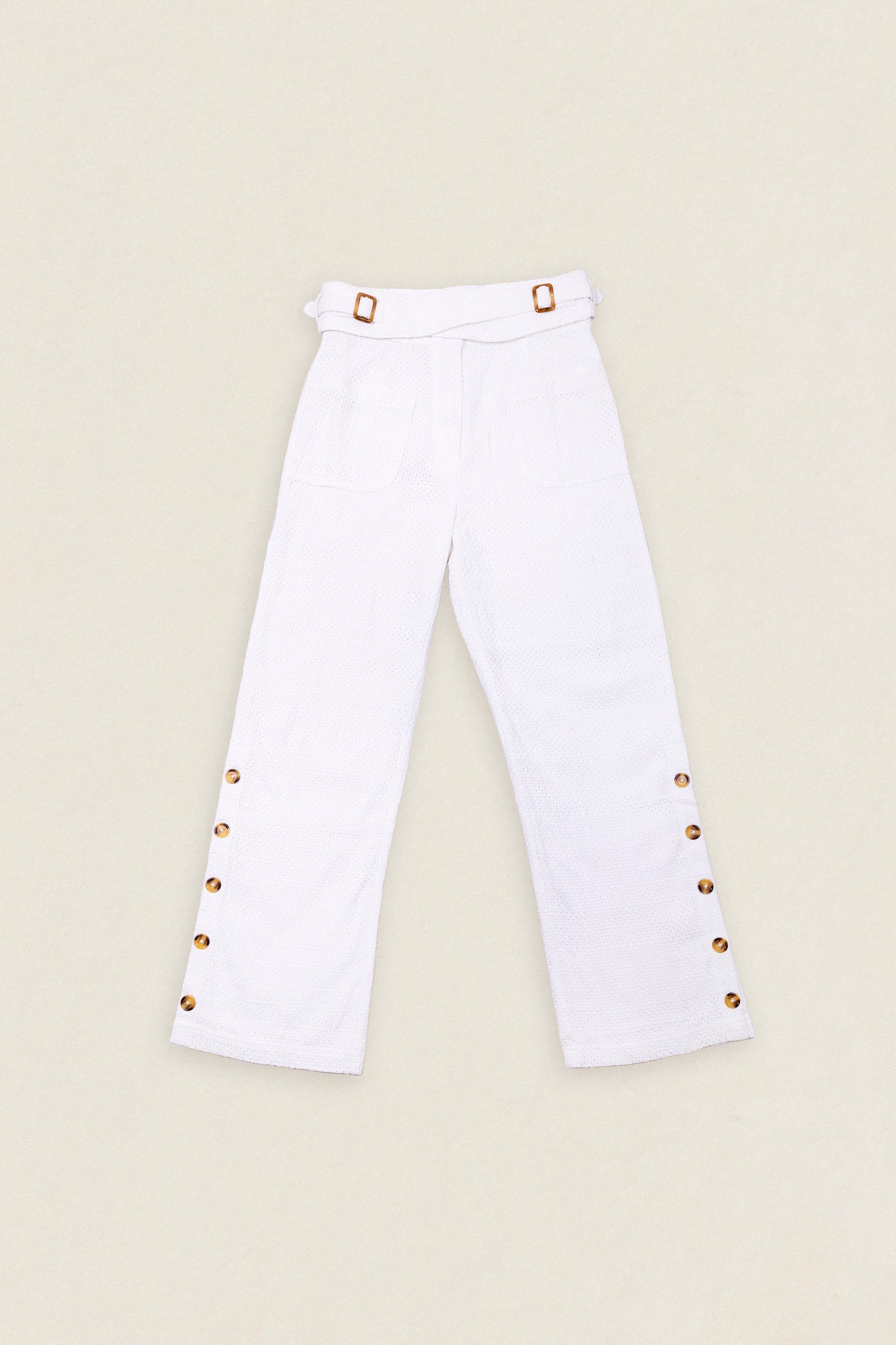Este pantalón de silueta reta y caída fluida tiene una cremallera frontal a modo de cierre. También cuenta con bolsillos delanteros y una hilera de botones decorativos en la parte inferior del pantalón. Además, el cinturón adaptable permite un ajuste personalizado.