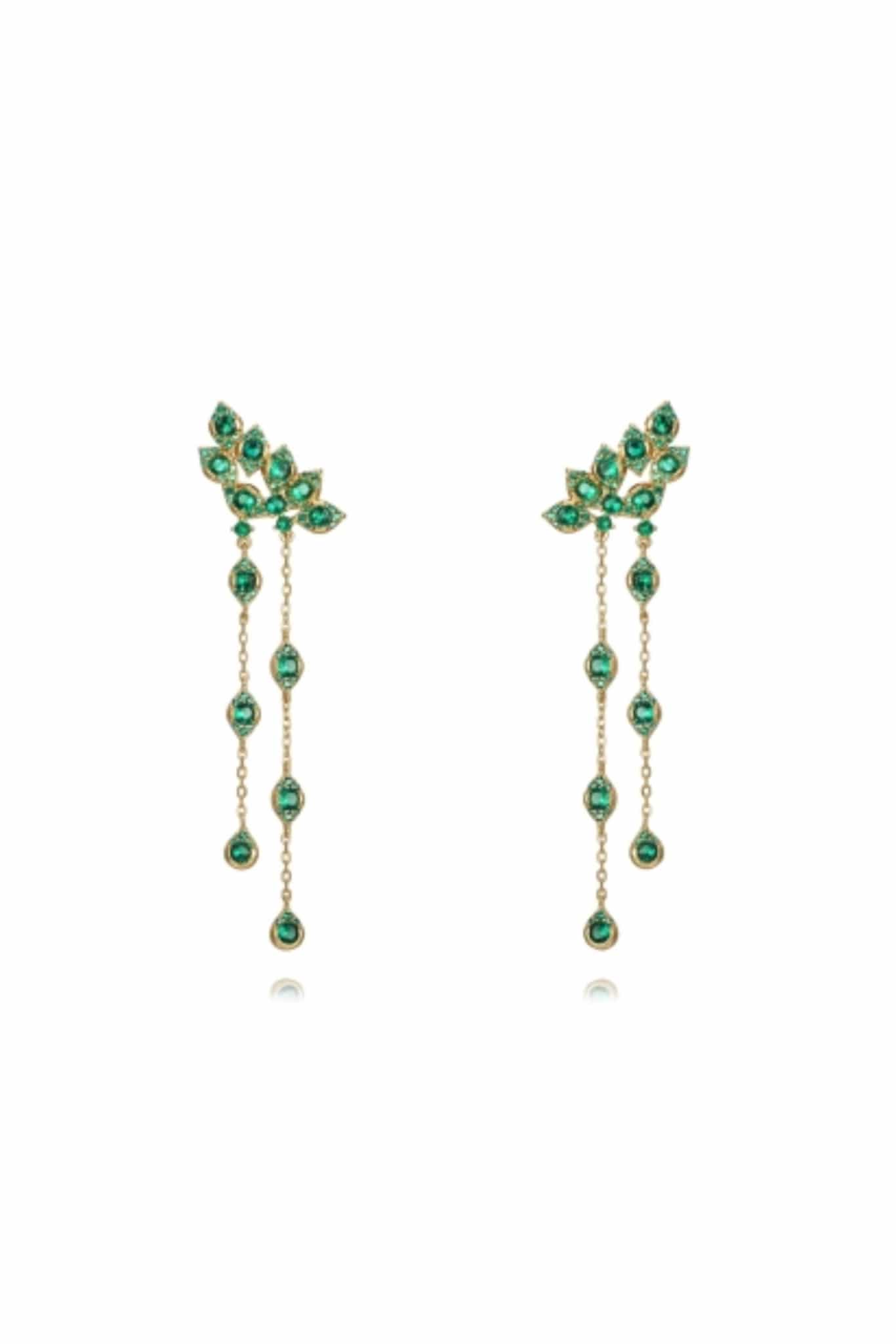Un par de pendientes largos en forma de hoja con circonitas y colgantes de cadena, realizados en plata de ley 925 disponible en acabado chapado en oro y acabado en rodio.