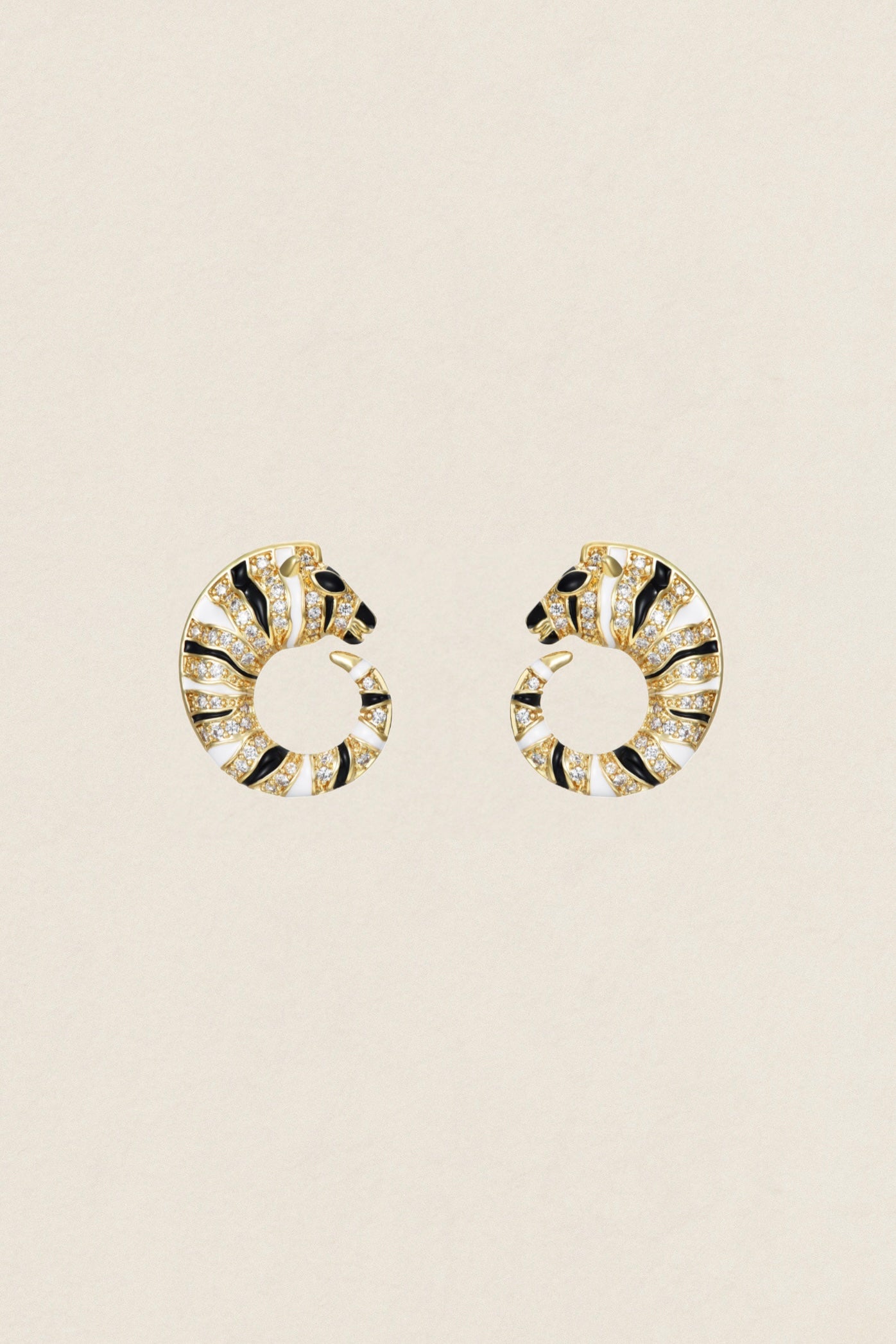 Un par de pendientes de circonitas en forma de cebra fabricados en plata de ley 925 disponibles en acabado bañado en oro.