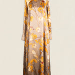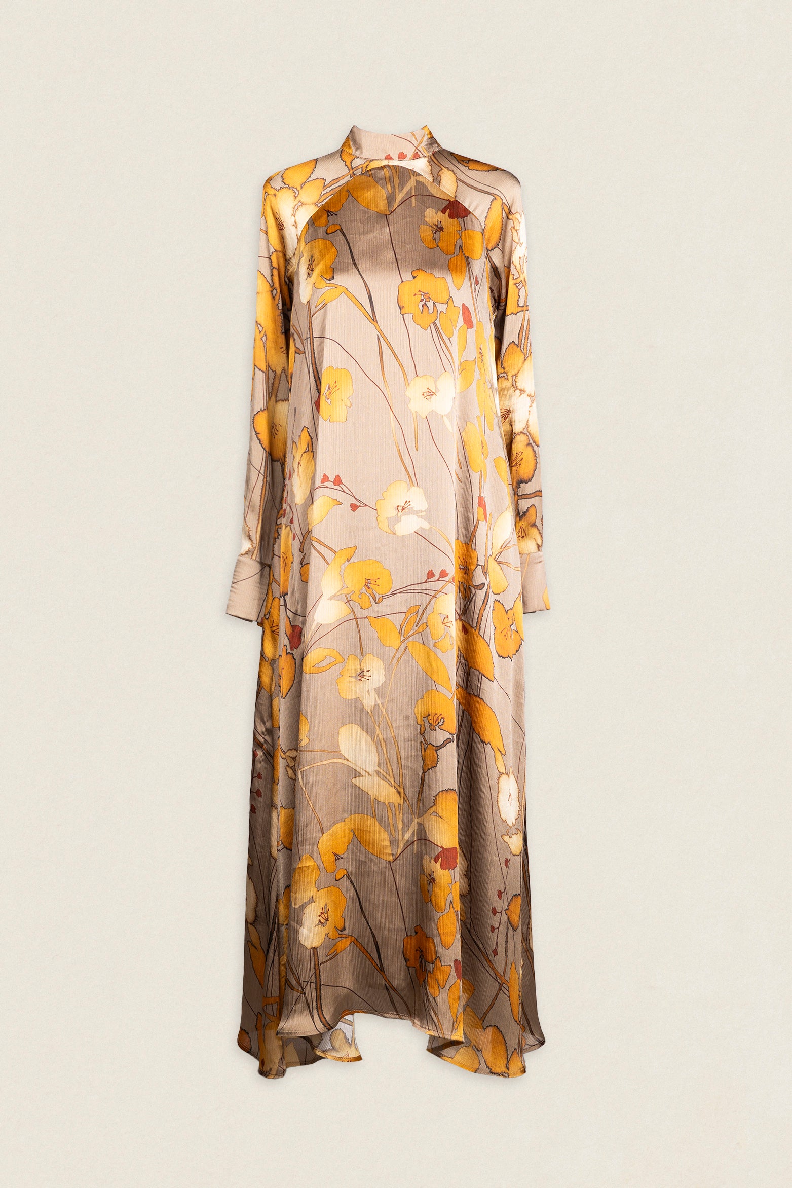 Confeccionado en gasa ligera de largo midi, destaca por su estampado de flores y su elegante cuello halter anudado al cuello, que aporta un aire sofisticado y femenino.
