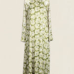 Confeccionado en gasa ligera de largo midi, destaca por su estampado de flores y su elegante cuello halter anudado al cuello, que aporta un aire sofisticado y femenino.