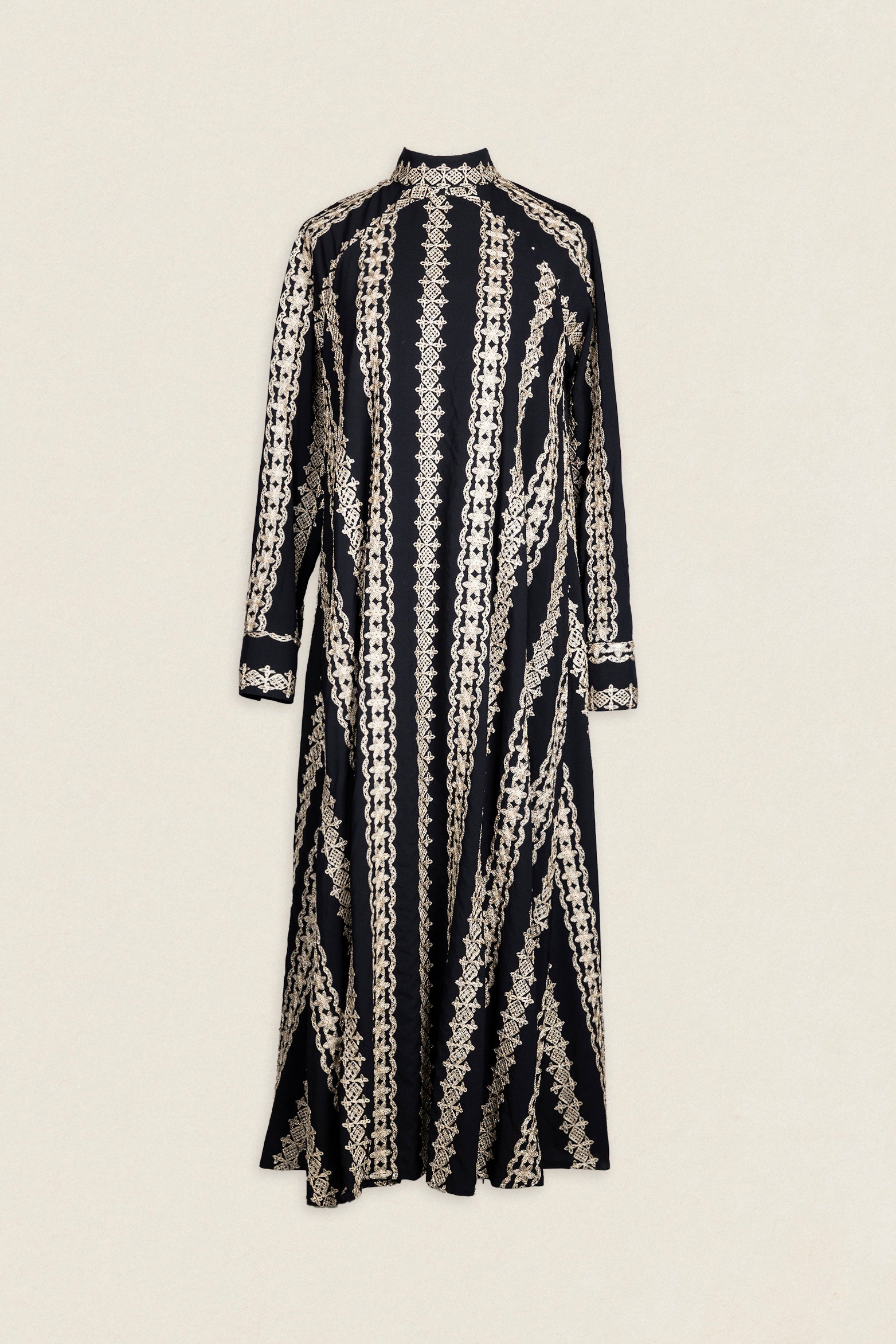 Confeccionado en gasa ligera de largo midi, destaca por su estampado de flores y su elegante cuello halter anudado al cuello, que aporta un aire sofisticado y femenino.
