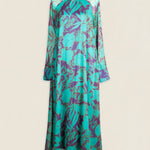 Confeccionado en gasa ligera de largo midi, destaca por su estampado de flores y su elegante cuello halter anudado al cuello, que aporta un aire sofisticado y femenino.