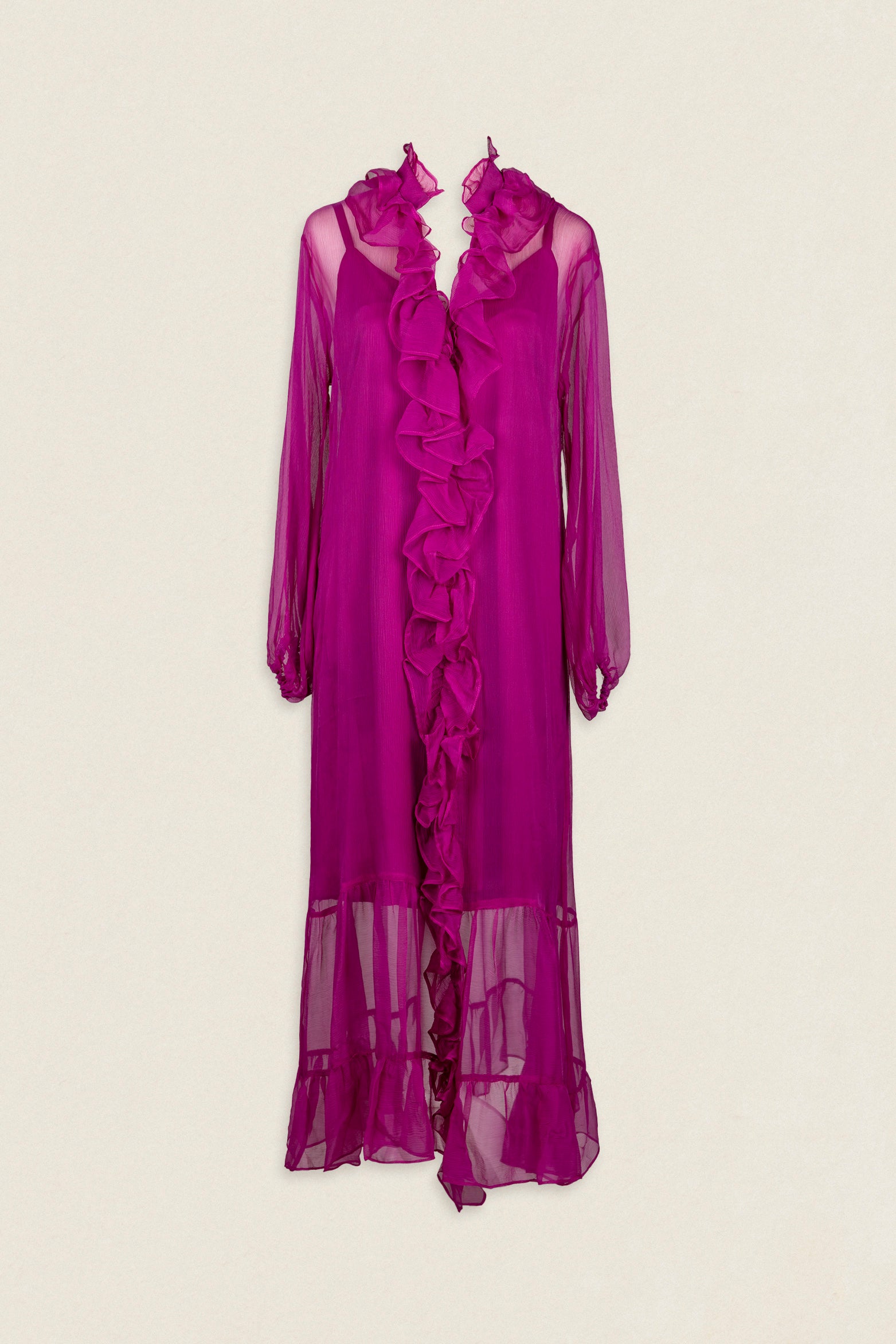 Su silueta fluida está realzada por un delicado volante en el bajo y dos volantes que caen desde los hombros recorriendo el escote hasta la parte inferior, aportando un aire romántico y muy especial.