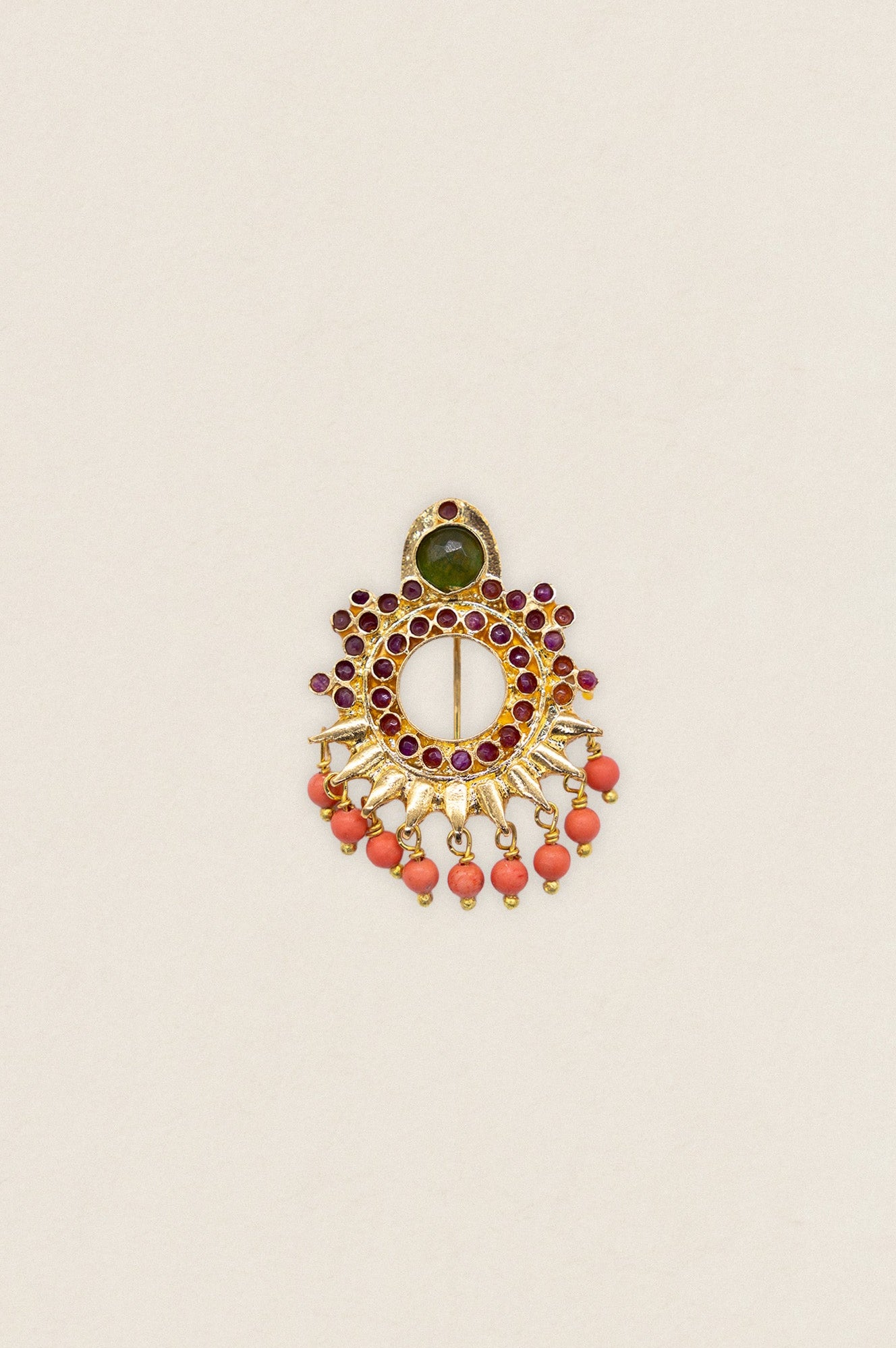 Nuestro broche Filippa está elaborado en bronce chapado en oro de 18 kilates y destaca por su diseño en forma de flor, delicado y atemporal. Las piedras naturales que lo componen aportan color, luz y un acabado único a cada pieza.