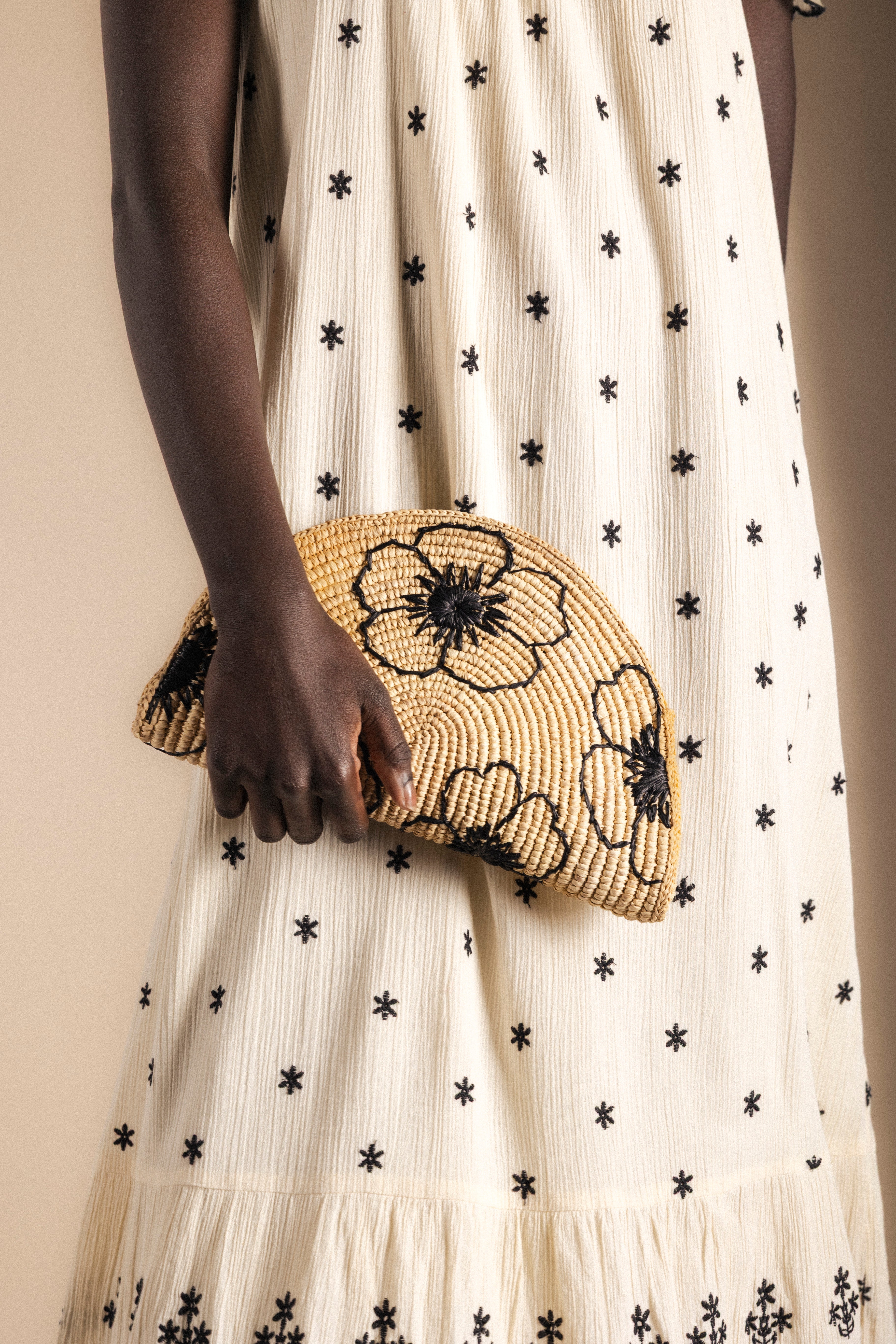 El clutch Coralie de rafia bordado es una pieza única que combina la naturalidad de los materiales con el detalle artesanal. Con una elegante base en forma de abanico y confeccionado en rafia en tono beige natural, destaca por sus delicados bordados florales que aportan textura y personalidad.