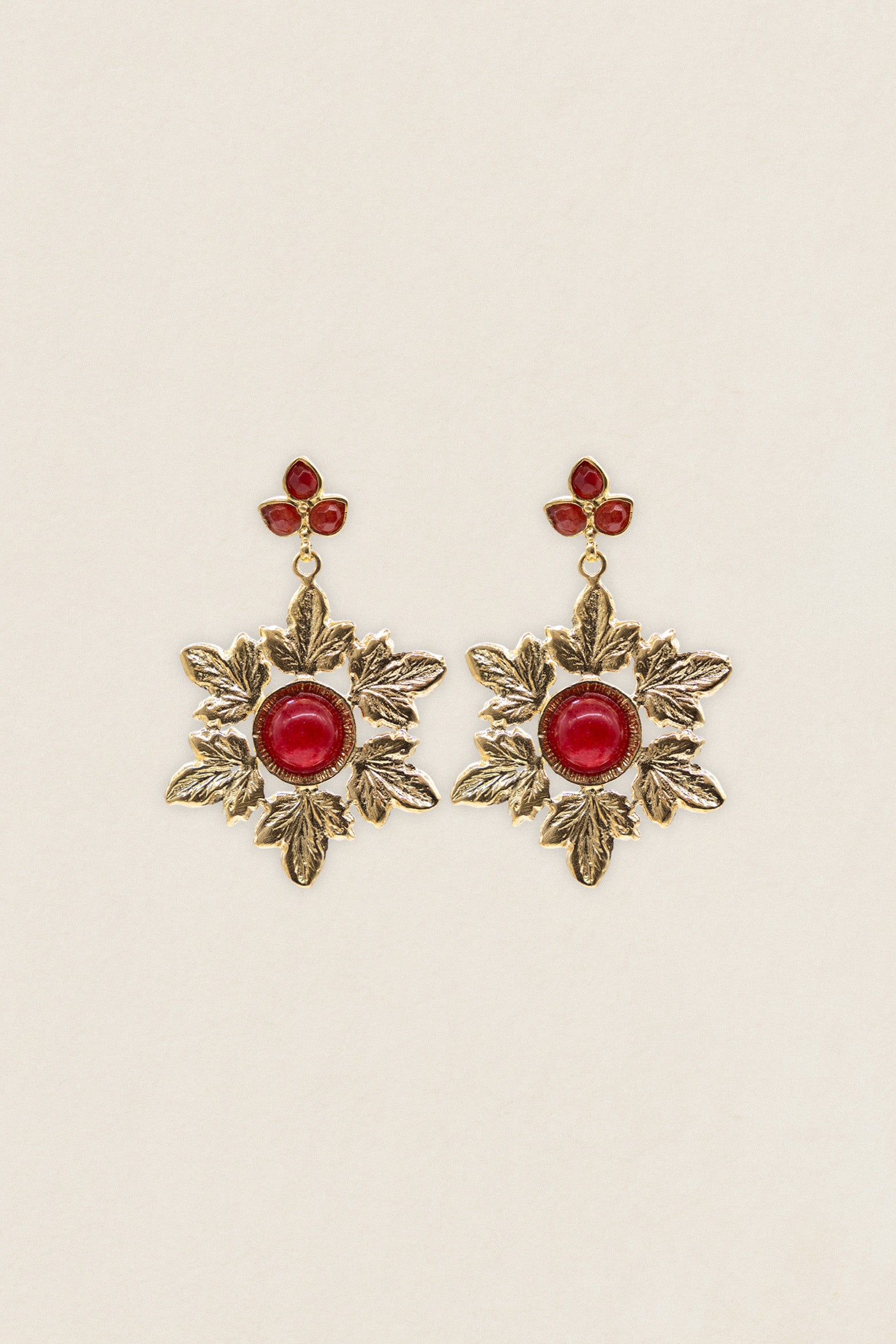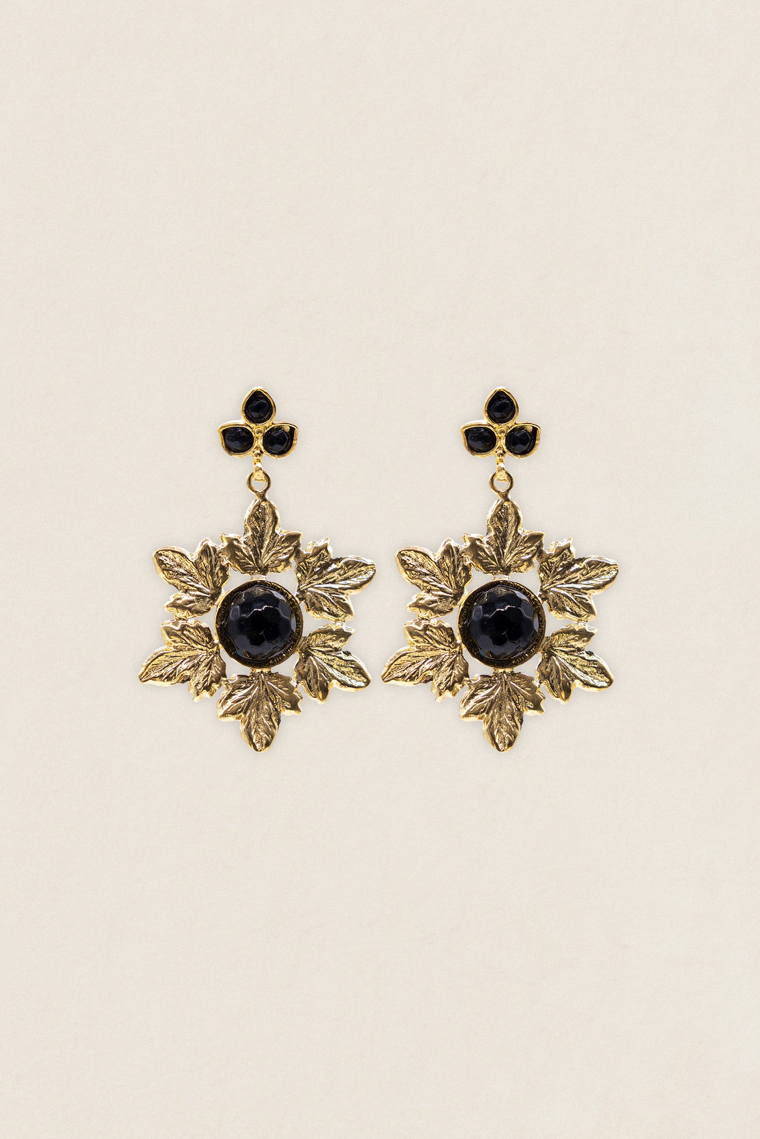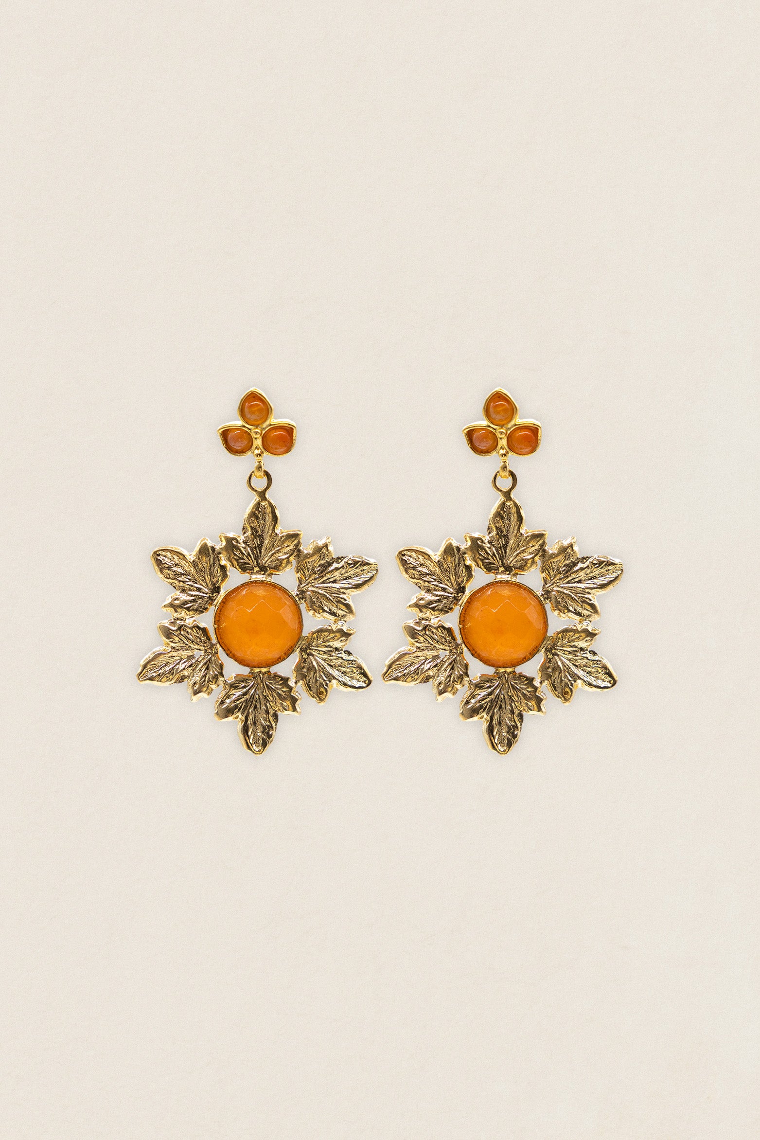 Presentan una elegante corona de hojas que enmarca un círculo central con piedra natural, aportando equilibrio, luz y sofisticación a la pieza.