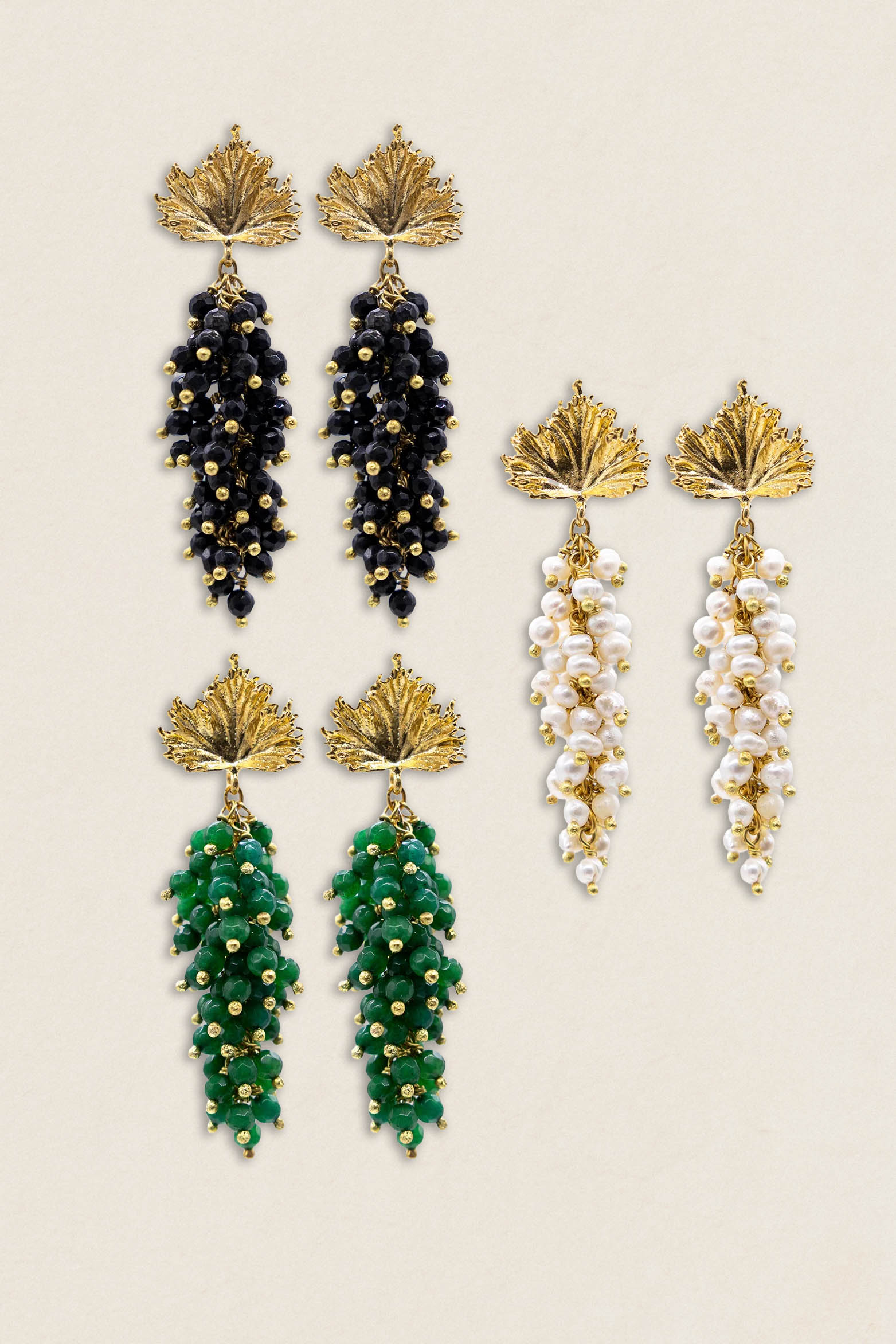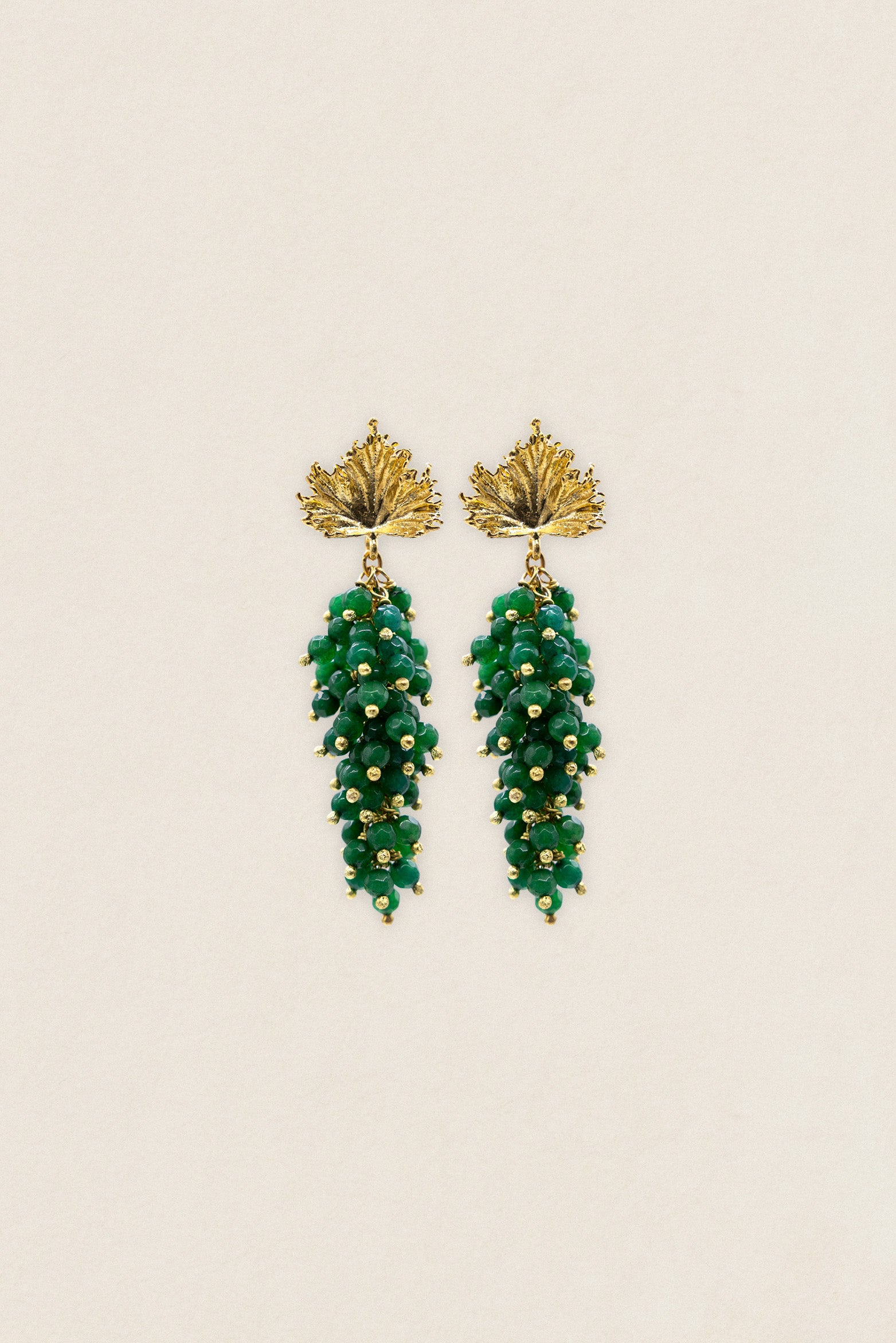 Pendientes Grapes Leave son elaborados en bronce chapado en oro de 18 Kilates. Su diseño destaca por una moneda en la parte superior, de la que caen múltiples bolitas de colores que crean un efecto de movimiento y luminosidad.