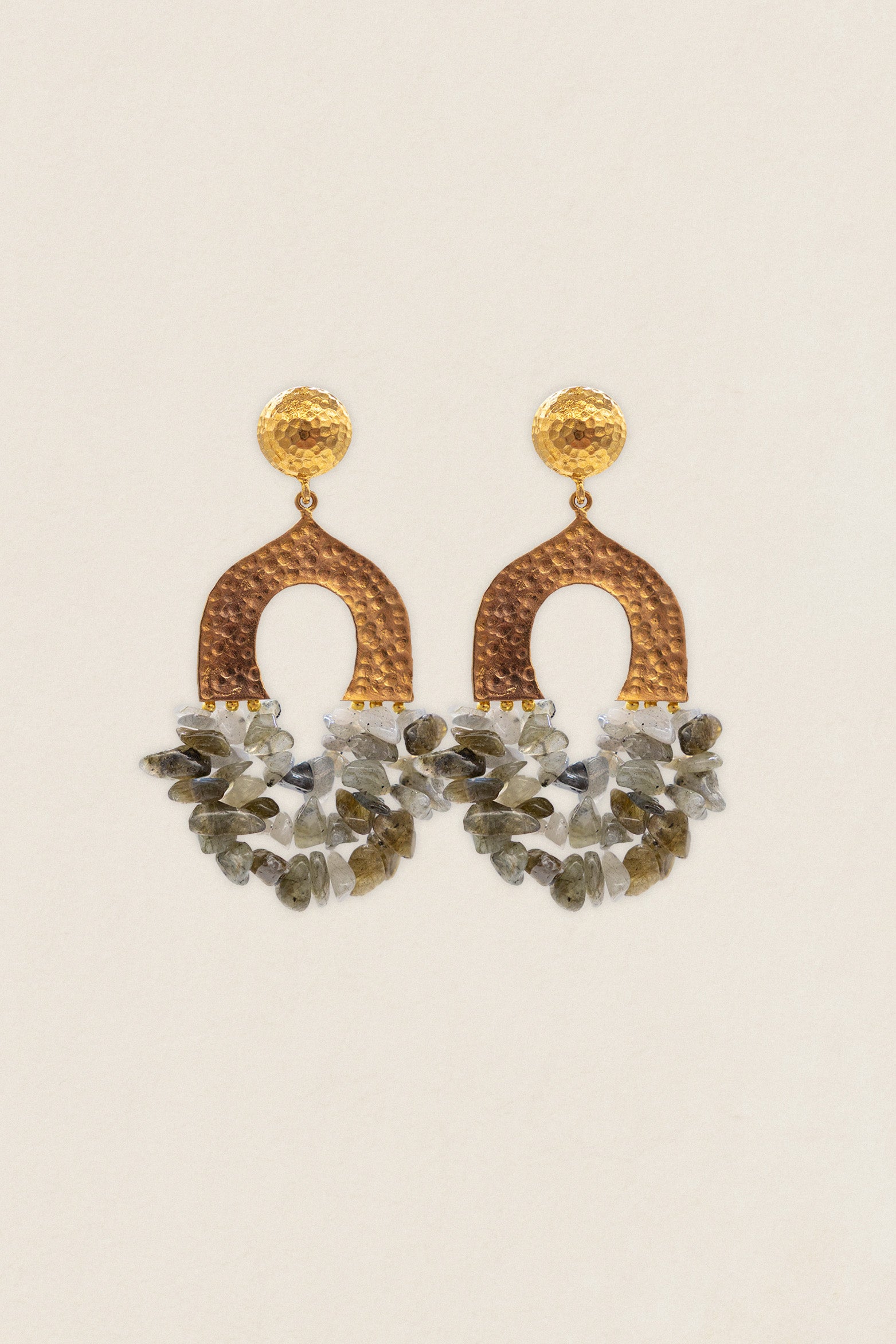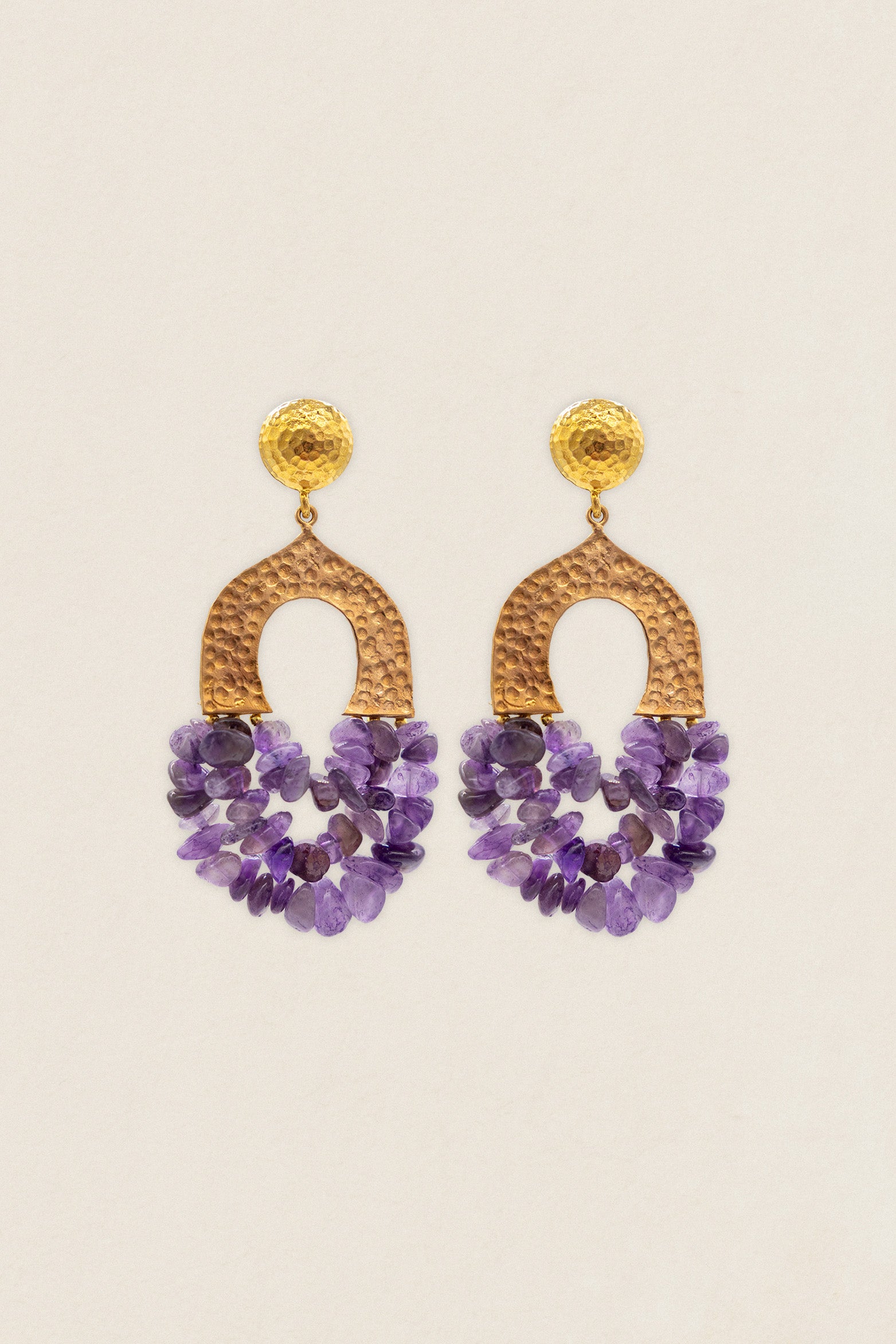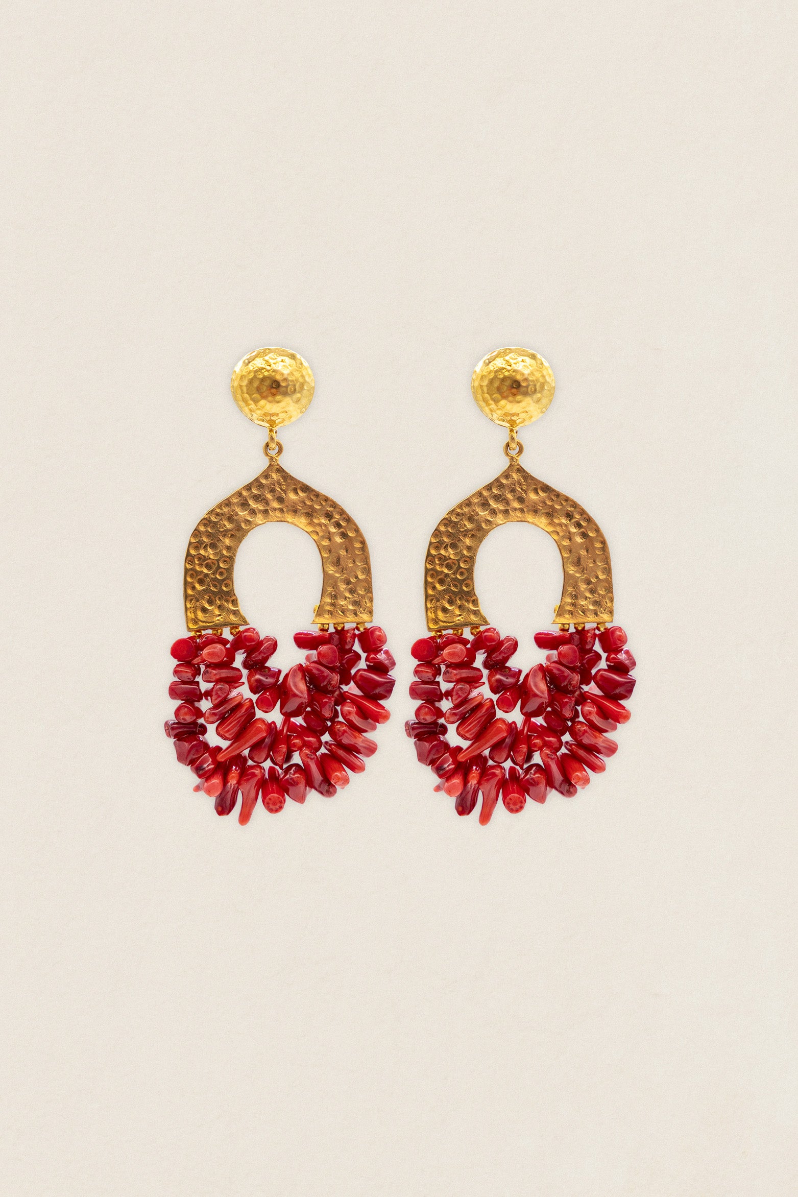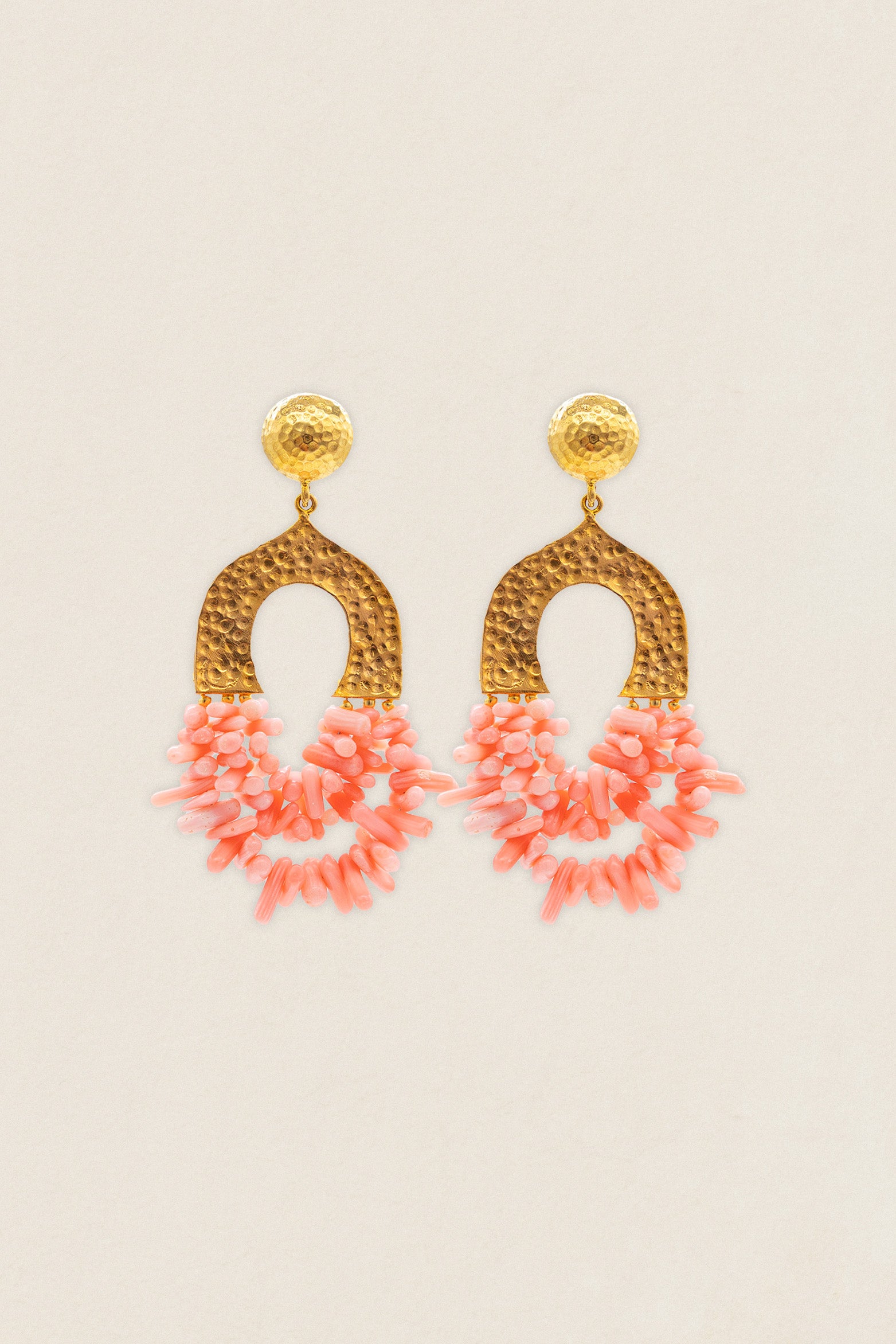Nuestros pendientes Margaret están elaborados en bronce chapado en oro y destacan por su diseño elegante y lleno de dinamismo. En ellos, el dorado del metal se combina con pequeñas bolitas de colores que forman un óvalo, creando una pieza armónica y muy favorecedora.