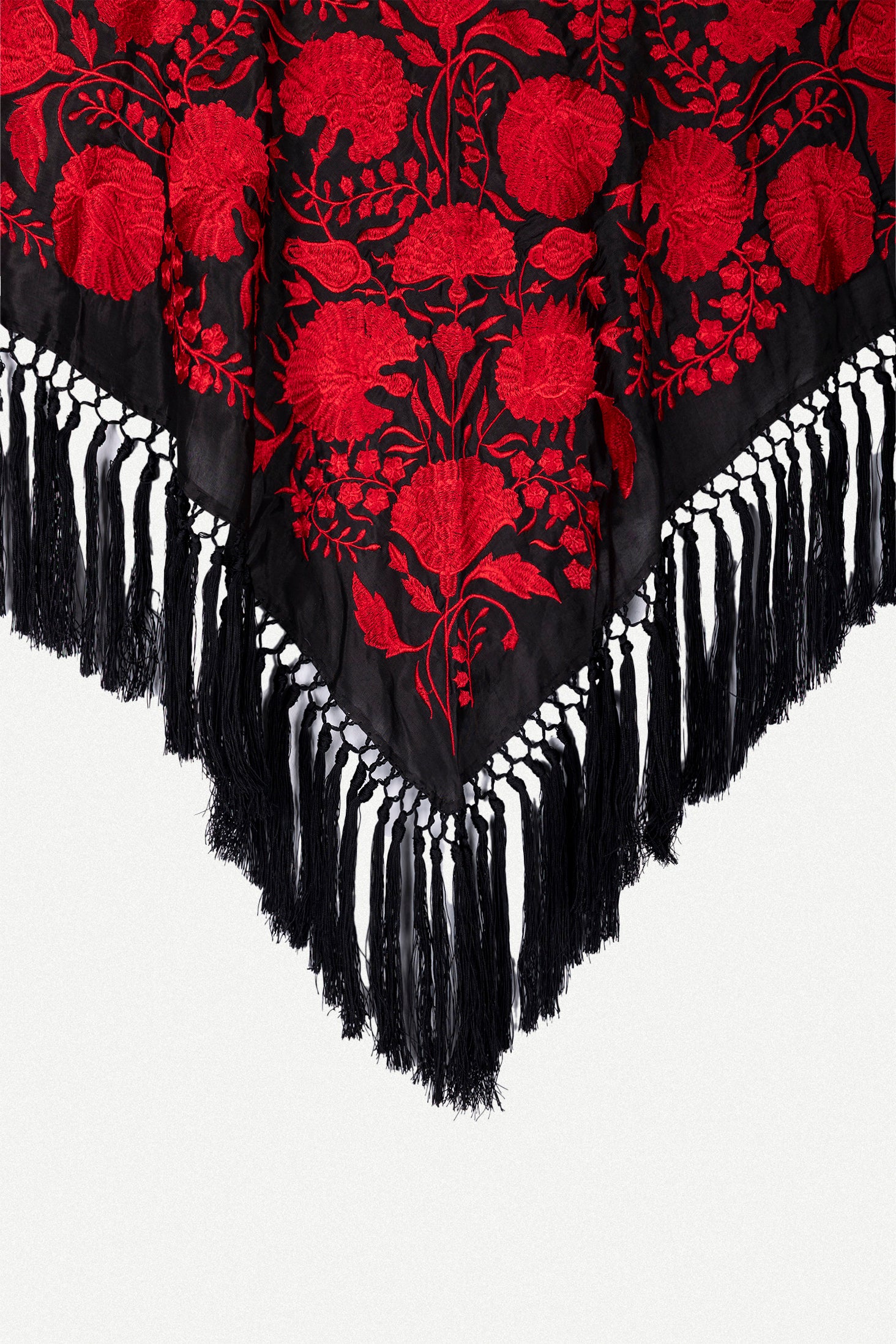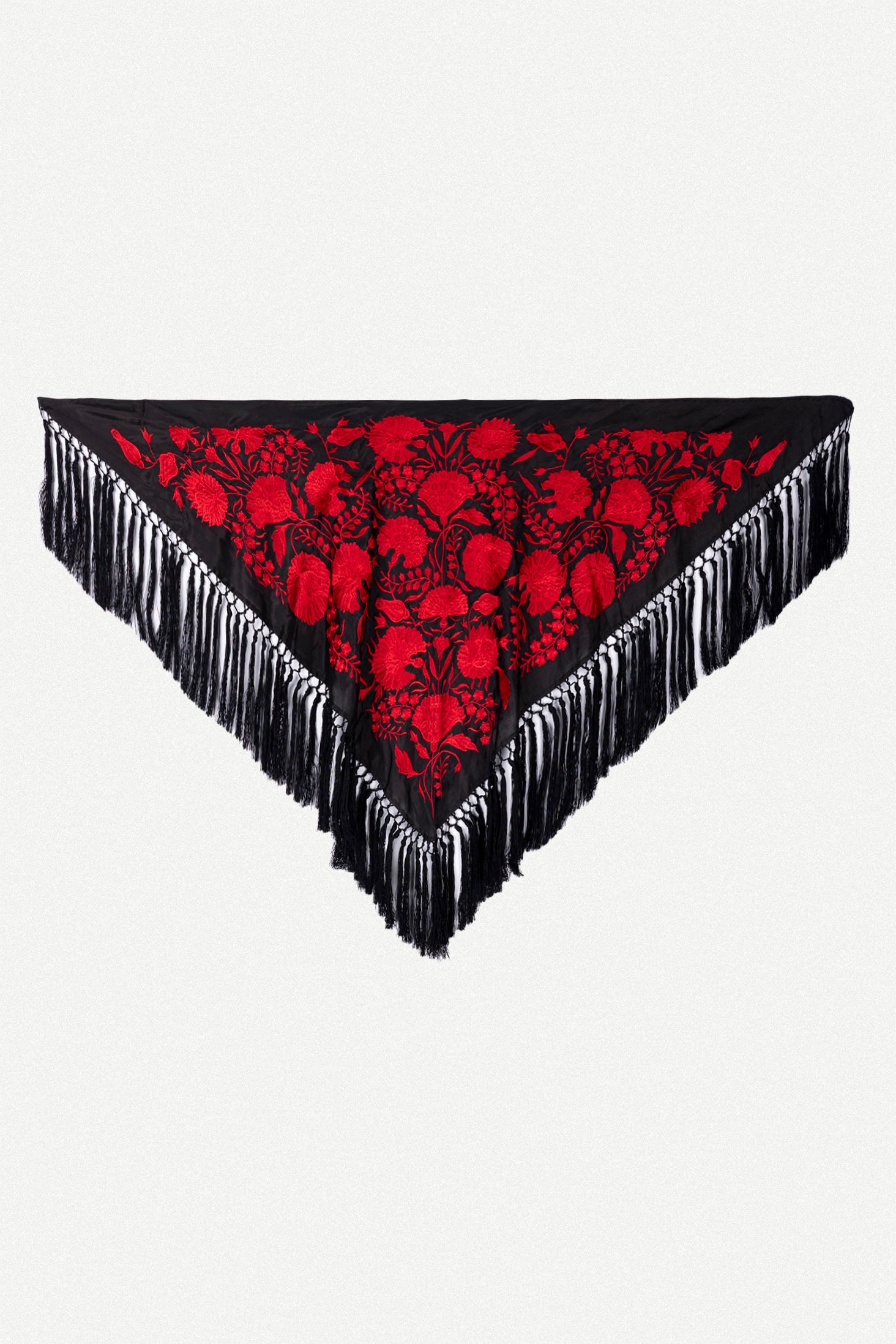 Mantoncillo de viscosa con estampado de flores bordadas en hilo de seda. Flecado a mano con flecos de hilo de seda.