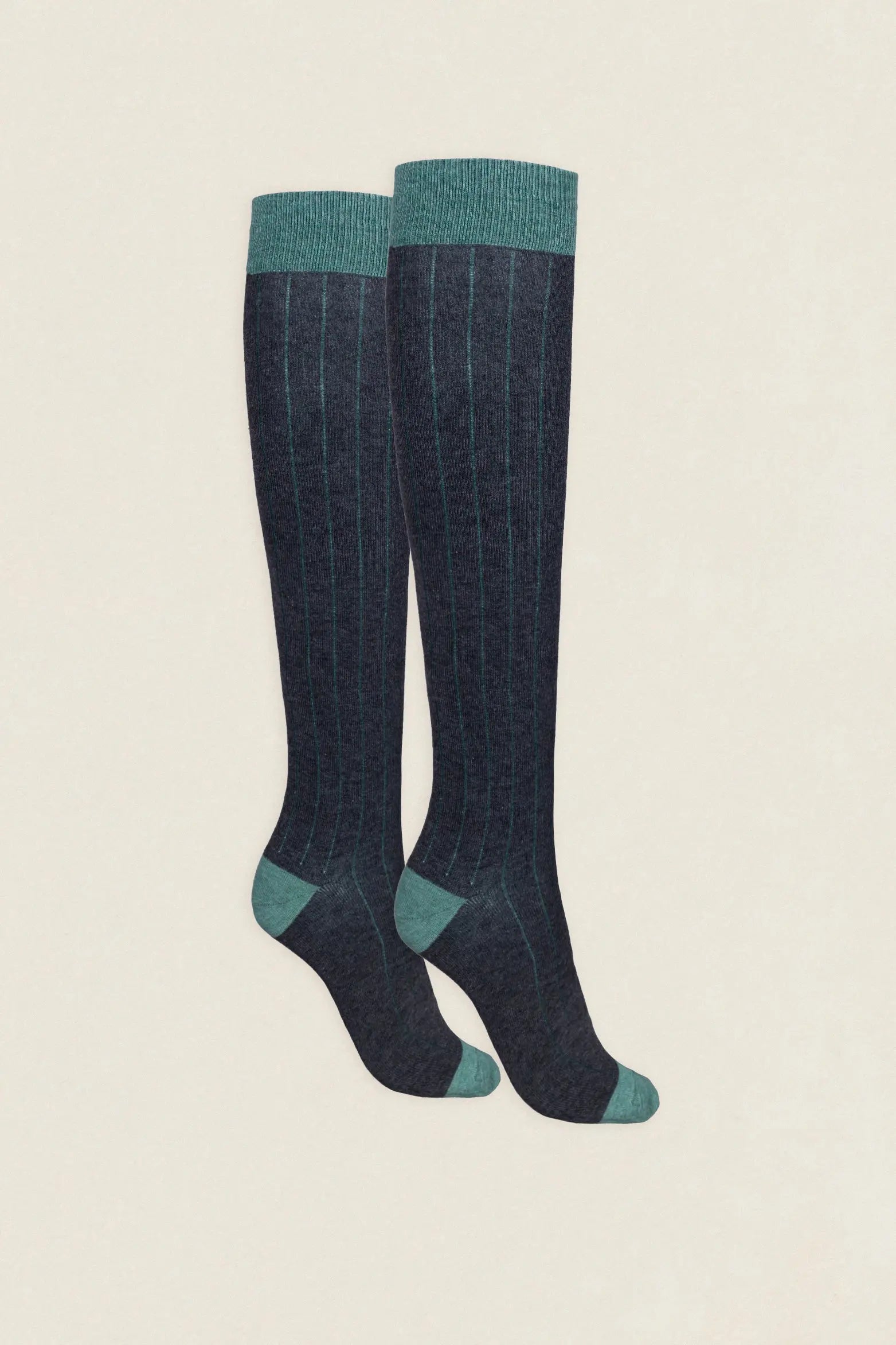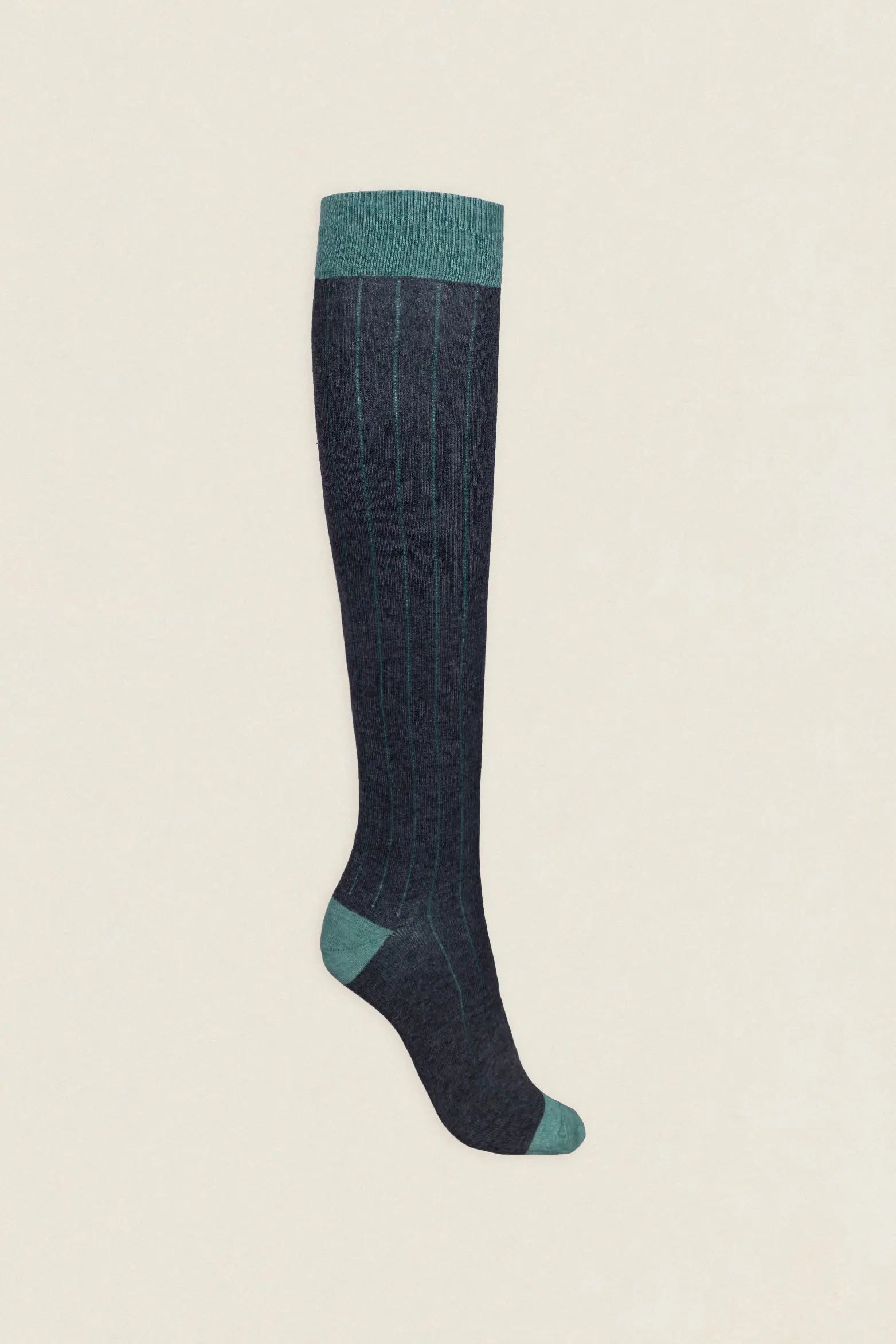 Calcetín de algodón peinado de caña alta bicolor. La abertura del canalé, la puntera, el talón y la faja son del mismo color. Compuestos por un 83% de algodón son muy cómodos, se adaptan a tu pierna y no se caen ni hacen arrugas.
