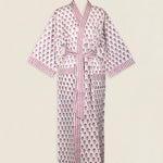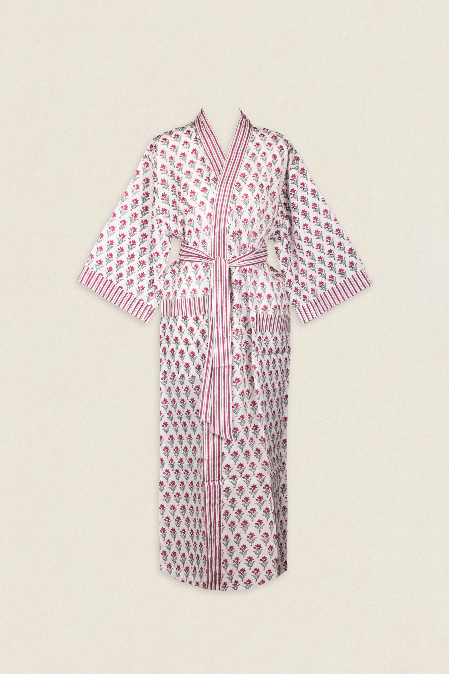 Bata de algodón tipo kimono, con estampado floral en tonos verdes y azules sobre fondo blanco. Detalles de rayas verticales en el cuello, manga y bolsillos. Incluye un cinturón.