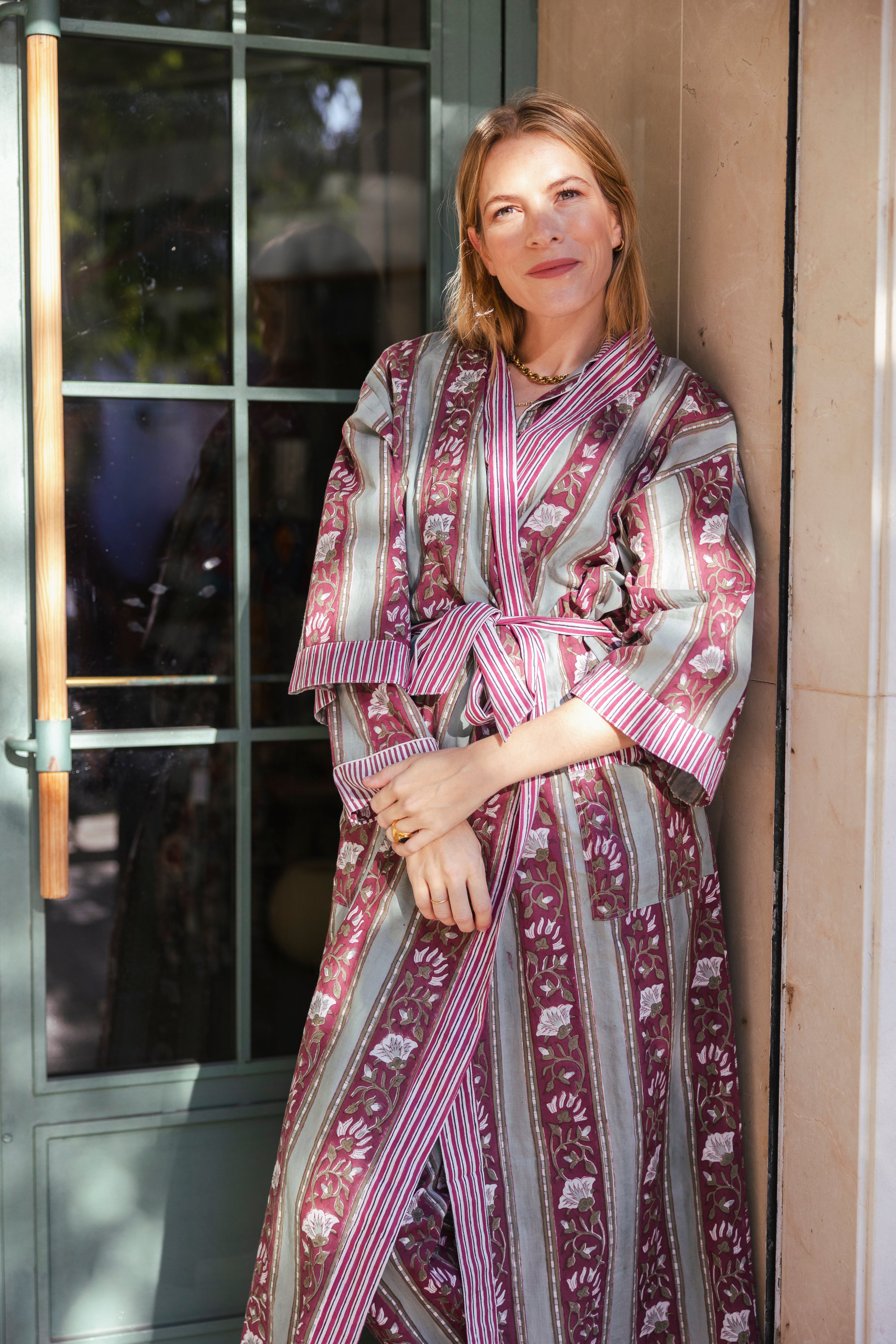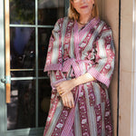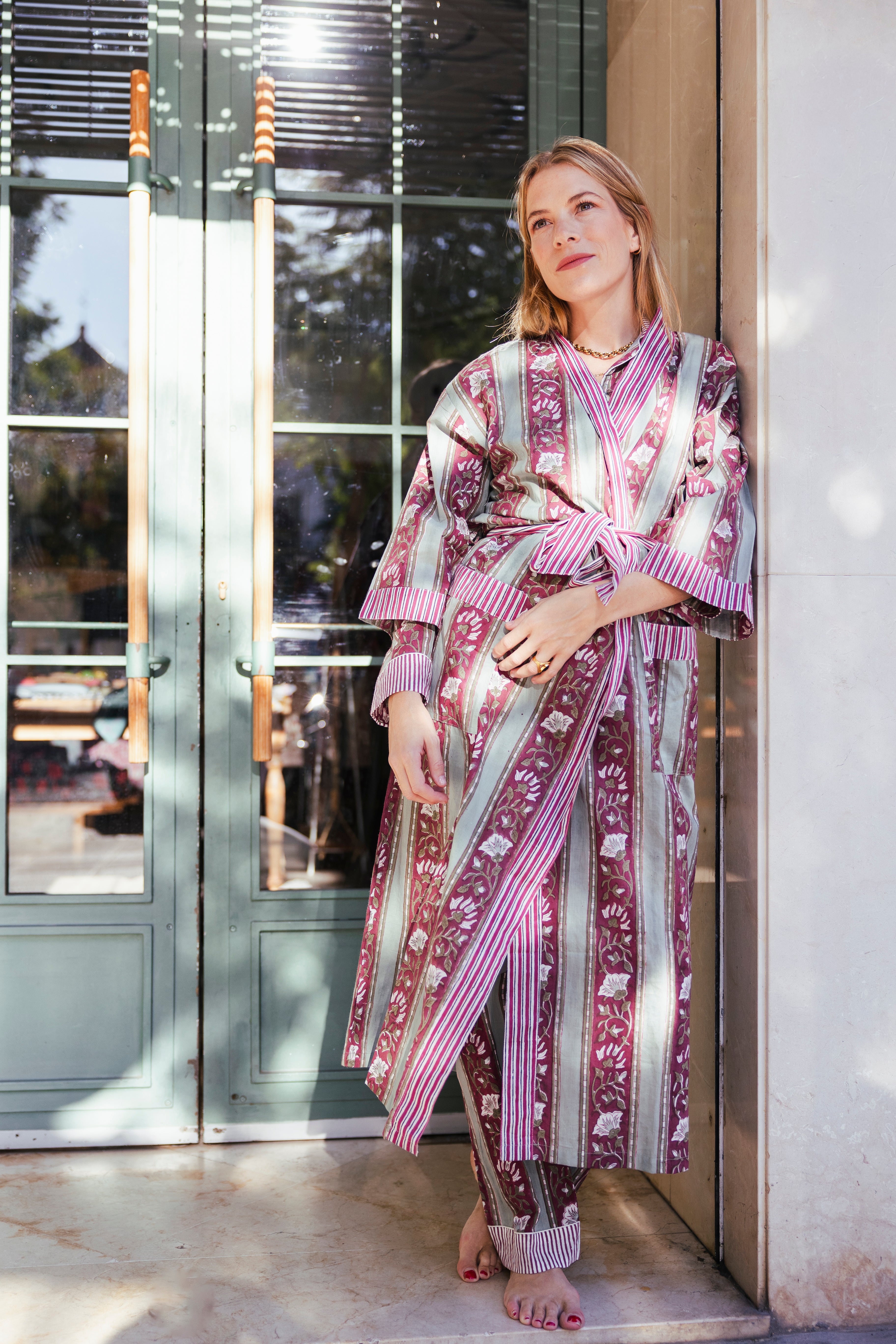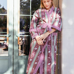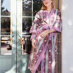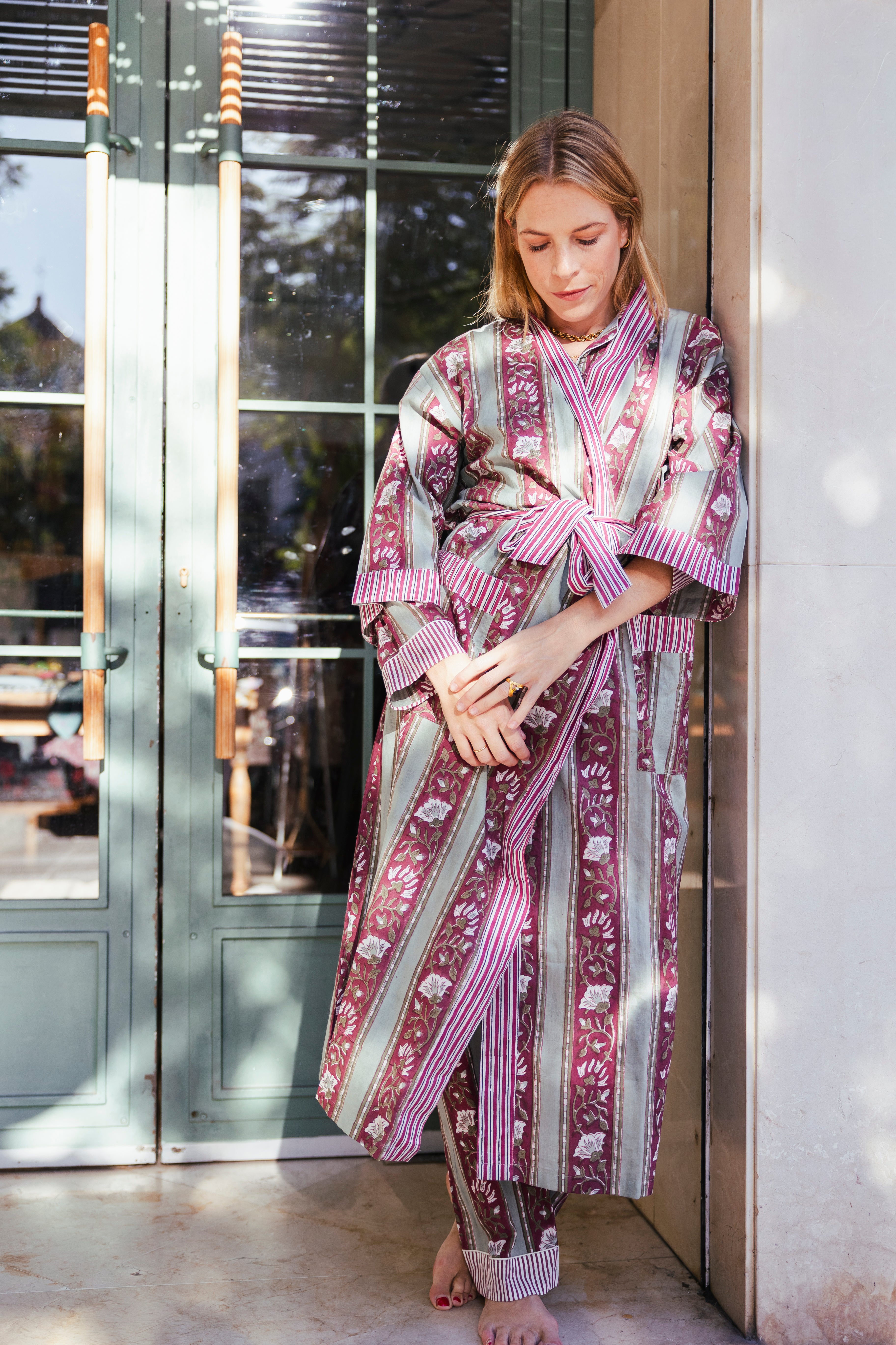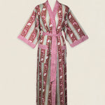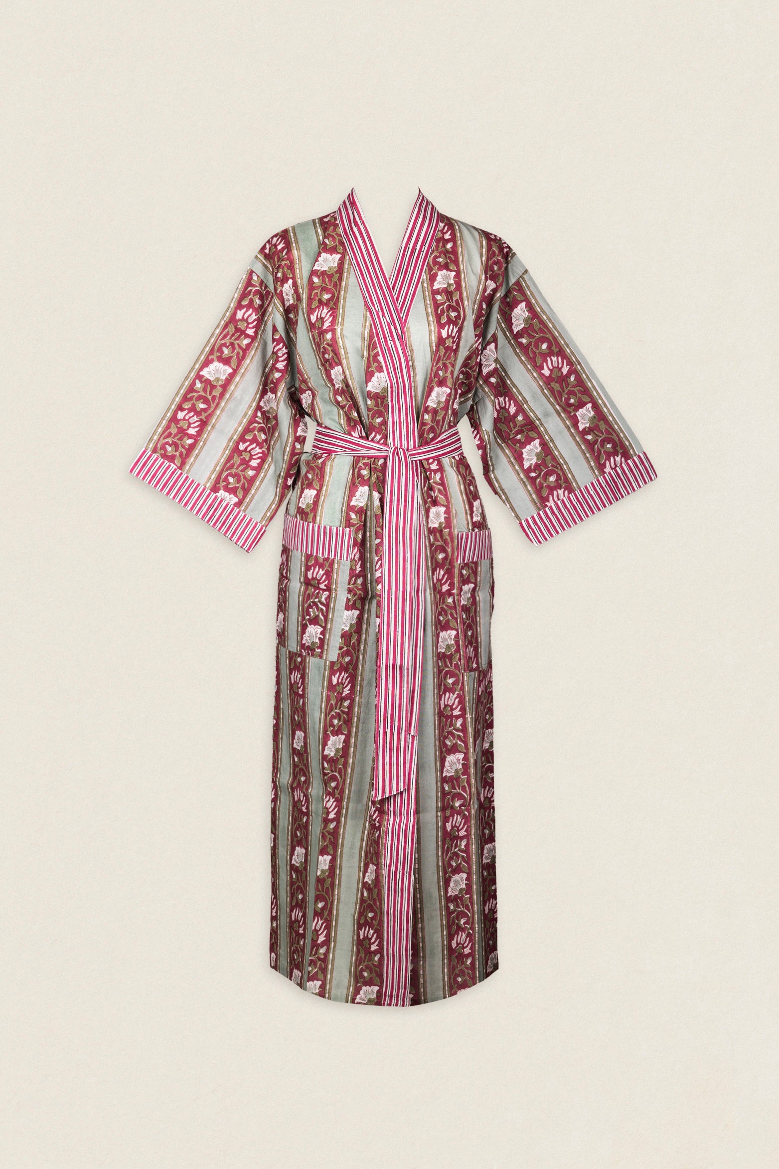 Bata de algodón tipo kimono, con estampado floral en tonos verdes y burdeos. Detalles de rayas verticales en el cuello, manga y bolsillos. Incluye un cinturón.