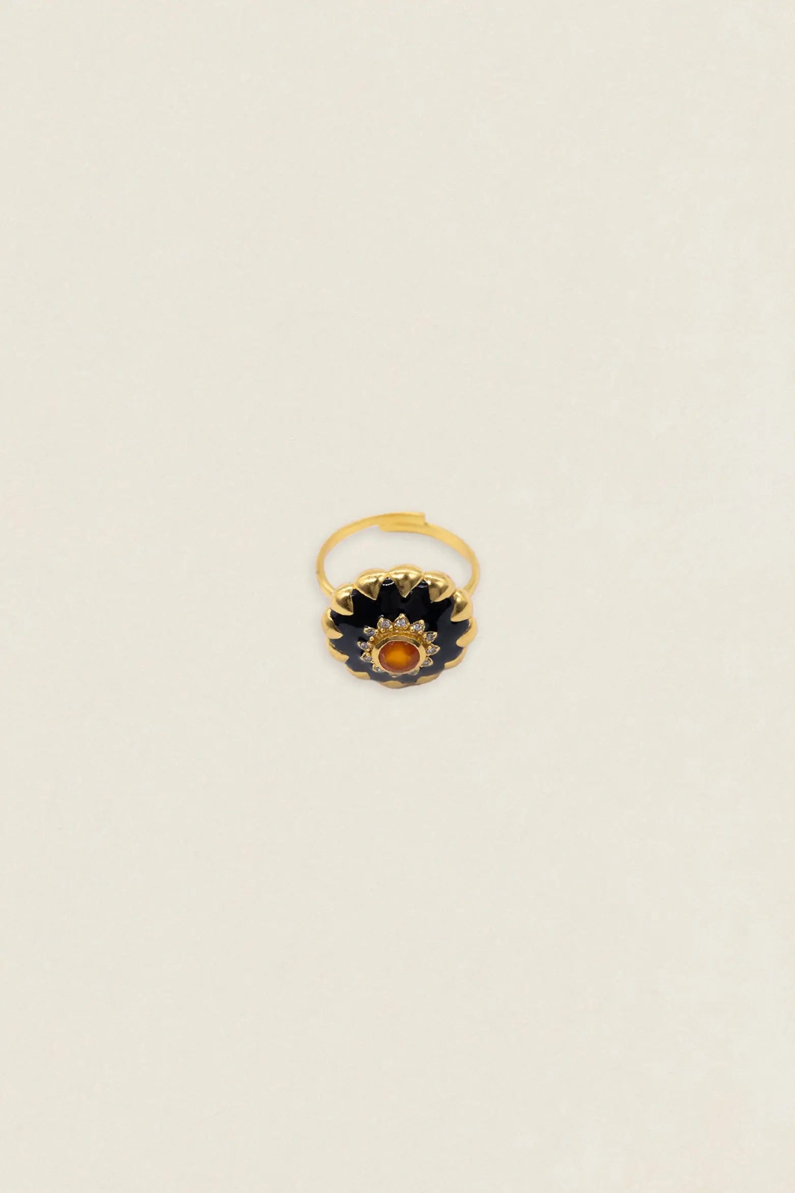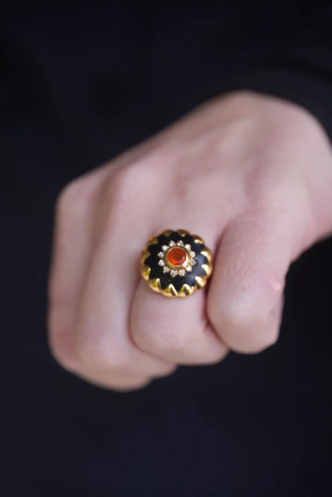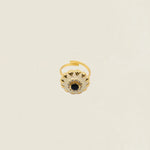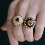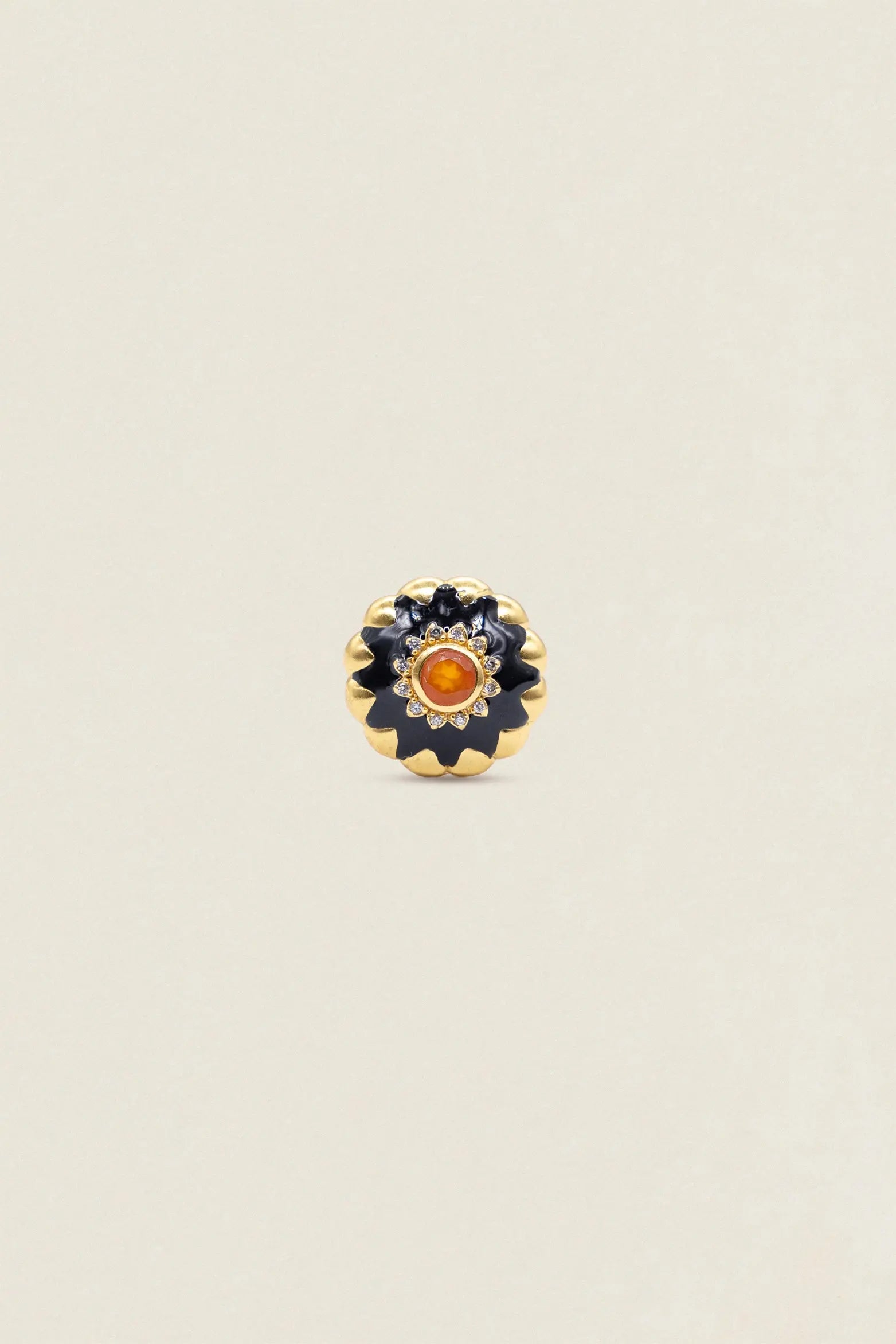 El Anillo Eloisa AN43 es una joya artesanal inspirada en la belleza de la naturaleza. Elaborado en bronce con baño en oro de 18k, destaca por su diseño en forma de flor que abrazan una piedra natural central de color intenso, símbolo de feminidad, equilibrio y energía.
