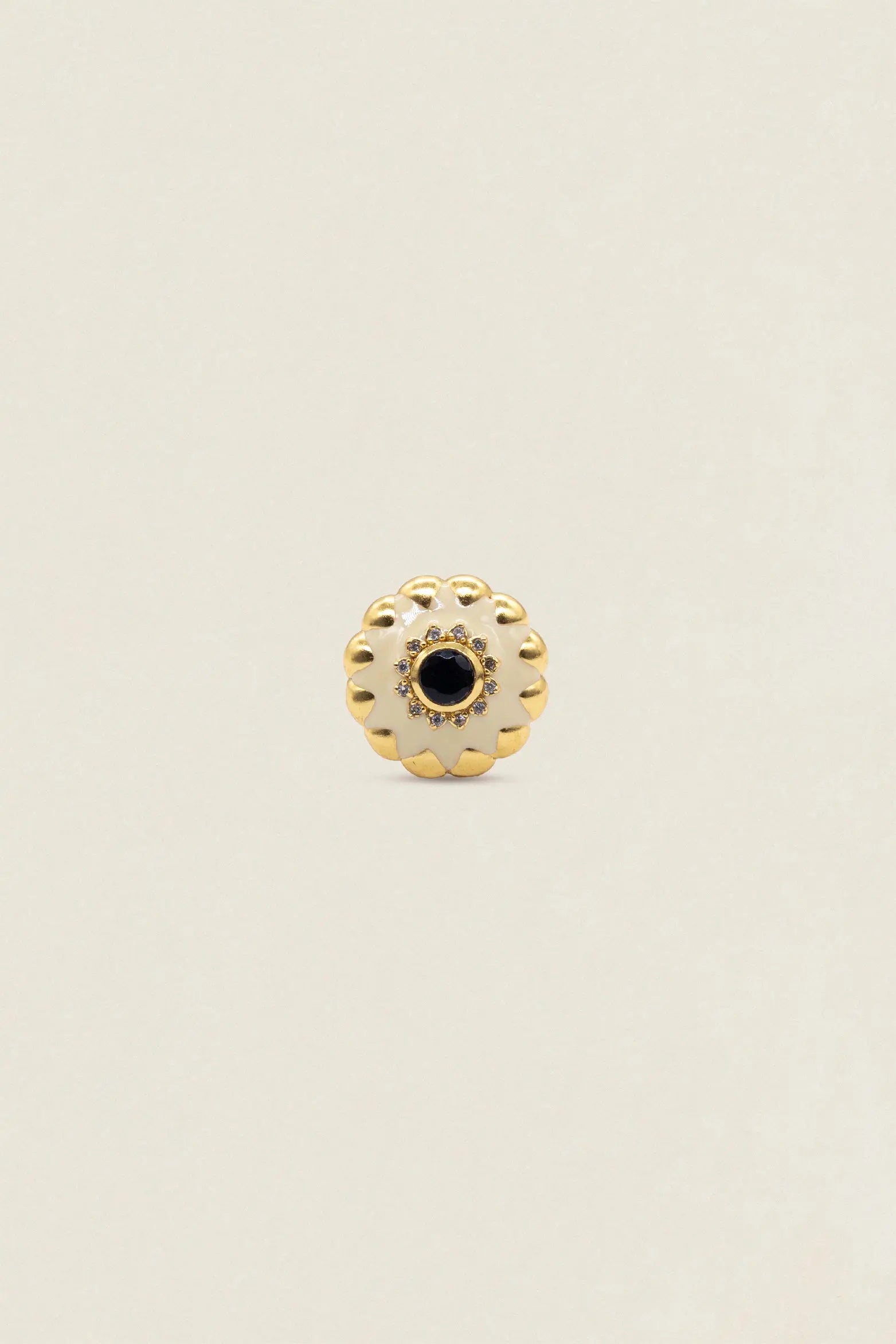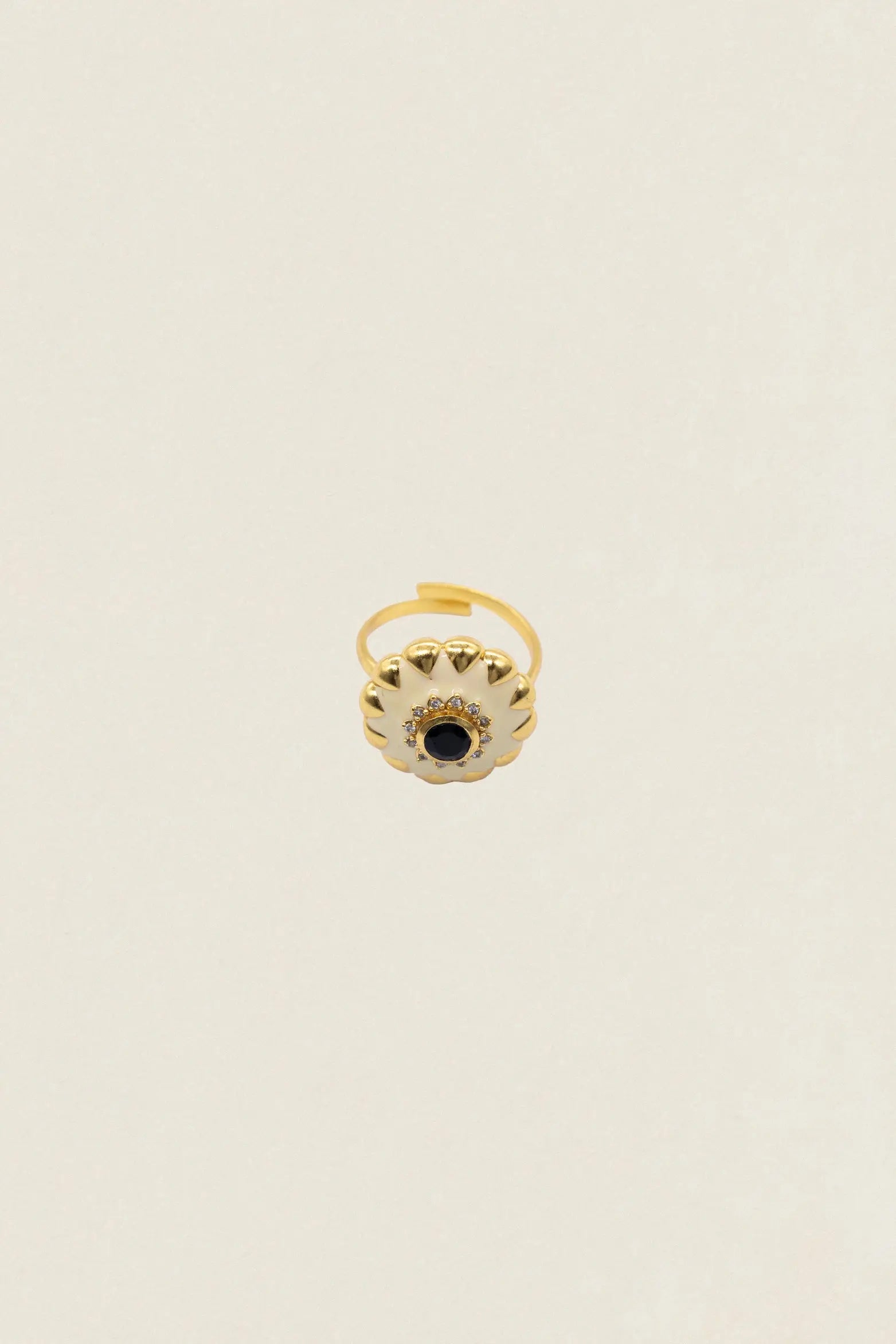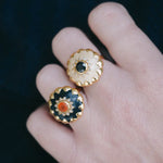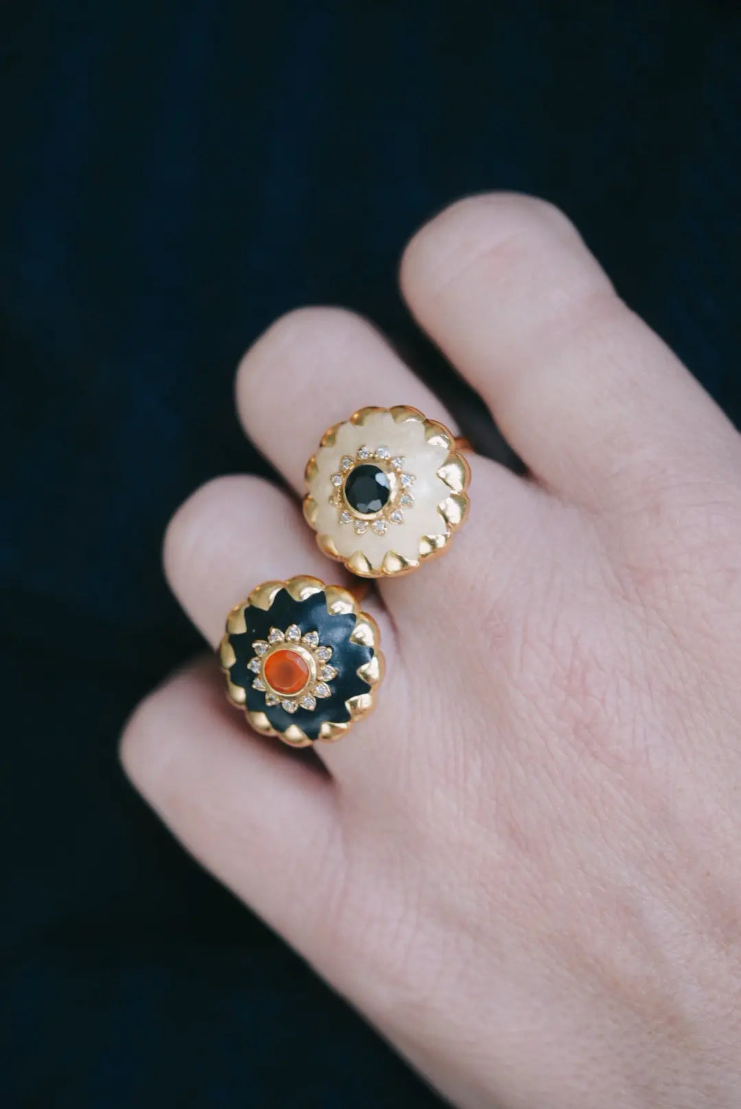 El Anillo Eloisa AN43 es una joya artesanal inspirada en la belleza de la naturaleza. Elaborado en bronce con baño en oro de 18k, destaca por su diseño en forma de flor que abrazan una piedra natural central de color intenso, símbolo de feminidad, equilibrio y energía.