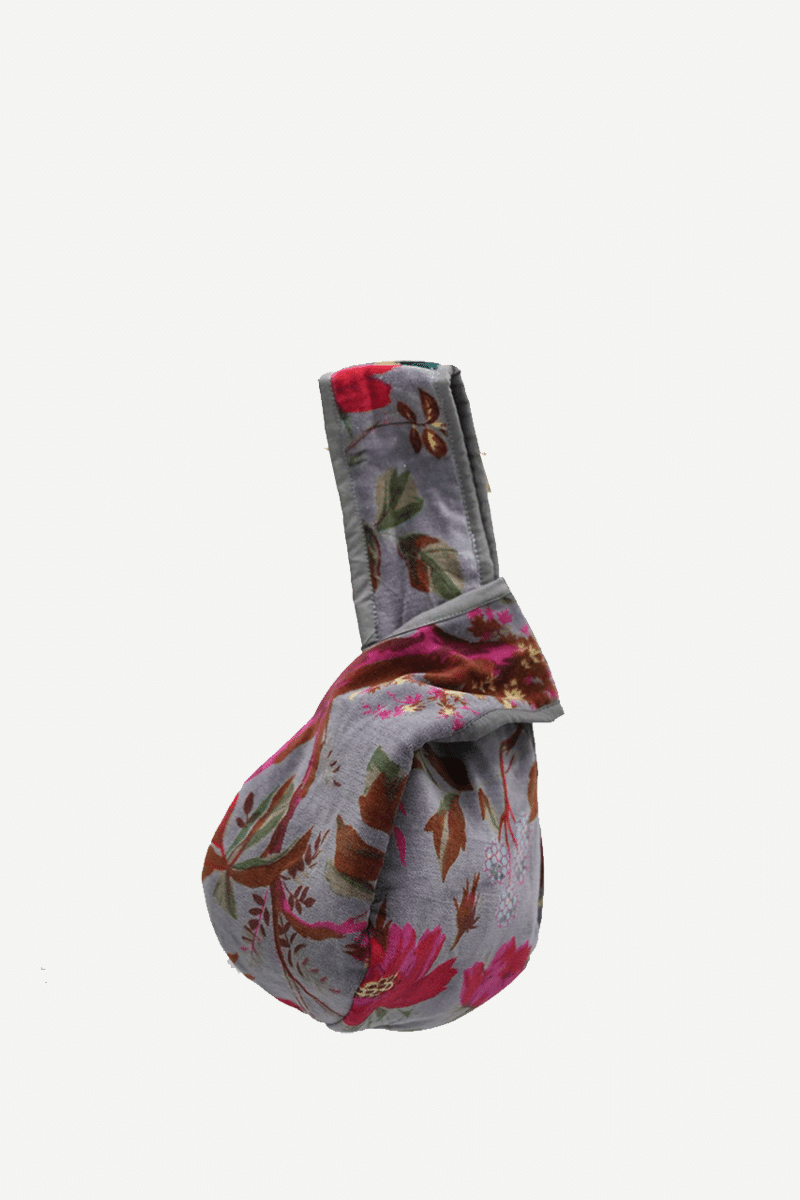 Bolso de terciopelo con asa anudada para llevar como bolso de mano.