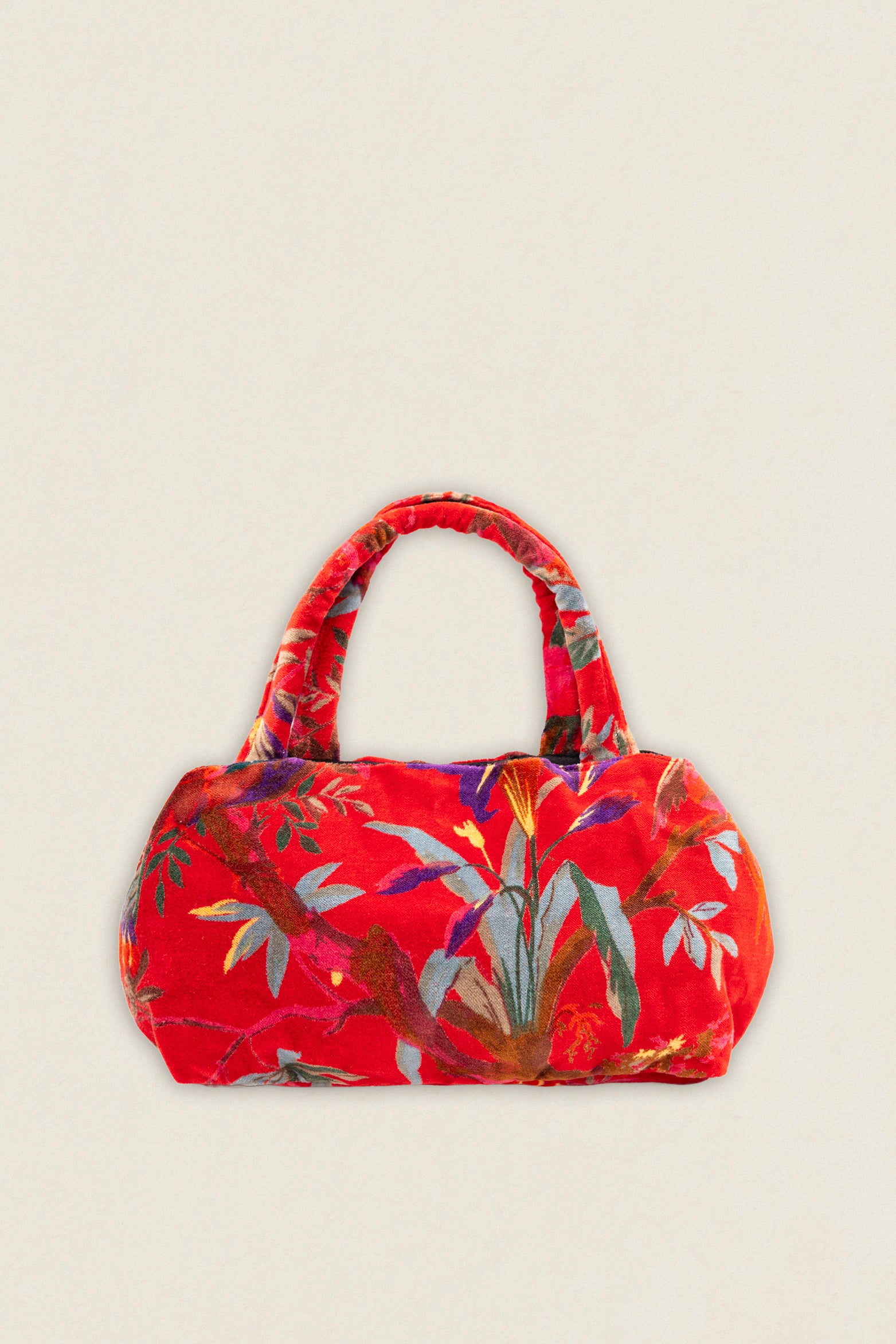 Con el tamaño justo para llevar lo imprescindible, combina la suavidad del terciopelo con la versatilidad de sus dos asas.