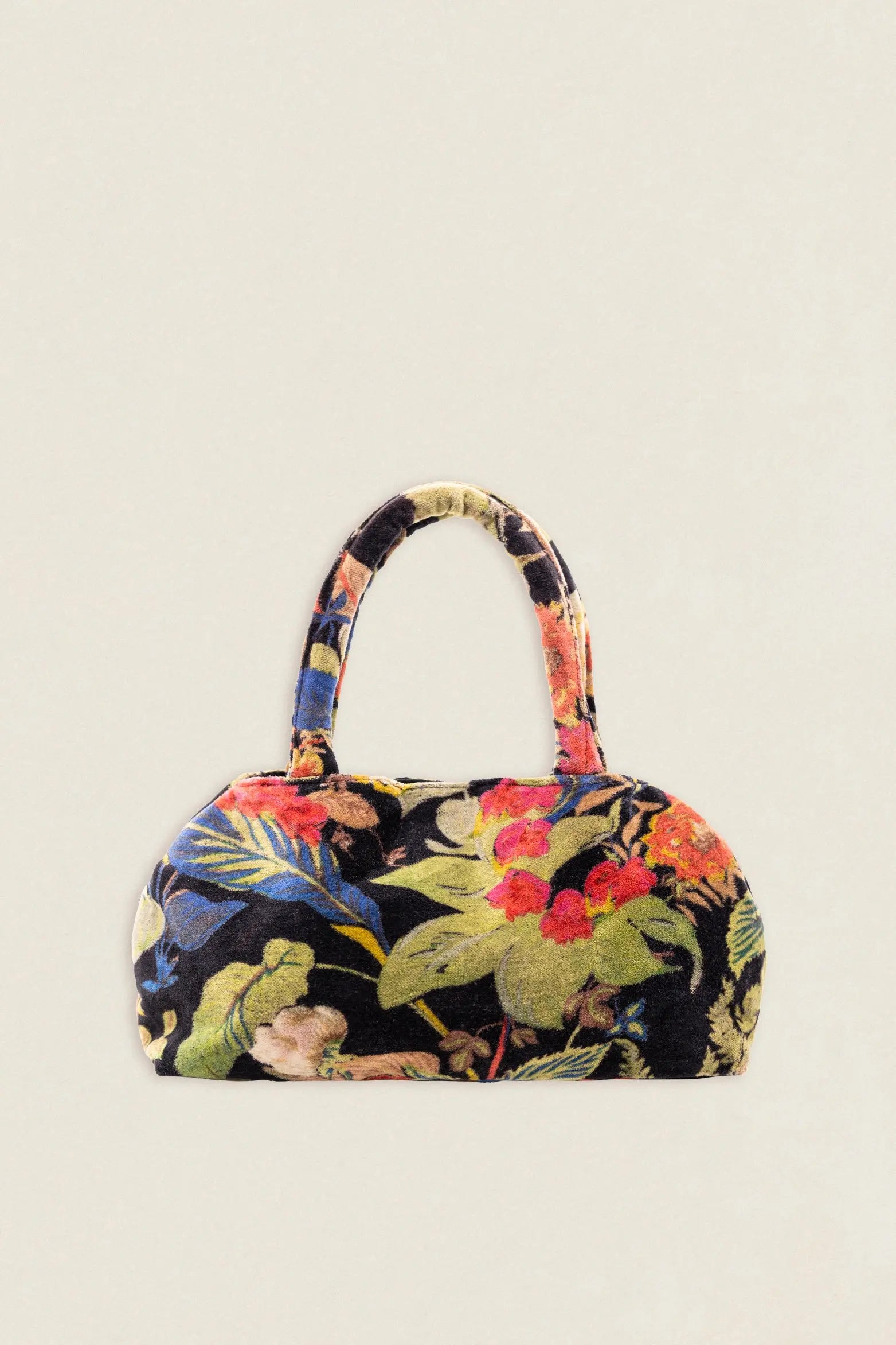 Con el tamaño justo para llevar lo imprescindible, combina la suavidad del terciopelo con la versatilidad de sus dos asas.