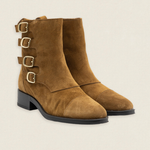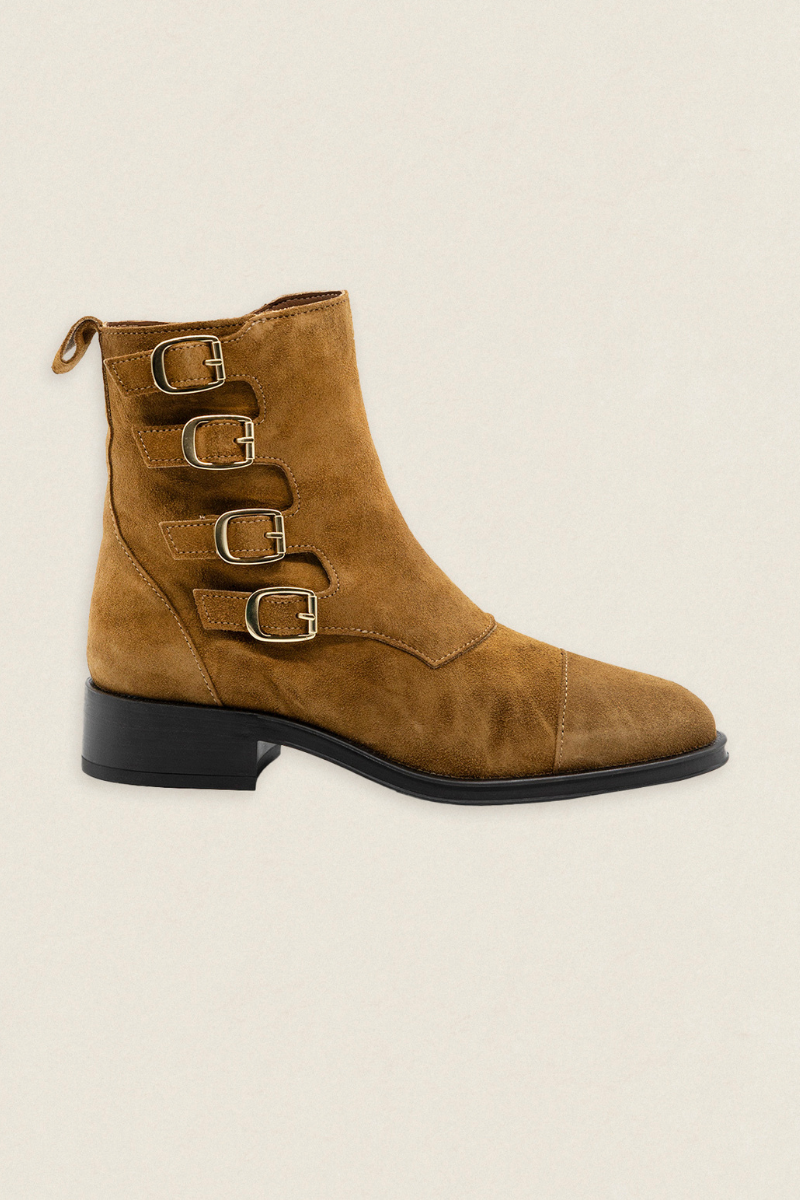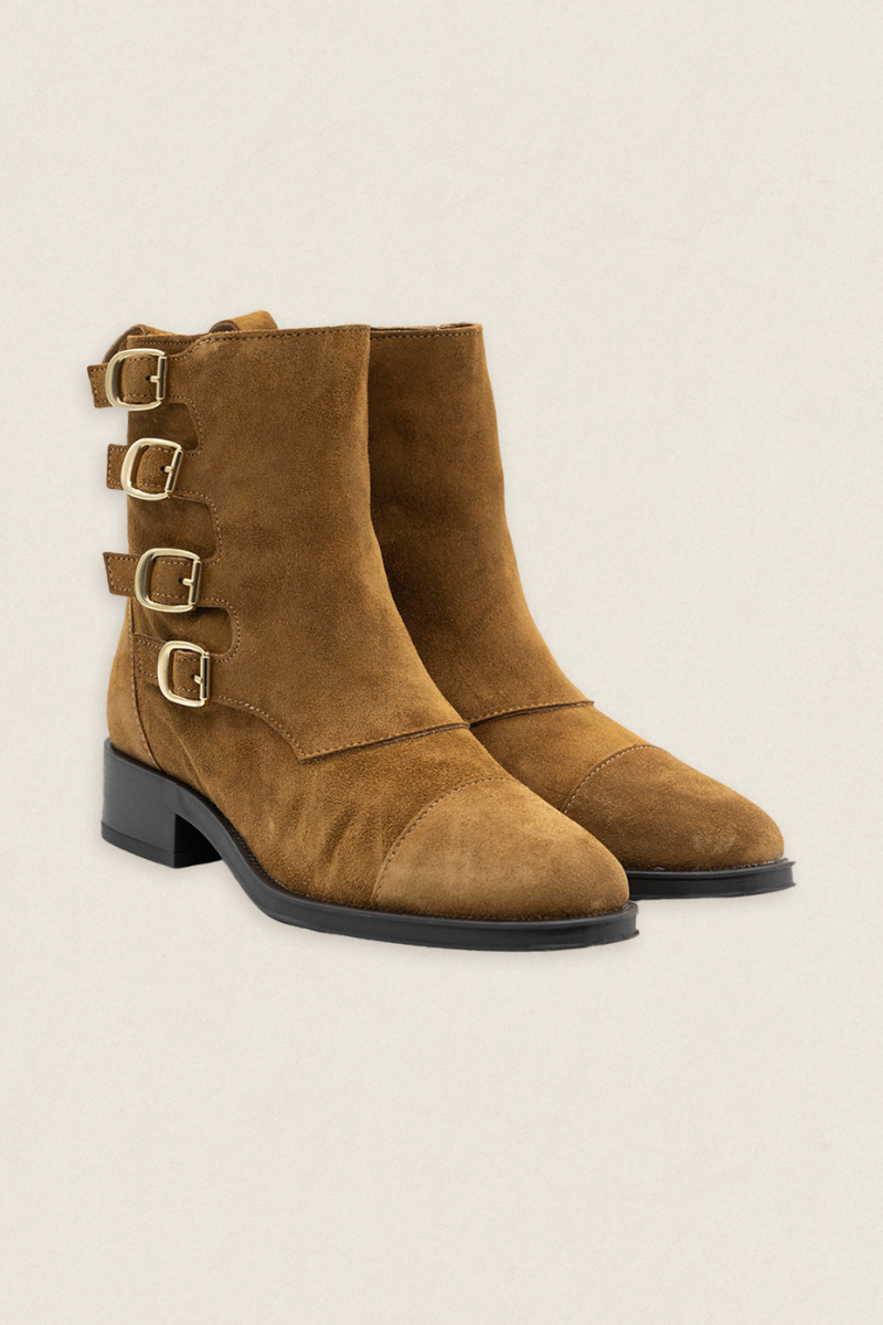 Estas botas de ante marrones destacan por su diseño único con cuatro hebillas metálicas, que aportan un aire moderno y desenfadado.
