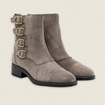 Estas botas de ante grises destacan por su diseño único con cuatro hebillas metálicas, que aportan un aire moderno y desenfadado.