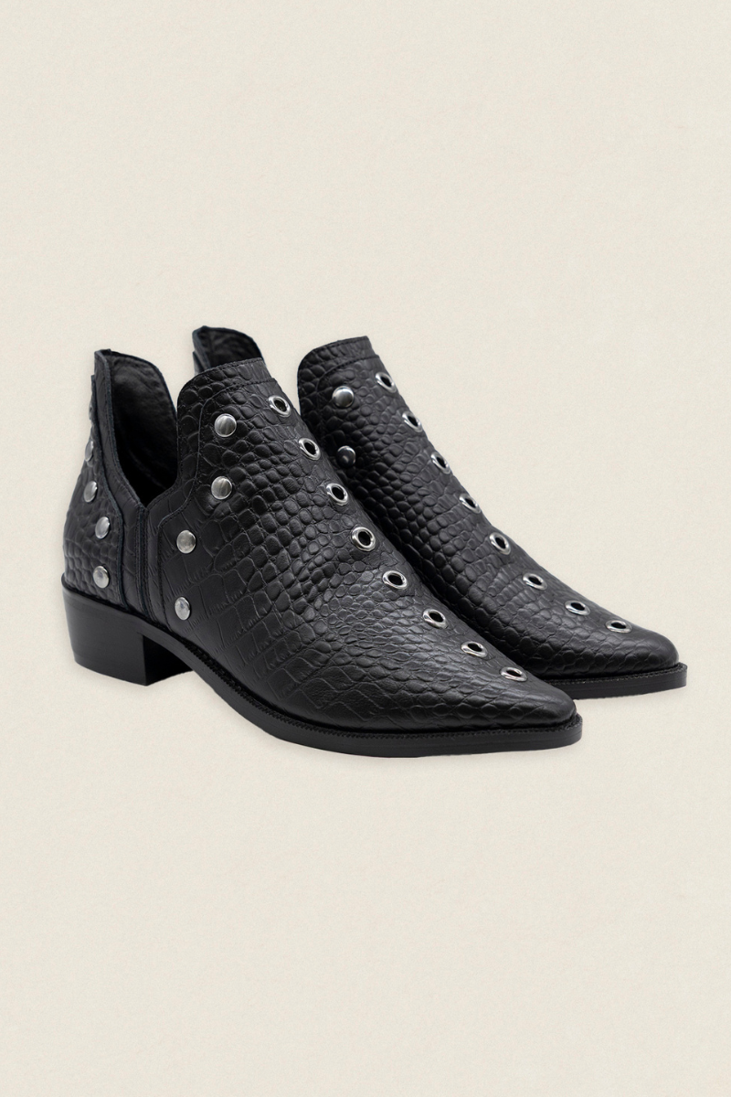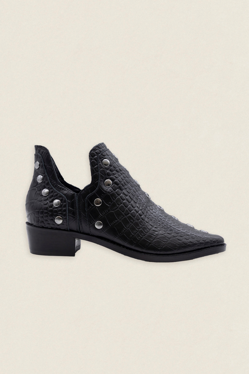 Las botas Mer son una de nuestras piezas más icónicas, un diseño que combina estilo, carácter y la mejor calidad en piel. Confeccionadas en piel auténtica, destacan por sus tachuelas decorativas en los laterales y por su textura efecto serpiente, un detalle que aporta personalidad y un toque sofisticado.