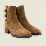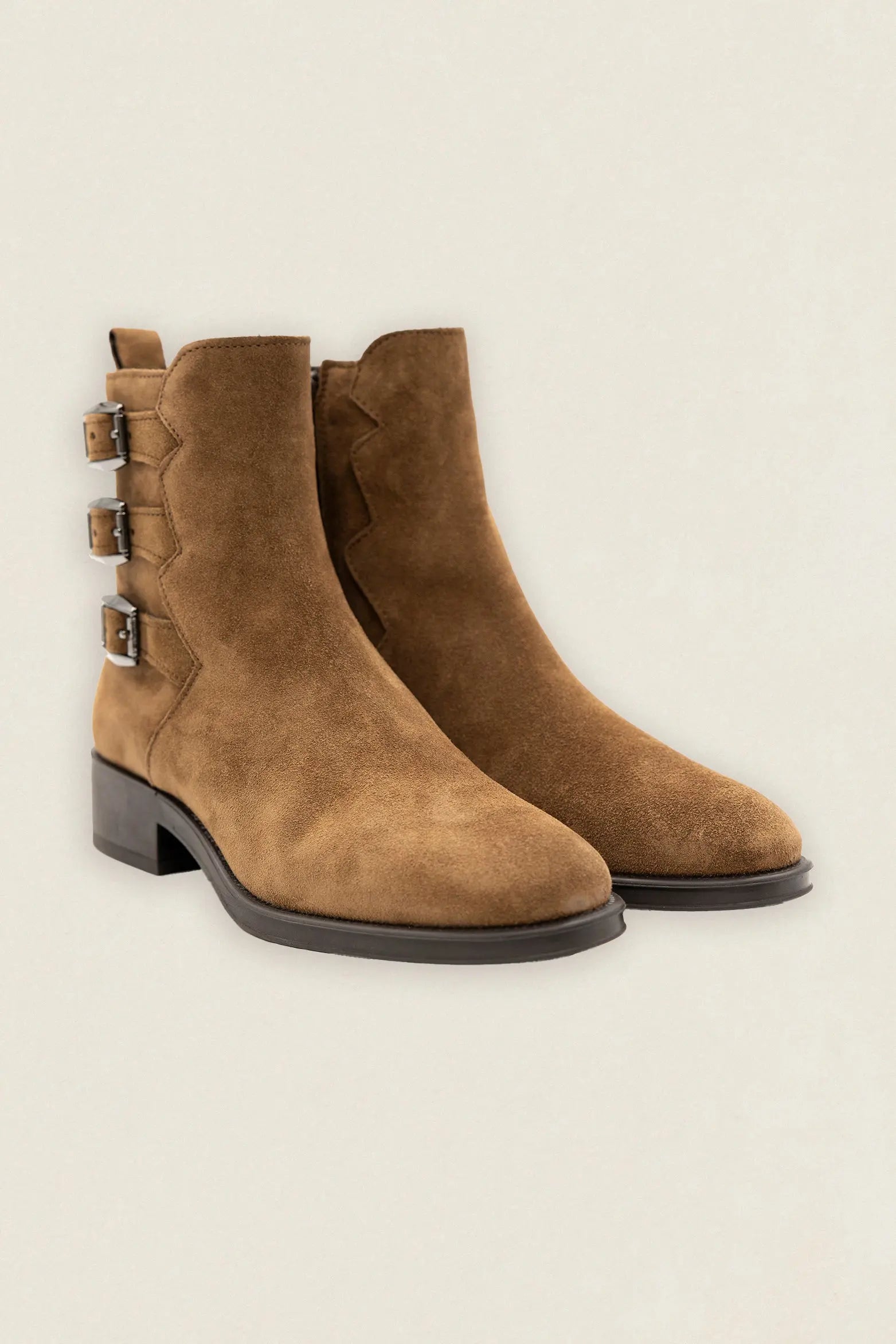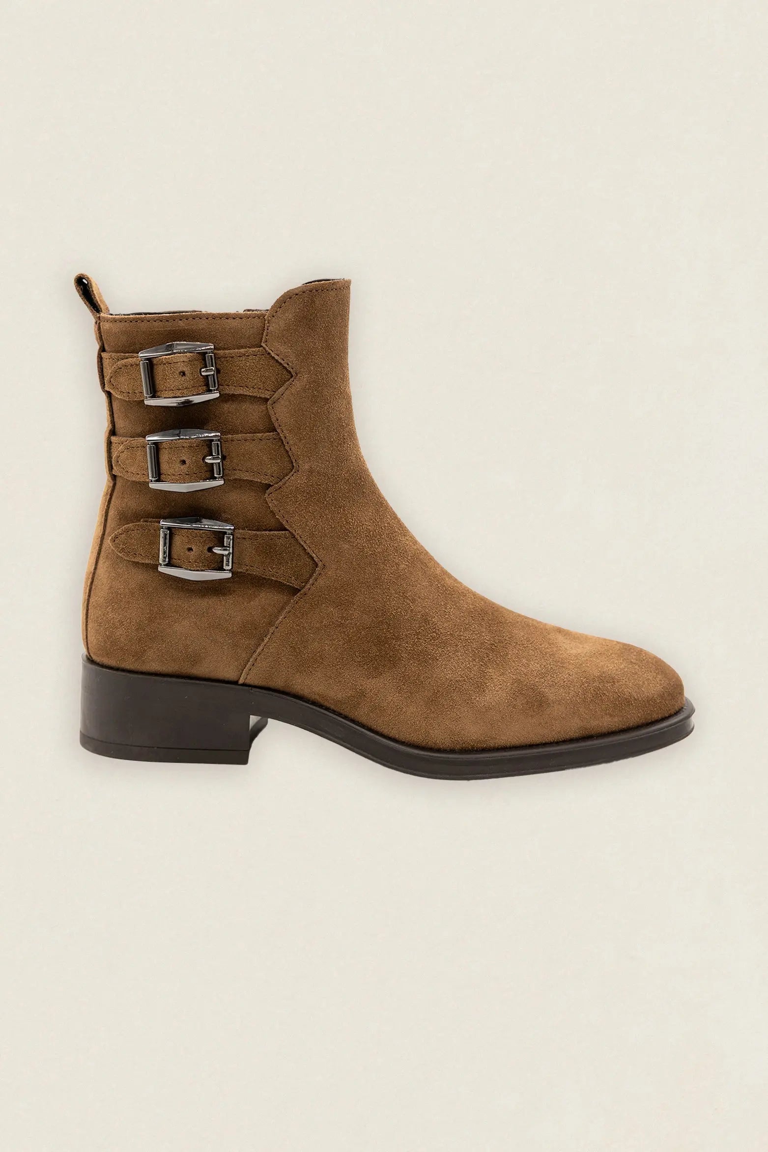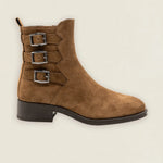 Estas botas de ante destacan por su diseño único con tres hebillas metálicas, que aportan un aire moderno y desenfadado.