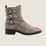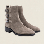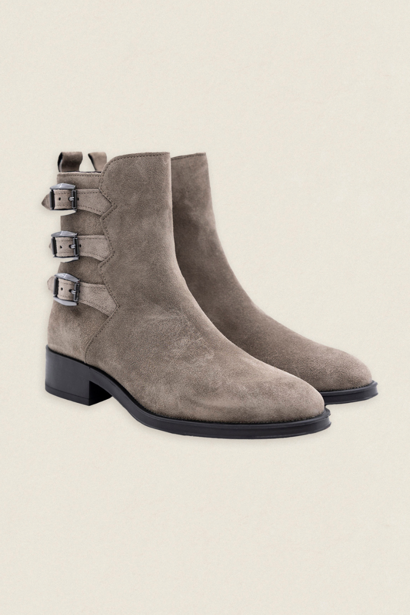 Estas botas de ante grises destacan por su diseño único con tres hebillas metálicas, que aportan un aire moderno y desenfadado.