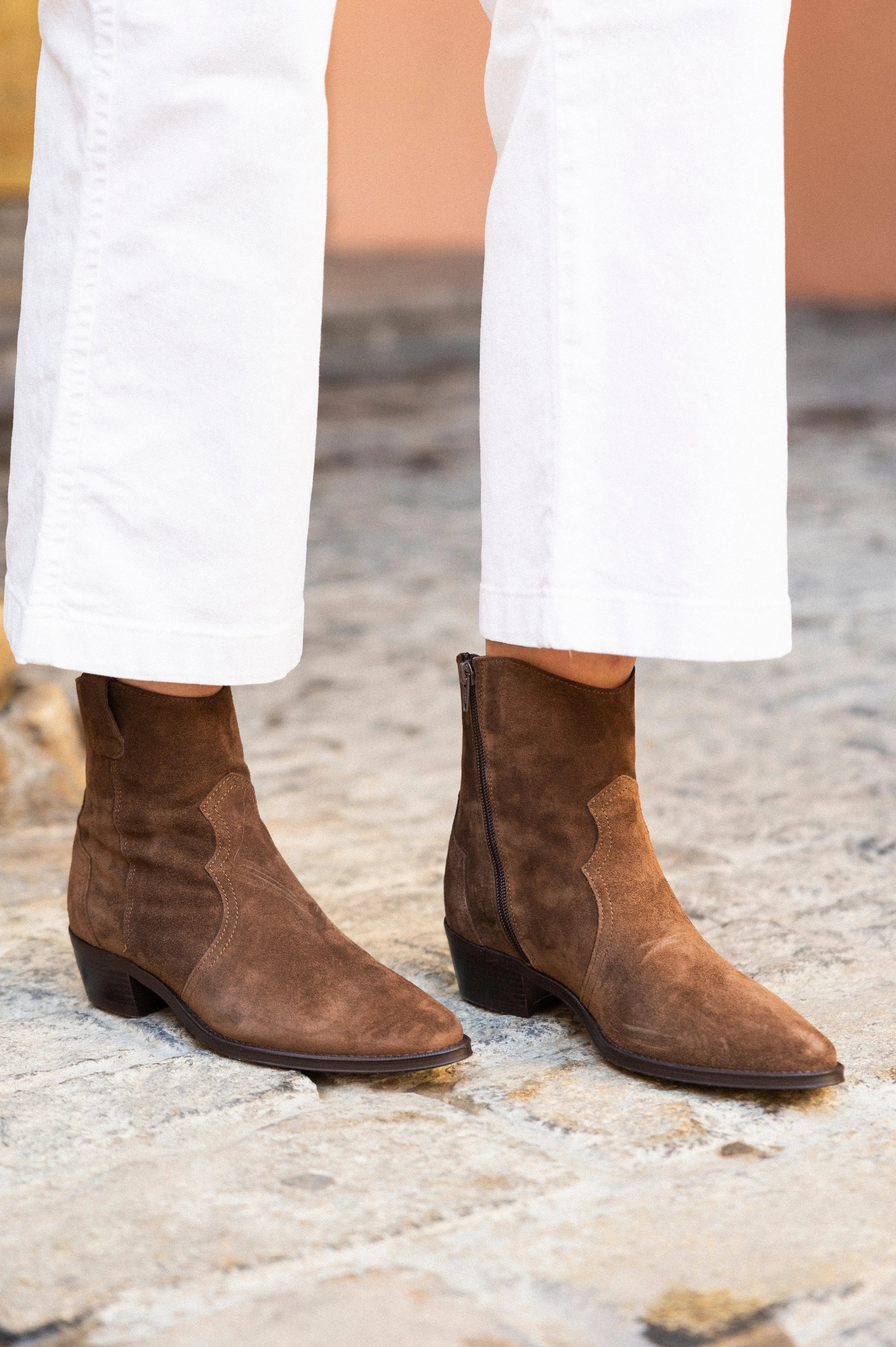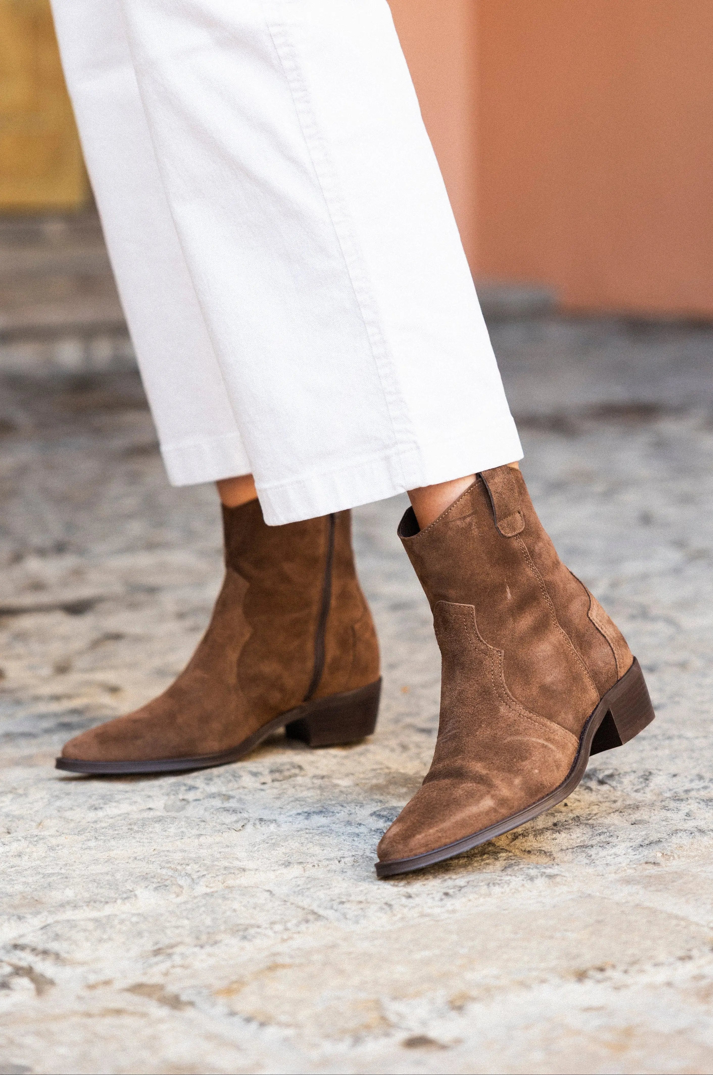 Estas botas de ante marrones destacan por su diseño al estilo cowboy, aportando un aire moderno y desenfadado.