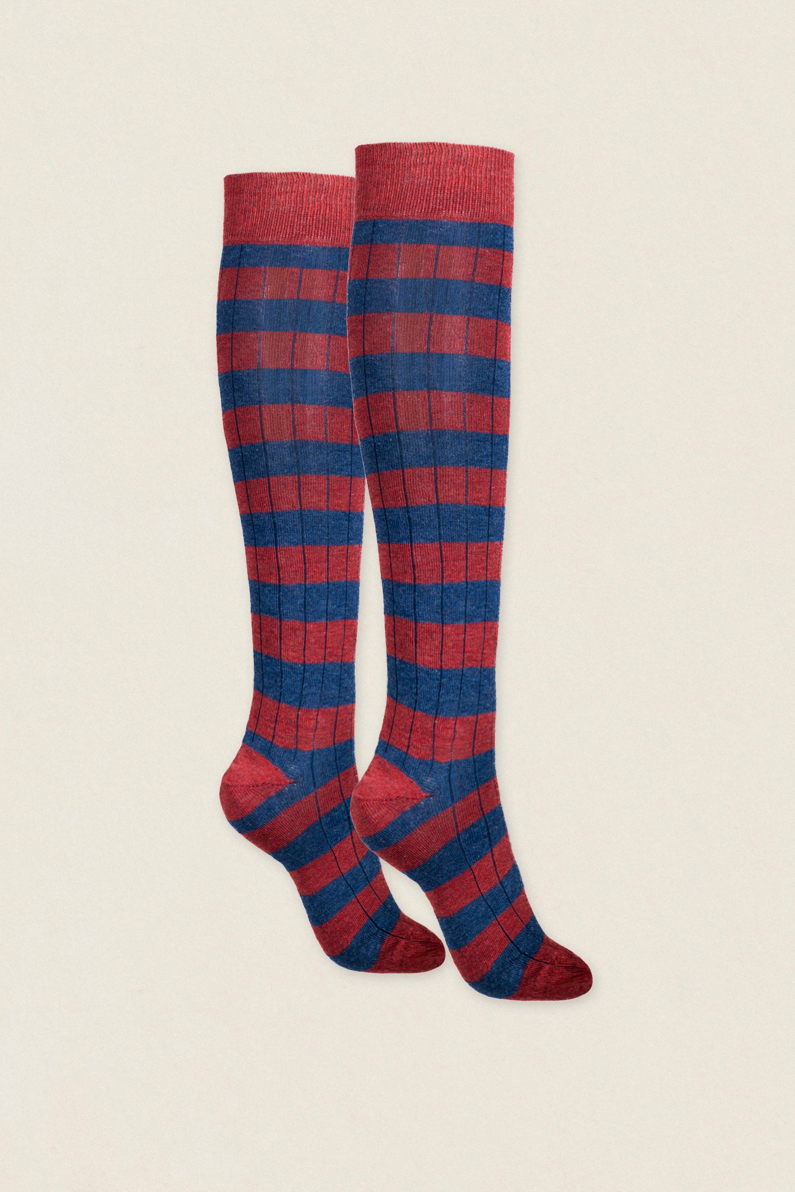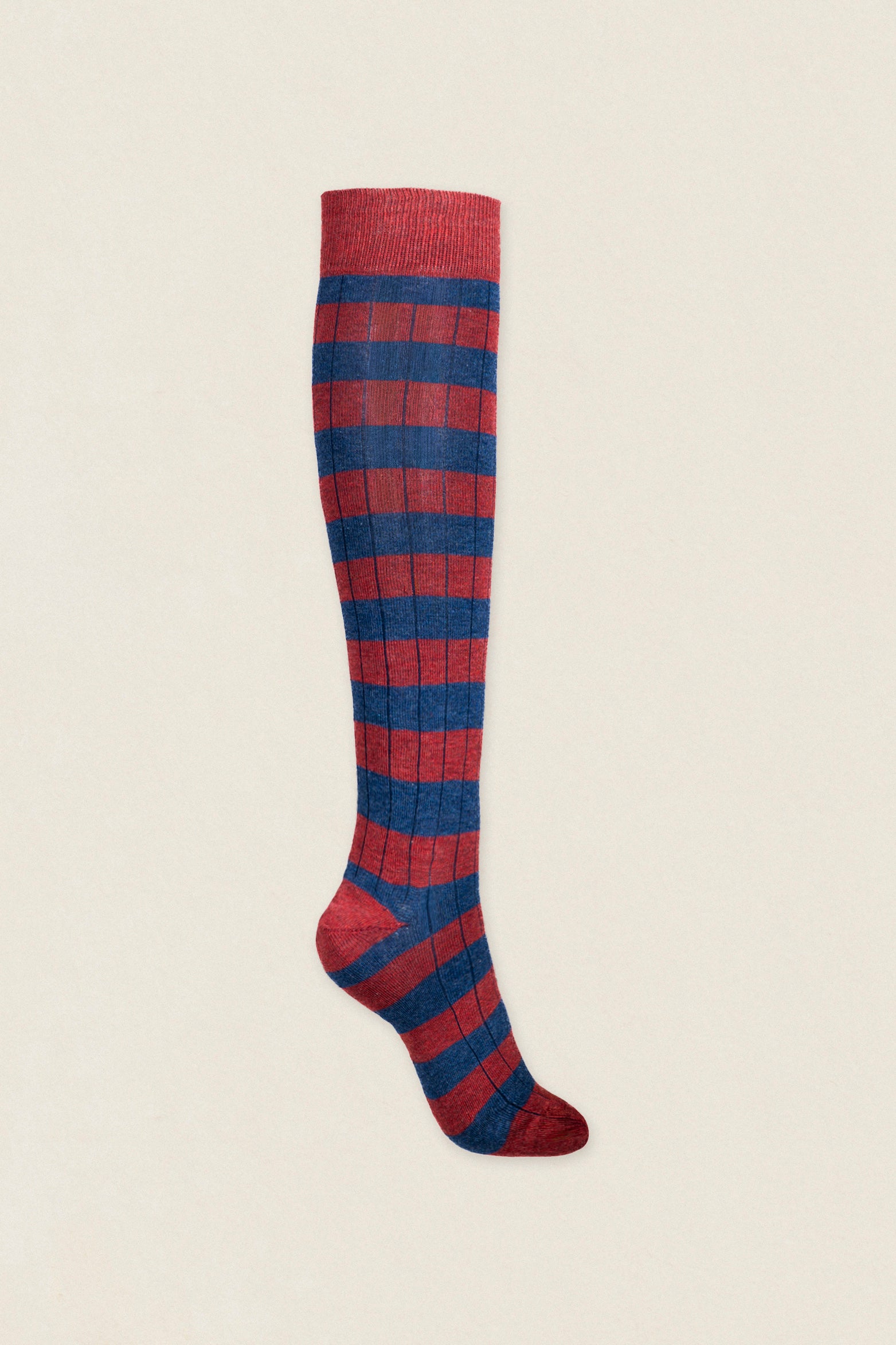 Calcetín de algodón peinado de caña alta bicolor. La abertura del canalé, la puntera, el talón y la faja son del mismo color. Compuestos por un 83% de algodón son muy cómodos, se adaptan a tu pierna y no se caen ni hacen arrugas.