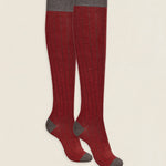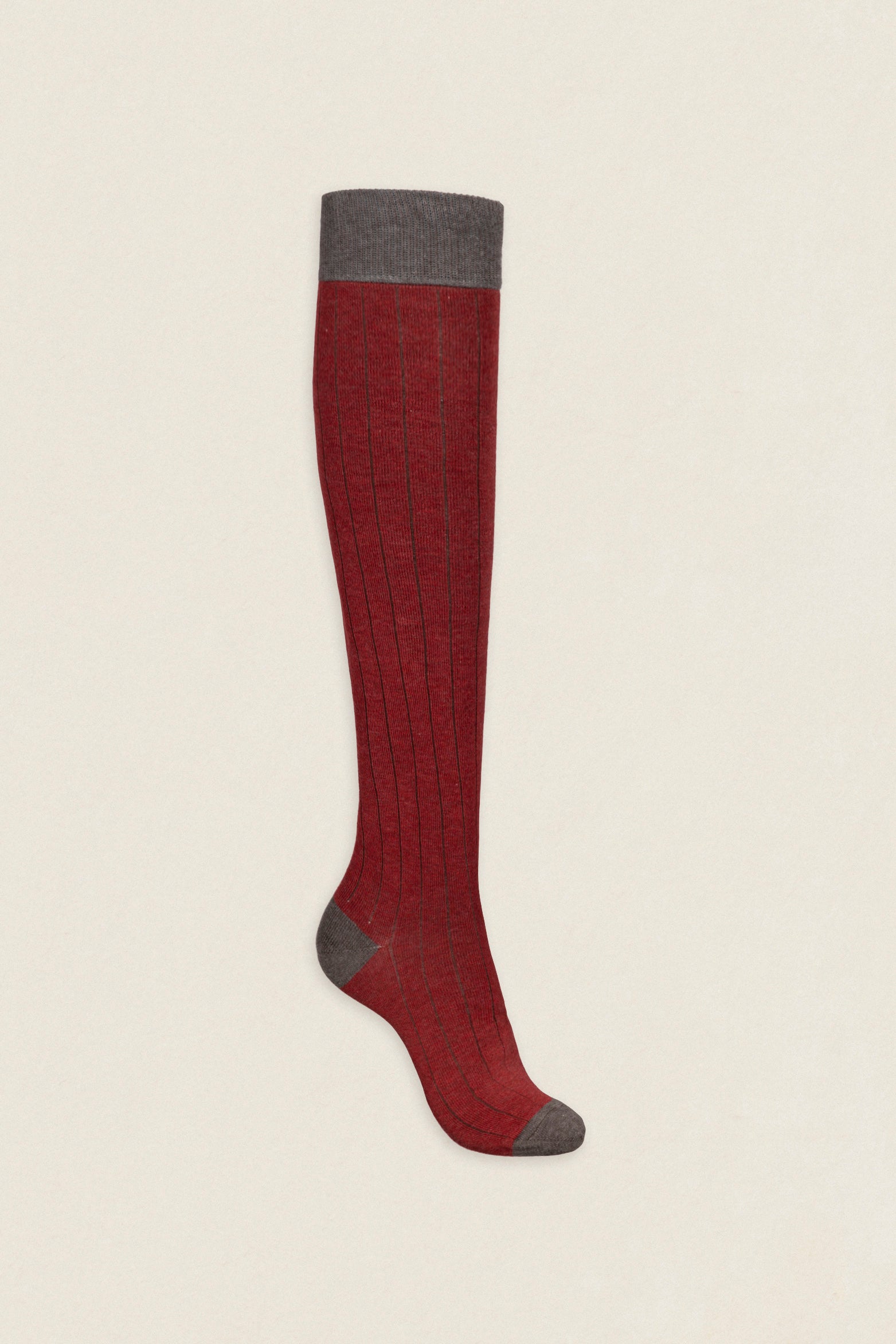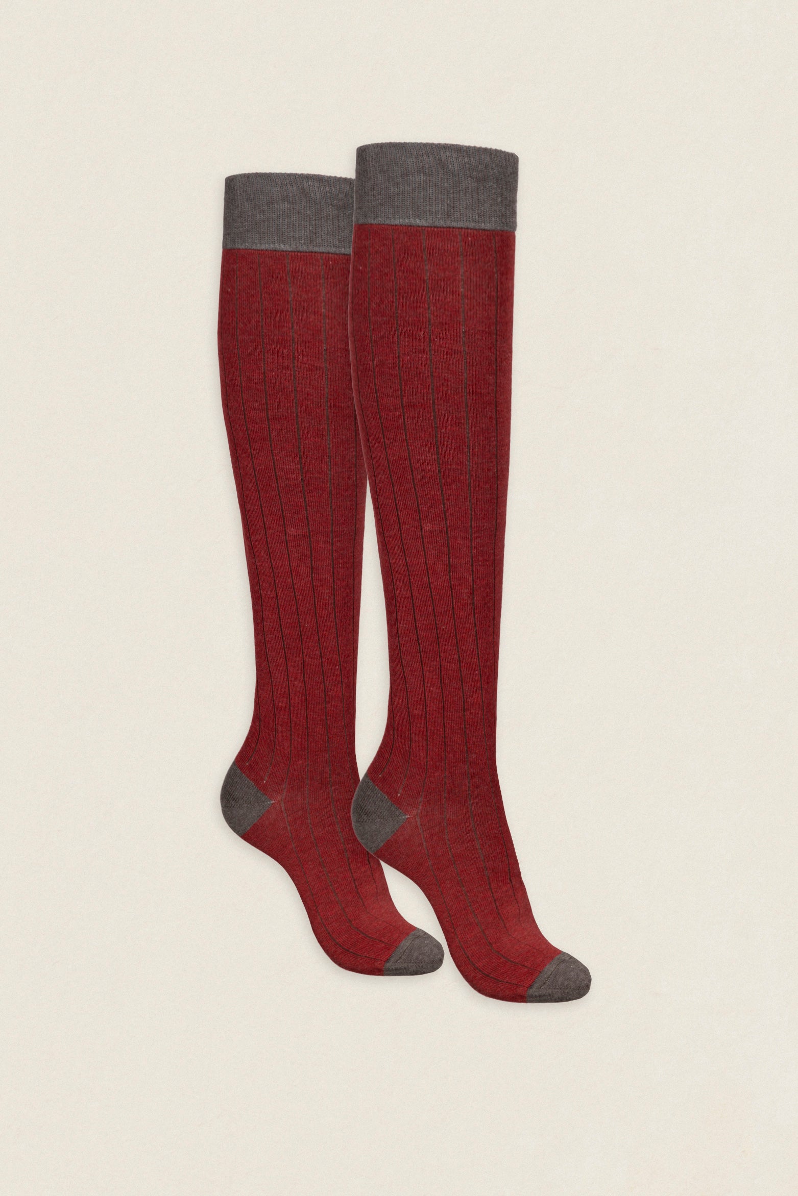 Calcetín de algodón peinado de caña alta bicolor. La abertura del canalé, la puntera, el talón y la faja son del mismo color. Compuestos por un 83% de algodón son muy cómodos, se adaptan a tu pierna y no se caen ni hacen arrugas.