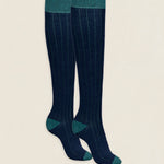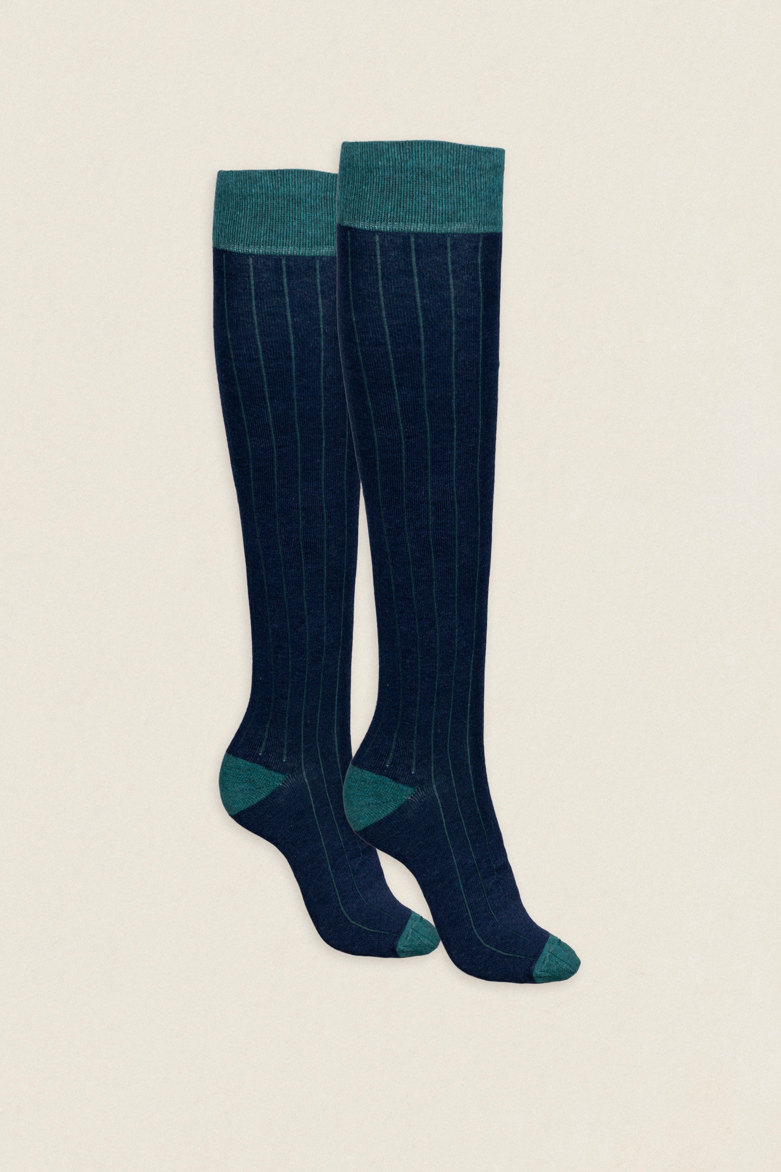 Calcetín de algodón peinado de caña alta bicolor. La abertura del canalé, la puntera, el talón y la faja son del mismo color. Compuestos por un 83% de algodón son muy cómodos, se adaptan a tu pierna y no se caen ni hacen arrugas.