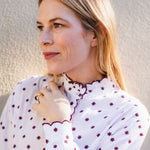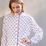 Camisa con flores pequeñas blanca. El cuello tiene un ligero detalle de volante para llevarla tanto cerrada como abierta con botón en la parte frontal. Las mangas tienen un diseño cómodo.