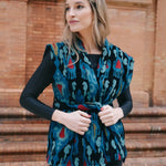 El Chaleco bordado de terciopelo en tonos azules y verdes es una pieza especial que combina artesanía, textura y color en un diseño irresistible.