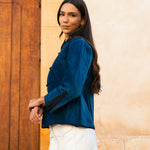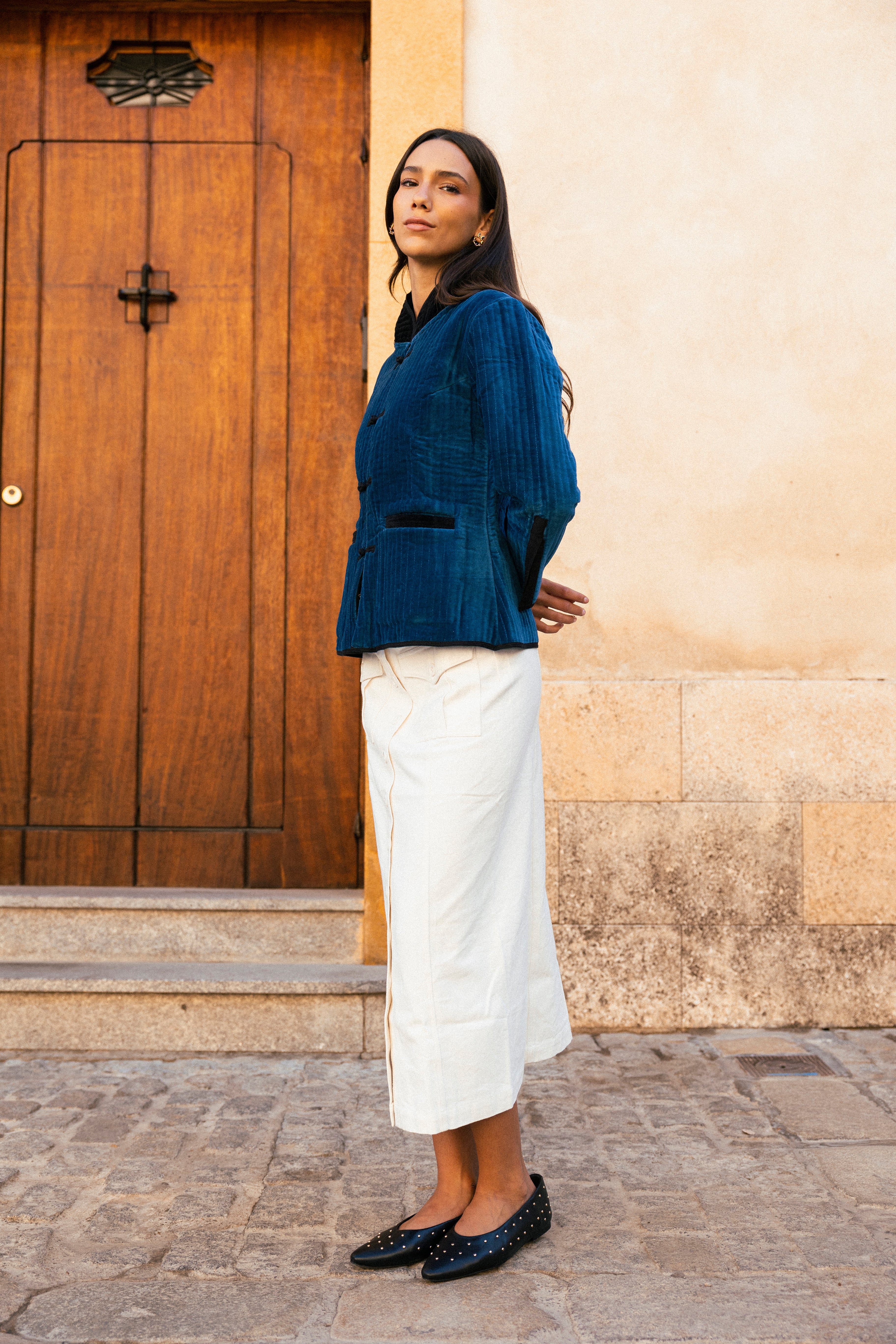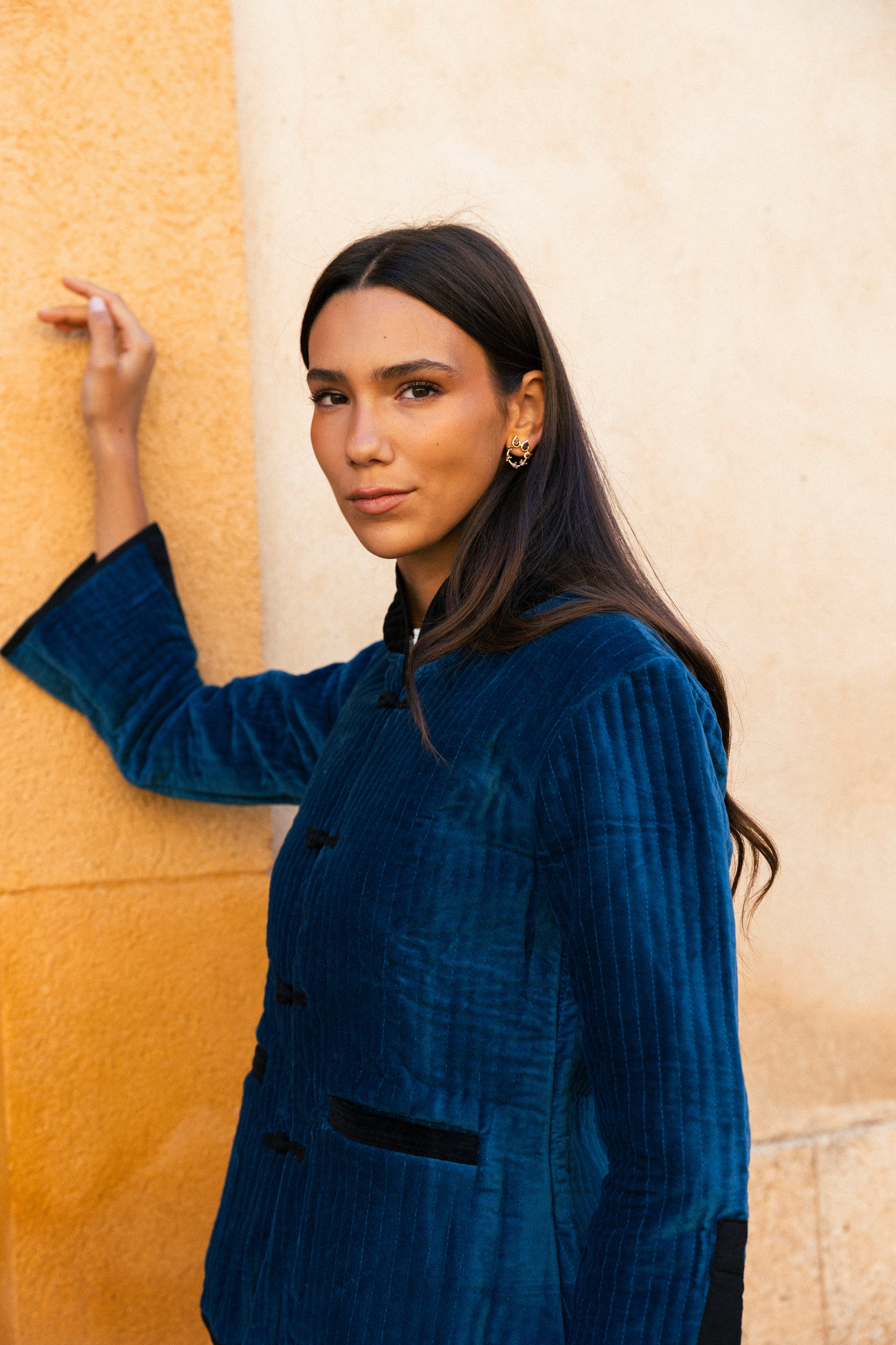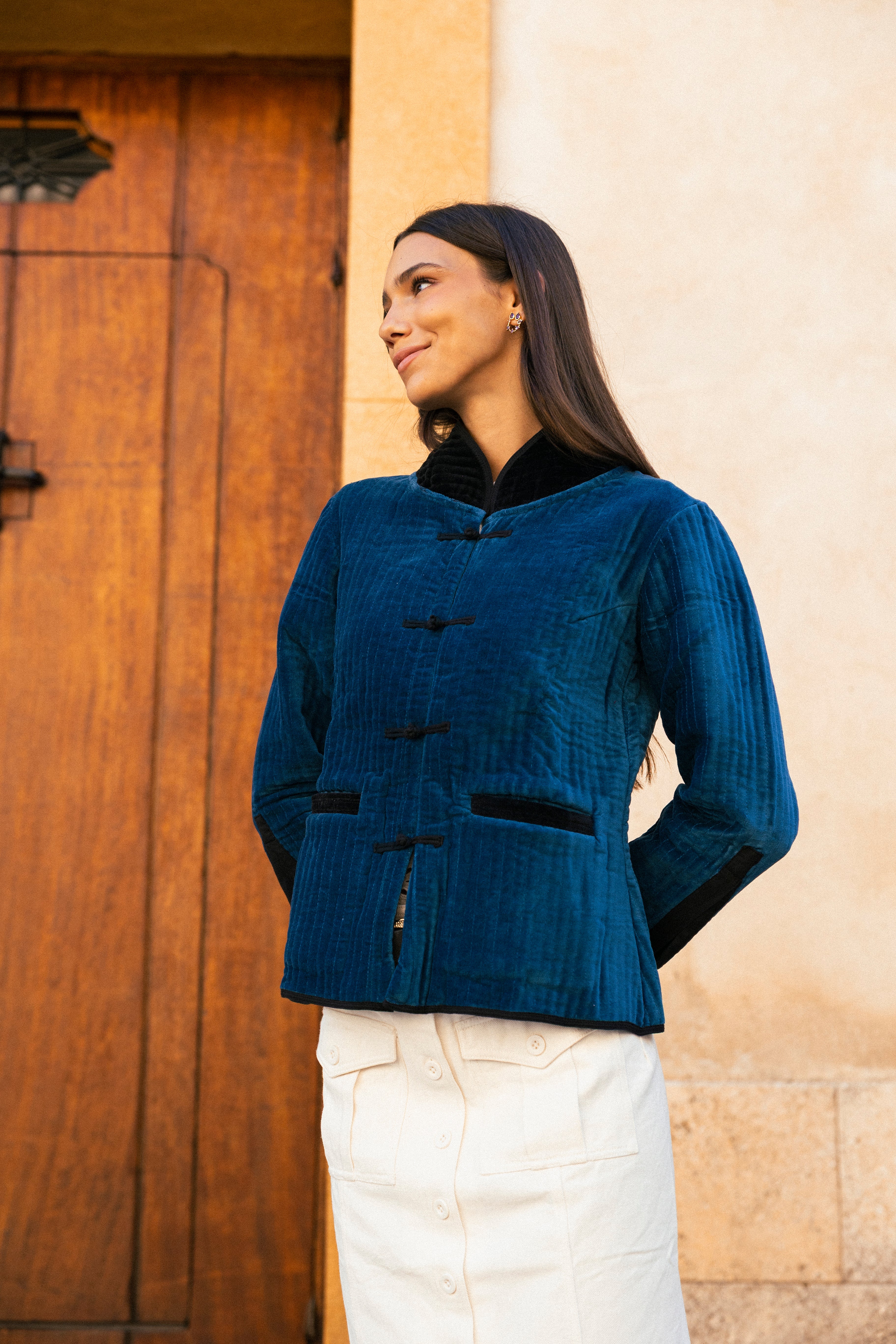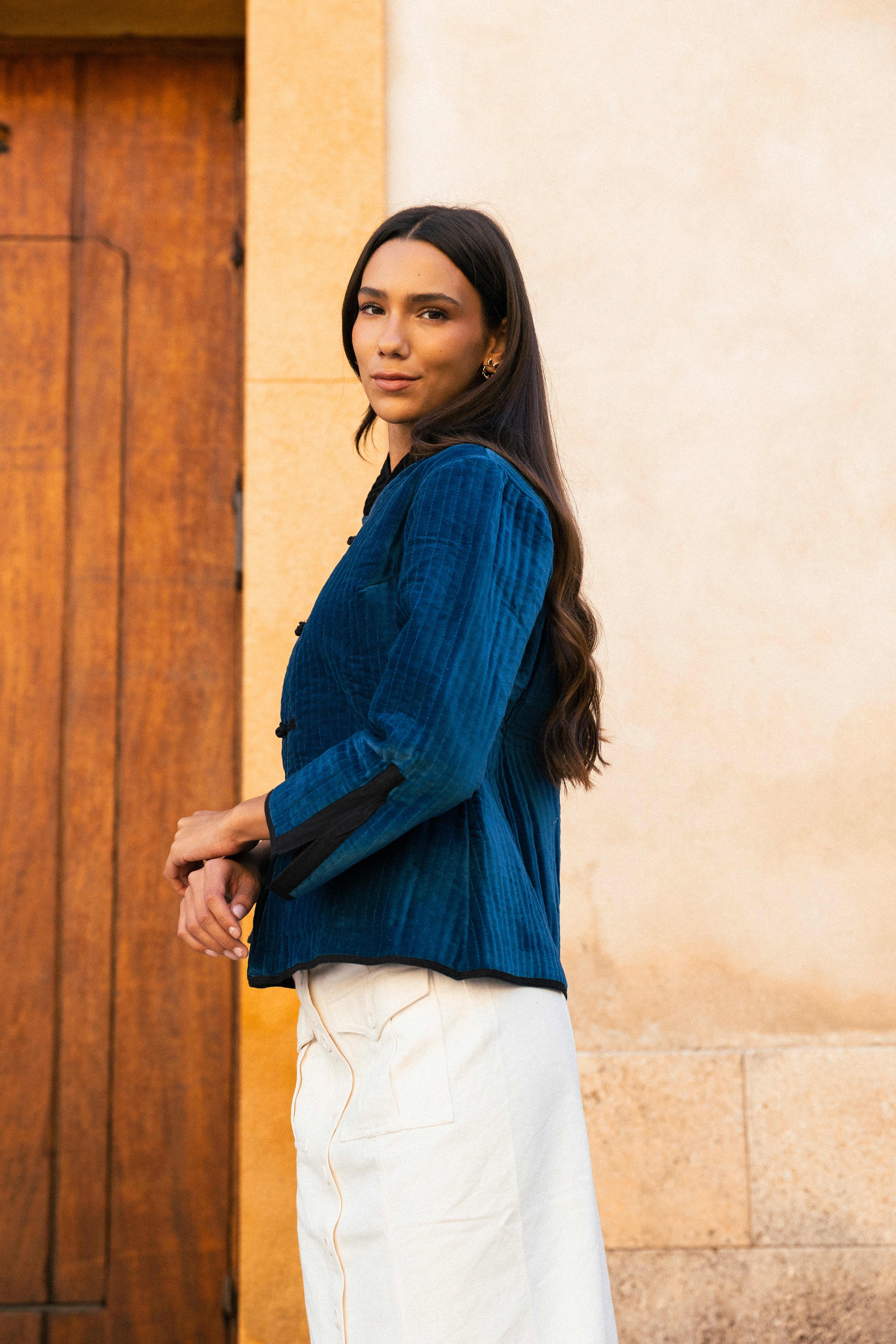 Chaqueta de terciopelo, abotonada por delante. Cuenta con dos bolsillos delanteros inferiores sin cierre.