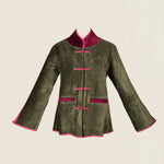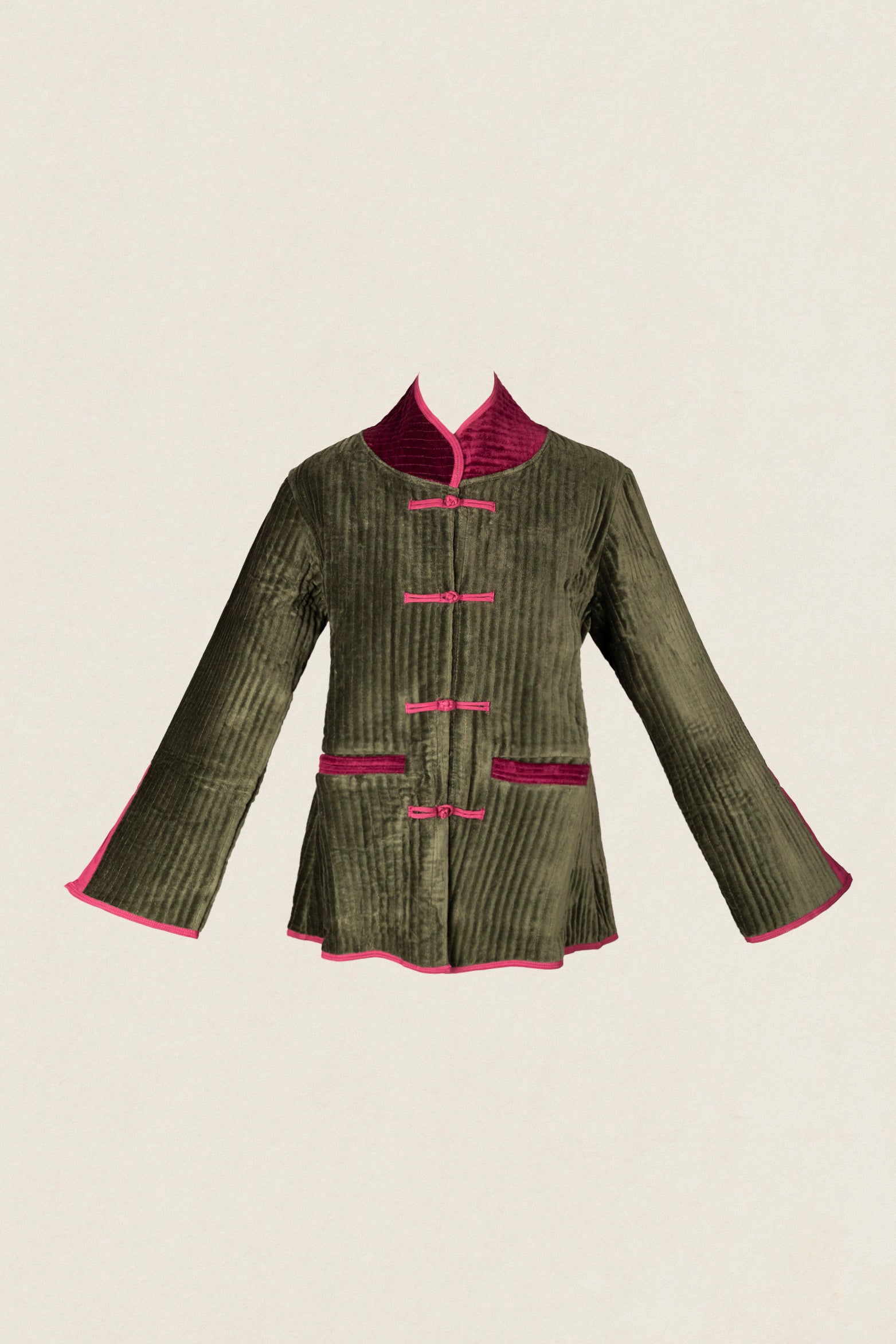 Chaqueta de terciopelo, abotonada por delante. Cuenta con dos bolsillos delanteros inferiores sin cierre.