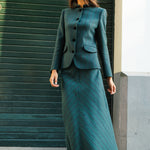 Con un corte estructurado con hombreras, esta prenda realza la silueta con un estilo atemporal. Destaca su cuello con detalle en terciopelo, que aporta un toque sofisticado, y su cierre delantero con botones, que combina funcionalidad y elegancia.